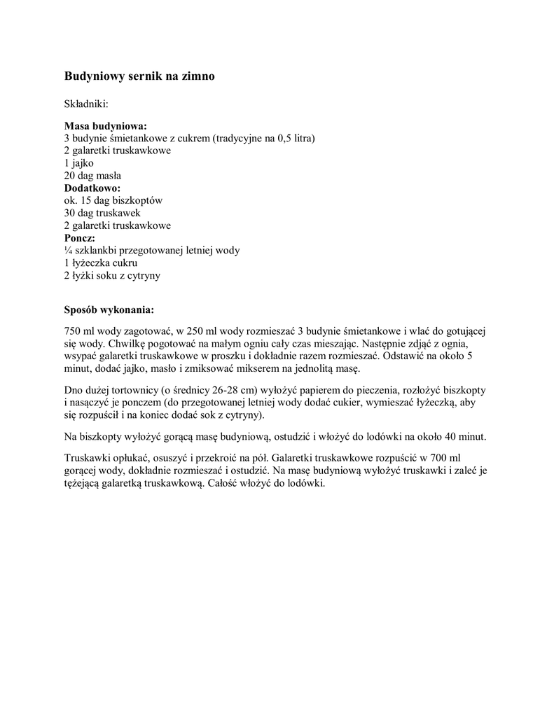 Budyniowy sernik na zimno Składniki: Masa budyniowa: 3 budynie śmietankowe z cukrem (tradycyjne na 0,5 litra) 2 galaretki truskawkowe 1 jajko 20 dag masła Dodatkowo: ok. 15 dag biszkoptów 30 dag truskawek 2 galaretki truskawkowe Poncz: ¼ szklankbi przegotowanej letniej wody 1 łyżeczka cukru 2 łyżki soku z cytryny Sposób wykonania: 750 ml wody zagotować, w 250 ml wody rozmieszać 3 budynie śmietankowe i wlać do gotującej się wody. Chwilkę pogotować na małym ogniu cały czas mieszając. Następnie zdjąć z ognia, wsypać galaretki truskawkowe w proszku i dokładnie razem rozmieszać. Odstawić na około 5 minut, dodać jajko, masło i zmiksować mikserem na jednolitą masę. Dno dużej tortownicy (o średnicy 26-28 cm) wyłożyć papierem do pieczenia, rozłożyć biszkopty i nasączyć je ponczem (do przegotowanej letniej wody dodać cukier, wymieszać łyżeczką, aby się rozpuścił i na koniec dodać sok z cytryny). Na biszkopty wyłożyć gorącą masę budyniową, ostudzić i włożyć do lodówki na około 40 minut. Truskawki opłukać, osuszyć i przekroić na pół. Galaretki truskawkowe rozpuścić w 700 ml gorącej wody, dokładnie rozmieszać i ostudzić. Na masę budyniową wyłożyć truskawki i zaleć je tężejącą galaretką truskawkową. Całość włożyć do lodówki.