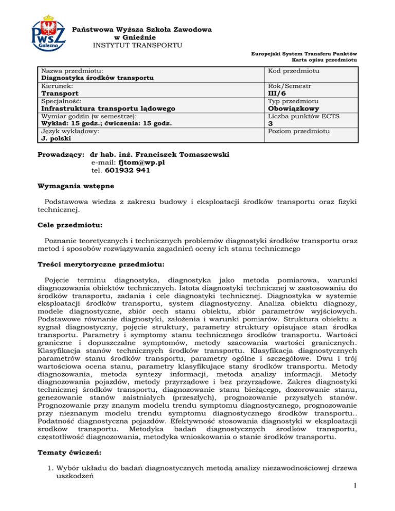 Państwowa Wyższa Szkoła Zawodowa w Gnieźnie INSTYTUT TRANSPORTU Europejski System Transferu Punktów Karta opisu przedmiotu Nazwa przedmiotu: Diagnostyka środków transportu Kierunek: Kod przedmiotu Transport III/6 Specjalność: Typ przedmiotu Infrastruktura transportu lądowego Obowiązkowy Wymiar godzin (w semestrze): Wykład: 15 godz.; ćwiczenia: 15 godz. Język wykładowy: J. polski Liczba punktów ECTS Rok/Semestr 3 Poziom przedmiotu Prowadzący: dr hab. inż. Franciszek Tomaszewski e-mail: [email protected] tel. 601932 941 Wymagania wstępne Podstawowa wiedza z zakresu budowy i eksploatacji środków transportu oraz fizyki technicznej. Cele przedmiotu: Poznanie teoretycznych i technicznych problemów diagnostyki środków transportu oraz metod i sposobów rozwiązywania zagadnień oceny ich stanu technicznego Treści merytoryczne przedmiotu: Pojęcie terminu diagnostyka, diagnostyka jako metoda pomiarowa, warunki diagnozowania obiektów technicznych. Istota diagnostyki technicznej w zastosowaniu do środków transportu, zadania i cele diagnostyki technicznej. Diagnostyka w systemie eksploatacji środków transportu, system diagnostyczny. Analiza obiektu diagnozy, modele diagnostyczne, zbiór cech stanu obiektu, zbiór parametrów wyjściowych. Podstawowe równanie diagnostyki, założenia i warunki pomiarów. Struktura obiektu a sygnał diagnostyczny, pojęcie struktury, parametry struktury opisujące stan środka transportu. Parametry i symptomy stanu technicznego środków transportu. Wartości graniczne i dopuszczalne symptomów, metody szacowania wartości granicznych. Klasyfikacja stanów technicznych środków transportu. Klasyfikacja diagnostycznych parametrów stanu środków transportu, parametry ogólne i szczegółowe. Dwu i trój wartościowa ocena stanu, parametry klasyfikujące stany środków transportu. Metody diagnozowania, metoda syntezy informacji, metoda analizy informacji. Metody diagnozowania pojazdów, metody przyrządowe i bez przyrządowe. Zakres diagnostyki technicznej środków transportu, diagnozowanie stanu bieżącego, dozorowanie stanu, genezowanie stanów zaistniałych (przeszłych), prognozowanie przyszłych stanów. Prognozowanie przy znanym modelu trendu symptomu diagnostycznego, prognozowanie przy nieznanym modelu trendu symptomu diagnostycznego środków transportu.. Podatność diagnostyczna pojazdów. Efektywność stosowania diagnostyki w eksploatacji środków transportu. Metodyka badań diagnostycznych środków transportu, częstotliwość diagnozowania, metodyka wnioskowania o stanie środków transportu. Tematy ćwiczeń: 1. Wybór układu do badań diagnostycznych metodą analizy niezawodnościowej drzewa uszkodzeń 1 2. Badanie zależności pomiędzy parametrami diagnostycznymi a intensywnością uszkodzeń na przykładzie silnika spalinowego. 3. Wybór parametru diagnostycznego współzmienniczego z procesem uszkadzania (odwzorowującego stan niezawodnościowy silnika). 4. Szacowanie wartości granicznej i dopuszczalnej parametru diagnostycznego znanymi metodami oraz analiza porównawcza metod. 5. Wyznaczanie zależności pomiędzy parametrami sygnału wibroakustycznego a luzami wybranych par kinematycznych na przykładzie silnika spalinowego. 6. Wyznaczanie zależności pomiędzy poziomami w pasmach widma tercjowego a luzami wybranych par kinematycznych na przykładzie silnika spalinowego. 7. Wyznaczanie modeli regresyjnych opisujących związek pomiędzy procesem uszkadzania i luzami par kinematycznych a wybranymi symptomami diagnostycznymi. Metody oceny: Test zaliczeniowy – pisemny. Spis zalecanych lektur: 1. Marciniak J., Diagnostyka techniczna kolejowych pojazdów szynowych. WKiŁ, Warszawa 1982. 2. Cempel C., Tomaszewski F., Diagnostyka Maszyn. Zasady ogólne, przykłady zastosowań. Instytut Technologii Eksploatacji, Radom 1992. 3. Żółtowski B., Podstawy diagnostyki maszyn. Wydawnictwo Uczelniane Akademii Techniczno-Rolniczej, Bydgoszcz 1996. 4. Niziński S., Elementy diagnostyki obiektów technicznych. Wydawnictwo Uniwersytetu Warmińsko-Mazurskiego, Olsztyn 2001. 5. Niziński S., Diagnostyka samochodów osobowych i ciężarowych. Dom Wydawniczy Bellona, Warszawa 1999. 6. Żółtowski B., Cempel C., Inżynieria diagnostyki maszyn. Instytut Technologii Eksploatacji, Radom 2004. 2