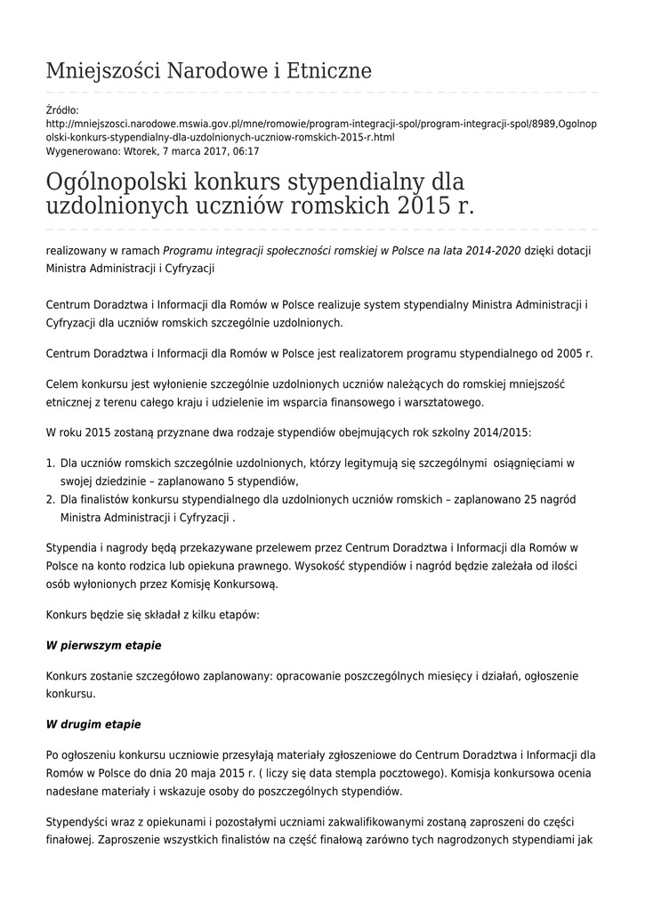 Mniejszości Narodowe i Etniczne Źródło: http://mniejszosci.narodowe.mswia.gov.pl/mne/romowie/program-integracji-spol/program-integracji-spol/8989,Ogolnop olski-konkurs-stypendialny-dla-uzdolnionych-uczniow-romskich-2015-r.html Wygenerowano: Wtorek, 7 marca 2017, 06:17 Ogólnopolski konkurs stypendialny dla uzdolnionych uczniów romskich 2015 r. realizowany w ramach Programu integracji społeczności romskiej w Polsce na lata 2014-2020 dzięki dotacji Ministra Administracji i Cyfryzacji Centrum Doradztwa i Informacji dla Romów w Polsce realizuje system stypendialny Ministra Administracji i Cyfryzacji dla uczniów romskich szczególnie uzdolnionych. Centrum Doradztwa i Informacji dla Romów w Polsce jest realizatorem programu stypendialnego od 2005 r. Celem konkursu jest wyłonienie szczególnie uzdolnionych uczniów należących do romskiej mniejszość etnicznej z terenu całego kraju i udzielenie im wsparcia finansowego i warsztatowego. W roku 2015 zostaną przyznane dwa rodzaje stypendiów obejmujących rok szkolny 2014/2015: 1. Dla uczniów romskich szczególnie uzdolnionych, którzy legitymują się szczególnymi osiągnięciami w swojej dziedzinie – zaplanowano 5 stypendiów, 2. Dla finalistów konkursu stypendialnego dla uzdolnionych uczniów romskich – zaplanowano 25 nagród Ministra Administracji i Cyfryzacji . Stypendia i nagrody będą przekazywane przelewem przez Centrum Doradztwa i Informacji dla Romów w Polsce na konto rodzica lub opiekuna prawnego. Wysokość stypendiów i nagród będzie zależała od ilości osób wyłonionych przez Komisję Konkursową. Konkurs będzie się składał z kilku etapów: W pierwszym etapie Konkurs zostanie szczegółowo zaplanowany: opracowanie poszczególnych miesięcy i działań, ogłoszenie konkursu. W drugim etapie Po ogłoszeniu konkursu uczniowie przesyłają materiały zgłoszeniowe do Centrum Doradztwa i Informacji dla Romów w Polsce do dnia 20 maja 2015 r. ( liczy się data stempla pocztowego). Komisja konkursowa ocenia nadesłane materiały i wskazuje osoby do poszczególnych stypendiów. Stypendyści wraz z opiekunami i pozostałymi uczniami zakwalifikowanymi zostaną zaproszeni do części finałowej. Zaproszenie wszystkich finalistów na część finałową zarówno tych nagrodzonych stypendiami jak i tych zakwalifikowanych do finału jest istotne z uwagi na ich uczestnictwo w planowanych warsztatach artystycznych oraz konieczność obserwacji ich postępów. W trzecim etapie Odbędzie się spotkanie finałowe złożone z warsztatów, przesłuchań konkursowych i koncertu finałowego: 28 lipca wieczorem: do Łodzi przyjadą stypendyści i finaliści w kategoriach artystycznych wraz z opiekunami oraz organizatorzy. Wszyscy zostaną zakwaterowani w Hotelu Boss ul. Tatrzańska 11 w Łodzi. Po kolacji, odbędzie się spotkanie organizacyjne z finalistami i opiekunami. Od 29 lipca do 31lipca: Po śniadaniu uczestnicy konkursu będą przewożeni do Bałuckiego Ośrodka Kultury w Łodzi i Miejskiego Ośrodka Kultury w Konstantynowie Łódzkim ( w zależności od rodzaju warsztatów) gdzie w godzinach 10.00 – 17.00 przeprowadzone zostaną warsztaty: ● instrumentalne z muzykami jazzowymi oraz muzykami tradycyjnymi, ● wokalne ● taneczne z instruktorami tradycyjnymi ● plastyczne w wykładowcą z ASP w Łodzi W godzinach wieczornych zaplanowano atrakcje dla dzieci w postaci zwiedzania miasta, spotkania z przedstawicielami różnych mniejszości w Łodzi, wyjście do kina itp. Wieczorem, 31 lipca do hotelu przyjadą pozostali finaliści z opiekunami w kategorii sport i pozostałych. 1 sierpnia: Po śniadaniu uczestnicy konkursu przejadą do Bałuckiego Ośrodka Kultury w Łodzi gdzie odbędą się próby akustyczne a po obiedzie rozpocznie się część konkursowa. Po wysłuchaniu wszystkich uczestników zapoznaniu się z pracami plastycznymi komisja, złożona z 6 osób uda się na naradę i przyzna nagrody (o różnej wartości) Ministra Administracji i Cyfryzacji za osiągnięcia w swoich kategoriach w 2015 r. 2 sierpnia: Po śniadaniu odbędą się uroczystości rocznicowe w miejscu upamiętnienia zagłady Romów przed tablicą pamiątkową getta łódzkiego przy ul. Wojska Polskiego 84. Po obiedzie w Pałacu Poznańskiego w Łodzi rozpoczną się próby i koncert galowy finalistów (program zostanie przygotowany w czasie warsztatów). W czasie koncertu zostaną ogłoszone wyniki konkursu i wręczone dyplomy zarówno wcześniej wybranym stypendystom jak również wszystkim nagrodzonym finalistom. Po zakończonym koncercie uczestnicy konkursu oraz zaproszeni goście udadzą się na uroczystą kolację. Informacje o nagrodzonych finalistach będą umieszczone na stronie stowarzyszenia i Ministerstwa Administracji i Cyfryzacji. Do wszystkich laureatów zostanie wysłany dodatkowy upominek w postaci zarejestrowanego przebiegu konkursu stypendialnego na płycie DVD. Przekazanie nagród odbędzie się w następujący sposób: Centrum Doradztwa i Informacji dla Romów w Polsce przekaże przelewem jednorazową nagrodę Ministra Administracji i Cyfryzacji na wskazane konto rodzica lub opiekuna prawnego, bez konieczności rozliczania się fakturami/rachunkami W czwartym etapie Do końca grudnia zostanie sporządzony raport końcowy z realizacji Ogólnopolskiego konkursu stypendialnego dla uzdolnionych uczniów romskich. Sprawozdanie wraz z załącznikami zostanie wysłane w terminie zawartym w umowie. Wszystkich chętnych zapraszamy do udziału w konkursie! Karta zgłoszeniowa Regulamin konkursu Wstecz Drukuj Generuj PDF Powiadom znajomego