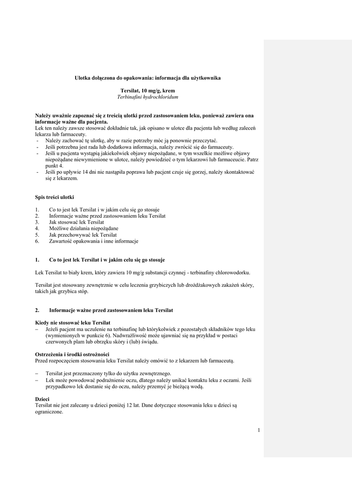 Ulotka dołączona do opakowania: informacja dla użytkownika Tersilat, 10 mg/g, krem Terbinafini hydrochloridum Należy uważnie zapoznać się z treścią ulotki przed zastosowaniem leku, ponieważ zawiera ona informacje ważne dla pacjenta. Lek ten należy zawsze stosować dokładnie tak, jak opisano w ulotce dla pacjenta lub według zaleceń lekarza lub farmaceuty. - Należy zachować tę ulotkę, aby w razie potrzeby móc ją ponownie przeczytać. - Jeśli potrzebna jest rada lub dodatkowa informacja, należy zwrócić się do farmaceuty. - Jeśli u pacjenta wystąpią jakiekolwiek objawy niepożądane, w tym wszelkie możliwe objawy niepożądane niewymienione w ulotce, należy powiedzieć o tym lekarzowi lub farmaceucie. Patrz punkt 4. - Jeśli po upływie 14 dni nie nastąpiła poprawa lub pacjent czuje się gorzej, należy skontaktować się z lekarzem. Spis treści ulotki 1. 2. 3. 4. 5. 6. Co to jest lek Tersilat i w jakim celu się go stosuje Informacje ważne przed zastosowaniem leku Tersilat Jak stosować lek Tersilat Możliwe działania niepożądane Jak przechowywać lek Tersilat Zawartość opakowania i inne informacje 1. Co to jest lek Tersilat i w jakim celu się go stosuje Lek Tersilat to biały krem, który zawiera 10 mg/g substancji czynnej - terbinafiny chlorowodorku. Tersilat jest stosowany zewnętrznie w celu leczenia grzybiczych lub drożdżakowych zakażeń skóry, takich jak grzybica stóp. 2. Informacje ważne przed zastosowaniem leku Tersilat Kiedy nie stosować leku Tersilat Jeżeli pacjent ma uczulenie na terbinafinę lub którykolwiek z pozostałych składników tego leku (wymienionych w punkcie 6). Nadwrażliwość może ujawniać się na przykład w postaci czerwonych plam lub obrzęku skóry i (lub) świądu. Ostrzeżenia i środki ostrożności Przed rozpoczęciem stosowania leku Tersilat należy omówić to z lekarzem lub farmaceutą. Tersilat jest przeznaczony tylko do użytku zewnętrznego. Lek może powodować podrażnienie oczu, dlatego należy unikać kontaktu leku z oczami. Jeśli przypadkowo lek dostanie się do oczu, należy przemyć je bieżącą wodą. Dzieci Tersilat nie jest zalecany u dzieci poniżej 12 lat. Dane dotyczące stosowania leku u dzieci są ograniczone. 1 Lek Tersilat a inne leki Brak danych świadczących o tym, że krem Tersilat wywiera negatywny wpływ na inne leki. Należy powiedzieć lekarzowi lub farmaceucie o wszystkich lekach stosowanych przez pacjenta obecnie lub ostatnio, a także o lekach, które pacjent planuje stosować. Ciąża i karmienie piersią Ciąża Nie należy stosować kremu Tersilat w czasie ciąży, jeśli nie jest to bezwzględnie konieczne. Karmienie piersią Nie należy stosować leku Tersilat w czasie karmienia piersią, gdyż terbinafina przenika do mleka ludzkiego. Niemowlęta nie powinny mieć dostępu do skóry leczonej tym lekiem, w tym skóry piersi. Jeśli pacjentka jest w ciąży lub karmi piersią, przypuszcza, że może być w ciąży lub gdy planuje mieć dziecko, powinna poradzić się lekarza lub farmaceuty przed zastosowaniem tego leku. Prowadzenie pojazdów i obsługiwanie maszyn Lek nie ma wpływu na zdolność prowadzenia pojazdów i obsługiwania maszyn. Lek Tersilat zawiera alkohol cetostearylowy. Alkohol cetostearylowy może powodować miejscowe reakcje skórne (na przykład kontaktowe zapalenie skóry). Jak stosować lek Tersilat 3. Sposób podawania Ten lek należy zawsze stosować dokładnie tak, jak opisano w ulotce dla pacjenta lub według zaleceń lekarza lub farmaceuty. W razie wątpliwości należy zwrócić się do lekarza lub farmaceuty. Tuba jest zamknięta szczelnie przy pomocy aluminiowego zamknięcia. Zamknięcie może zostać przerwane przez lekkie naciśnięcie odwróconą zakrętką. Do stosowania tylko na skórę. Zanim zastosuje się krem należy dokładnie umyć i osuszyć skórę. Należy nanieść cienką warstwę kremu na zakażone miejsca na skórze i nieco wokół nich. Rozetrzeć delikatnie krem. Jeżeli krem nie jest przeznaczony do leczenia rąk, po nałożeniu kremu należy dokładnie umyć ręce. Czas trwania leczenia i częstość stosowania Dorośli i dzieci powyżej 12 lat: Grzybica stóp: Raz dziennie przez tydzień Grzybica wywołana przez dermatofity (grzybica fałdów skórnych, grzybica skóry gładkiej): Raz dziennie przez tydzień Grzybicze zakażenia skóry (kandydoza skórna): Raz dziennie przez 1-2 tygodnie 2 Łupież pstry: Jeden do dwóch razy dziennie przez 2 tygodnie Na ogół poprawa objawów jest widoczna w ciągu kilku dni. Nieregularne stosowanie lub przedwczesne przerwanie leczenia zwiększa prawdopodobieństwo nawrotu objawów. Jeżeli poprawa objawów nie nastąpi po dwóch tygodniach leczenia, należy skonsultować się z lekarzem lub farmaceutą. Pacjenci w podeszłym wieku Brak danych świadczących o konieczności zmiany dawkowania u pacjentów w podeszłym wieku lub możliwości wystąpienia innych działań niepożądanych niż obserwowane u młodszych pacjentów. Stosowanie u dzieci Ze względu na ograniczoną ilość dostępnych informacji dotyczących stosowania kremu Tersilat u dzieci poniżej 12 lat, nie jest zalecane stosowanie tego leku w tej grupie wiekowej. Zastosowanie większej niż zalecana dawki leku Tersilat Nie są znane przypadki przedawkowania leku Tersilat podczas stosowania zewnętrznego. W przypadku wszelkich wątpliwości dotyczących stosowania należy skontaktować się z lekarzem lub farmaceutą. W przypadku nieumyślnego połknięcia kremu Tersilat, na przykład przez dziecko, spodziewane działania niepożądane będą podobne do tych, które występują po przedawkowaniu terbinafiny w postaci tabletek (takie objawy mogą obejmować ból głowy, nudności, zawroty głowy i ból brzucha). W tym przypadku należy skontaktować się z lekarzem lub udać się do szpitalnej izby przyjęć. W razie przypadkowego kontaktu kremu z oczami, należy przemyć je dokładnie czystą, bieżącą wodą. Pomini
