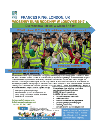 FRANCES KING, LONDON, UK Dla rodziców i dzieci w wieku 8-15 lat W 2017 roku od 20.03 do 21.04 - minimum tydzień, maksimum 5 Dorośli:£360 tygodniowo NAUKA: Dzieci: £300 tygodniowo Nie musisz rozstawać się z dziećmi nawet wtedy gdy powinieneś popracować nad językiem. Dziecku też przyda się krótka wiosenna przerwa i nauka, bo przecież czeka go egzamin z angielskiego. Skorzystacie więc wszyscy. Szkoła Frances King dobrze wie, że chcecie popołudniami poznawać Londyn, tak wiec zajęcia lekcyjne dla rodziców i dzieci zorganizowane są tak, abyście mogli spędzić ze sobą wiele czasu. Możecie też skorzystać ze szkolnych podpowiedzi ciekawych popołudni i wieczorów. Szkoła zabezpiecza także zakwaterowanie. To od was zależy gdzie chcecie mieszkać – są wiec gościnne rodziny, apartamenty, i hotele. Ważne tylko aby z decyzją o kursie nie zwlekać, miejsca zawsze szybko znikają. Kurs odbywa się w szkole w Londynie w Należy doliczyć koszt wybranego zakwaterowania np. od £143 tygodniowo od osoby, pokój 2 osobowy w rodzinie, śniadanie Pełne cenniki na życzenie Informacje/rezerwacje [email protected] tel/fax 22 8471487 przepięknej dzielnicy Kensington DZIECI: 20 lekcji tygodniowo DOROŚLI: 20 lekcji tygodniowo wszystkie poziomy nauczania pakiet powitalny możliwe dodatkowe lekcje prywatne propozycje zajęć pozalekcyjnych rodzinny czas wolny zakwaterowanie zgodnie z życzeniem Uwaga: w tygodniu zaczynającym się 10 kwietnia oraz 17 kwietnia tylko 16 lekcji ( 14 i 17 kwietnia 2017 to dni wolne od pracy)