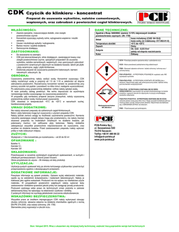 CDK Czyścik do klinkieru - koncentrat Preparat do usuwania wykwitów, nalotów cementowych, wapiennych, oraz zabrudzeń z powierzchni cegieł klinkierowych. WŁAŚCIWOŚCI: Zawiera specjalne, rozpuszczające dodatki, oraz związki powierzchniowo czynne Koncentrat czyszczący wykwity solne, wyługowania wapienne i resztki cementu. Usuwa i neutralizuje wykwity i wyługowania. Bardzo mocne i szybkie działanie. Samoczynnie działający. ZASTOSOWANIE: Do stosowania na zewnątrz. CDK jest skoncentrowanym, silnie działającym, zawierającym kwasy oraz związki powierzchniowo czynne, specjalnym preparatem do usuwania wykwitów, nalotów cementowych, wapiennych, oraz uporczywych zabrudzeń z powierzchni ceramicznych odpornych na działanie kwasów, takich jak płytki i płyty ceramiczne, cegły i płytki klinkierowe. Doskonały preparat do czyszczenia powierzchni betonowych, kamieni naturalnych, sztucznych, itp. DANE TECHNICZNE: Zgodnie z Rozp. 648/2004: zawiera: 5-15% niejonowych środków powierzchniowo czynnych. UN: 1760 kwas mrówkowy (CAS: 64-18-6) Skład kwas solny (nr indeksowy: 017-002-01-X) Temperatura obróbki +5˚C do +25˚C Zapach Ostry Ok. 0,02 - 0,05 l/1m2 Zużycie zależy od stopnia rozcieńczenia Kolor Żółtawy H314 - Powoduje poważne oparzenia skóry i uszkodzenia oczu H335 - Może powodować podrażnienie dróg oddechowych P280 - Stosować rękawice ochronne / odzież ochronną / ochronę oczu / ochronę twarzy. P301+P330+P331 – W PRZYPADKU POŁKNIĘCIA: wypłukać usta. NIE wywoływać wymiotów OBRÓBKA: Czyszczoną powierzchnię należy zwilżyć wodą. Koncentrat czyszczący CDK należy rozcieńczyć wodą w proporcji od 1:5 do 1:10 w zależności od stopnia zabrudzenia powierzchni. Rozcieńczony koncentrat nanieść na powierzchnię przy pomocy szczotki lub pędzla i pozostawić na kilka minut, następnie wyszczotkować. Po zakończeniu pracy powierzchnię dokładnie i obficie należy spłukać wodą. W razie potrzeby zabieg powtórzyć. Nie wolno dopuszczać do wyschnięcia naniesionego środka czyszczącego na czyszczonej powierzchni. W przypadku gdy naniesiony preparat zaczyna przesychać, należy czyszczoną powierzchnię zwilżyć wodą i kontynuować czyszczenie. CDK stosować w temperaturach +5˚C do +25˚C w warunkach suchej, bezdeszczowej pogody. UWAGI DODATKOWE: Nie należy stosować preparatu do szkliwionych cegieł klinkierowych. Beton i płyty betonowe mogą być czyszczone z użyciem preparatu CDK. Należy jednak zwrócić uwagę na możliwość uszorstnienia powierzchni. Kamienie naturalne zawierające związki żelaza mogą ulec przebarwieniu, nie należy również stosować preparatu na materiałach wrażliwych na działanie kwasów, jak polerowany marmur, lub szlifowane płyty betonowe. Należy dokładnie zabezpieczyć wszystkie powierzchnie nieprzeznaczone do czyszczenia, oraz wrażliwe na działanie kwasów. Przed zastosowaniem preparatu należy wykonać próbę w mało widocznym miejscu. ZUŻYCIE: Wydajność z 1 litra koncentratu po rozcieńczeniu – od 20 do 50 m2. OPAKOWANIE : P303+P361+P353 – W PRZYPADKU KONTAKTU ZE SKÓRĄ (lub z włosami): Natychmiast zdjąć całą zanieczyszczoną odzież. Spłukać skórę pod strumieniem wody/prysznicem P304+P340 - W PRZYPADKU DOSTANIA SIĘ DO DRÓG ODDECHOWYCH: wyprowadzić lub wynieść poszkodowanego na świeże powietrze i zapewnić warunki do odpoczynku w pozycji umożliwiającej swobodne oddychanie Niebezpieczeństwo WE 266-043-4 P305+P351+P338+P310 - W PRZYPADKU DOSTANIA SIĘ DO OCZU: ostrożnie płukać wodą przez kilka minut. Wyjąć soczewki kontaktowe jeśli są i można je łatwo usunąć. Kontynuować płukanie. Natychmiast skontaktować się z OŚRODKIEM ZATRUĆ lub lekarzem. P405 – Przechowywać pod zamknięciem. PCB-Polska Sp.j. ul. Szczawiowa 53D 70-010 Szczecin Tel/fax +48 91 488 88 22 [email protected] www.pcb-polska.pl Butelka 1l, Kanister 5 l, Kanister 30l SKŁADOWANIE: Przechowywać w szczelnie zamkniętych oryginalnych opakowaniach, w suchych i chłodnych pomieszczeniach. Chronić przed mrozem. Okres przydatności do użycia – 36 miesięcy od daty produkcji. UTYLIZACJA: Utylizacja pustych opakowań leży po stronie końcowego użytkownika i powinna być przeprowadzona zgodnie z obowiązującymi przepisami. DODATKOWE INFORMACJE: Powyższe informacje są opisem produktu. Opisane wyżej właściwości materiału oparte są na wieloletnim doświadczeniu i badaniach laboratoryjnych. Należy je traktować jako ogólne wskazówki. Producent nie ma wpływu na niewłaściwe użycie materiału. W przypadkach powierzchni wątpliwych należy wykonać testy zastosowania i dokładnie sprawdzić jakość próby lub zasięgnąć porady producenta. Producent zastrzega sobie prawo do technicznych zmian produktu w zakresie deklarowanej klasy nie wpływając na właściwości użytkowe i obróbkę. Z podanych informacji nie wynikają jakiekolwiek roszczenia odszkodowawcze. WSKAZÓWKI BEZPIECZEŃSTWA: Wszystkie prace ze środkiem impregnującym CDK należy wykonywać stosując okulary ochronne, rękawice odporne na działanie chemikaliów zgodnych z normą EN-PN 374:2005, oraz odzież ochronną. UN: 1760. Stanowiska pracy wyposażyć w płuczki oczu. Stan: listopad 2015. Wraz z ukazaniem się niniejszej karty technicznej, ważność tracą poprzednie wersje kart technicznych