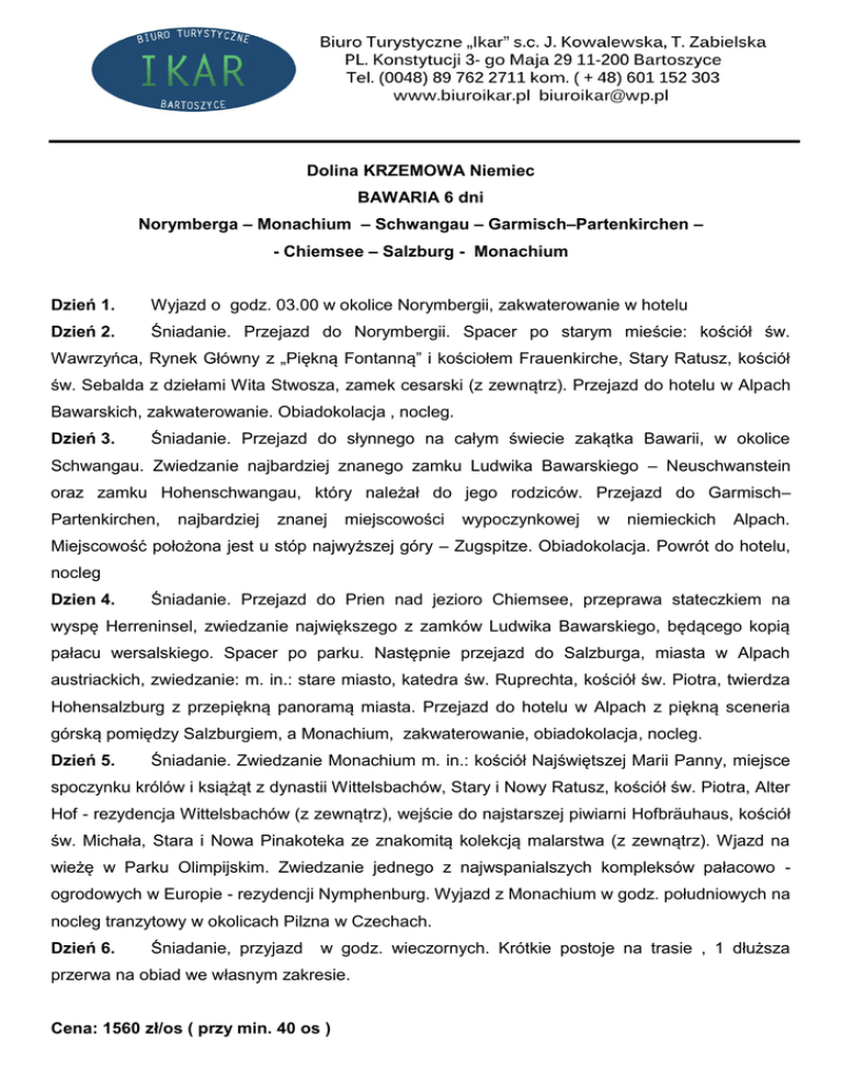 Dolina KRZEMOWA Niemiec BAWARIA 6 dni Norymberga – Monachium – Schwangau – Garmisch–Partenkirchen – - Chiemsee – Salzburg - Monachium Dzień 1. Wyjazd o godz. 03.00 w okolice Norymbergii, zakwaterowanie w hotelu Dzień 2. Śniadanie. Przejazd do Norymbergii. Spacer po starym mieście: kościół św. Wawrzyńca, Rynek Główny z „Piękną Fontanną” i kościołem Frauenkirche, Stary Ratusz, kościół św. Sebalda z dziełami Wita Stwosza, zamek cesarski (z zewnątrz). Przejazd do hotelu w Alpach Bawarskich, zakwaterowanie. Obiadokolacja , nocleg. Dzień 3. Śniadanie. Przejazd do słynnego na całym świecie zakątka Bawarii, w okolice Schwangau. Zwiedzanie najbardziej znanego zamku Ludwika Bawarskiego – Neuschwanstein oraz zamku Hohenschwangau, który należał do jego rodziców. Przejazd do Garmisch– Partenkirchen, najbardziej znanej miejscowości wypoczynkowej w niemieckich Alpach. Miejscowość położona jest u stóp najwyższej góry – Zugspitze. Obiadokolacja. Powrót do hotelu, nocleg Dzien 4. Śniadanie. Przejazd do Prien nad jezioro Chiemsee, przeprawa stateczkiem na wyspę Herreninsel, zwiedzanie największego z zamków Ludwika Bawarskiego, będącego kopią pałacu wersalskiego. Spacer po parku. Następnie przejazd do Salzburga, miasta w Alpach austriackich, zwiedzanie: m. in.: stare miasto, katedra św. Ruprechta, kościół św. Piotra, twierdza Hohensalzburg z przepiękną panoramą miasta. Przejazd do hotelu w Alpach z piękną sceneria górską pomiędzy Salzburgiem, a Monachium, zakwaterowanie, obiadokolacja, nocleg. Dzień 5. Śniadanie. Zwiedzanie Monachium m. in.: kościół Najświętszej Marii Panny, miejsce spoczynku królów i książąt z dynastii Wittelsbachów, Stary i Nowy Ratusz, kościół św. Piotra, Alter Hof - rezydencja Wittelsbachów (z zewnątrz), wejście do najstarszej piwiarni Hofbräuhaus, kościół św. Michała, Stara i Nowa Pinakoteka ze znakomitą kolekcją malarstwa (z zewnątrz). Wjazd na wieżę w Parku Olimpijskim. Zwiedzanie jednego z najwspanialszych kompleksów pałacowo ogrodowych w Europie - rezydencji Nymphenburg. Wyjazd z Monachium w godz. południowych na nocleg tranzytowy w okolicach Pilzna w Czechach. Dzień 6. Śniadanie, przyjazd w godz. wieczornych. Krótkie postoje na trasie , 1 dłuższa przerwa na obiad we własnym zakresie. Cena: 1560 zł/os ( przy min. 40 os ) Cena obejmuje: Przejazd komfortowym, klimatyzowanym autokarem , 5 noclegi w hotelach**/***, w pokojach 2 – osobowych z łazienką , wyżywienie (5 śniadania, 5 obiadokolacji), program turystyczny, opiekę pilota – przewodnika , ubezpieczenie Cena nie obejmuje: Biletów wstępu do zwiedzanych obiektów tj.: Zamek Neuschwanstein: 12,00 EUR Zamek Hohenschwangau: 11,00 EUR Busik zamkowy: 2,00 EUR Zamek Herrenchiemsee: 8,00 EUR Rejs po Jeziorze Chiemsee: 8,00 EUR Twierdza Hohensalzburg – 12,00 EUR, Wieża Olimpijska w Monachium: 4,00 EUR DOPŁATY: Dopłata do pok. 1-osobowego: 540 zł