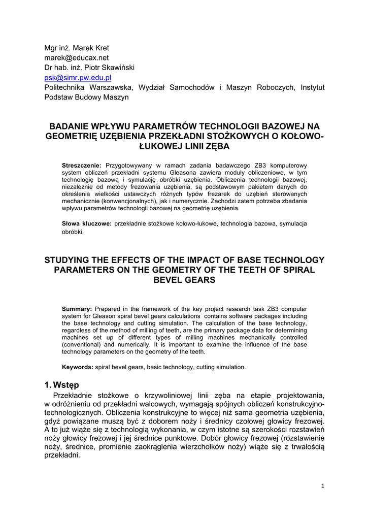 Mgr inż. Marek Kret [email protected] Dr hab. inż. Piotr Skawiński [email protected] Politechnika Warszawska, Wydział Samochodów i Maszyn Roboczych, Instytut Podstaw Budowy Maszyn BADANIE WPŁYWU PARAMETRÓW TECHNOLOGII BAZOWEJ NA GEOMETRIĘ UZĘBIENIA PRZEKŁADNI STOŻKOWYCH O KOŁOWOŁUKOWEJ LINII ZĘBA Streszczenie: Przygotowywany w ramach zadania badawczego ZB3 komputerowy system obliczeń przekładni systemu Gleasona zawiera moduły obliczeniowe, w tym technologię bazową i symulację obróbki uzębienia. Obliczenia technologii bazowej, niezależnie od metody frezowania uzębienia, są podstawowym pakietem danych do określenia wielkości ustawczych różnych typów frezarek do uzębień sterowanych mechanicznie (konwencjonalnych), jak i numerycznie. Zachodzi zatem potrzeba zbadania wpływu parametrów technologii bazowej na geometrię uzębienia. Słowa kluczowe: przekładnie stożkowe kołowo-łukowe, technologia bazowa, symulacja obróbki. STUDYING THE EFFECTS OF THE IMPACT OF BASE TECHNOLOGY PARAMETERS ON THE GEOMETRY OF THE TEETH OF SPIRAL BEVEL GEARS Summary: Prepared in the framework of the key project research task ZB3 computer system for Gleason spiral bevel gears calculations contains software packages including the base technology and cutting simulation. The calculation of the base technology, regardless of the method of milling of teeth, are the primary package data for determining machines set up of different types of milling machines mechanically controlled (conventional) and numerically. It is important to examine the influence of the base technology parameters on the geometry of the teeth. Keywords: spiral bevel gears, basic technology, cutting simulation. 1. Wstęp Przekładnie stożkowe o krzywoliniowej linii zęba na etapie projektowania, w odróżnieniu od przekładni walcowych, wymagają spójnych obliczeń konstrukcyjnotechnologicznych. Obliczenia konstrukcyjne to więcej niż sama geometria uzębienia, gdyż powiązane muszą być z doborem noży i średnicy czołowej głowicy frezowej. A to już wiąże się z technologią wykonania, w czym istotne są szerokości rozstawień noży głowicy frezowej i jej średnice punktowe. Dobór głowicy frezowej (rozstawienie noży, średnice, promienie zaokrąglenia wierzchołków noży) wiąże się z trwałością przekładni. 1 Dlatego też ta faza obliczeń musi być powiązana z obliczeniami wytrzymałościowymi weryfikującymi naprężenia w stopie zęba i naciski powierzchniowe W przypadku niespełnienia warunków konieczne jest ponowne wykonanie obliczeń doboru głowicy frezowej, a niekiedy również geometrii. Kolejny krok to obliczenia tzw. technologii bazowej będącej w gruncie rzeczy zdefiniowaniem ustawienia wirtualnej obrabiarki mogącej realizować obróbkę koła i zębnika. Wyniki obliczeń technologii bazowej umożliwiają przejście na konkretne modele frezarek do uzębień niezależnie czy są to maszyny sterowane mechanicznie czy numerycznie. Danymi do obliczeń technologii bazowej są w zasadzie rezultaty obliczeń geometrii uzębienia i luki międzyzębnej (głowica frezowa i noże) oraz wielkości jak kąty zarysów noży do obróbki zgrubnej i wykończeniowej, współczynnik długości śladu współpracy i inne zalecane współczynniki poprawkowe pozwalające poprawnie uzyskać poprawne obliczenia technologiczne. Na przykładzie metody SGM (Spiral Generated Modified Roll) firmy Gleason zostanie pokazane, iż przy prawidłowych danych wejściowych i zalecanych współczynnikach poprawkowych, rezultaty technologii bazowej nie są akceptowalne z punktu widzenia możliwości ustawczych wybranej do obróbki frezarki. 2. Obliczenia technologii bazowej Obliczenia konstrukcyjno-technologiczne prowadzone są we własnym systemie komputerowym KONTEPS zawierającym również moduł do symulacji obróbki uzębienia generujący modele bryłowe koła i zębnika. Istnienie tego modułu ułatwia proces projektowania technologicznego, gdyż umożliwia on weryfikację poprawności obliczeń nie tylko technologicznych, ale i geometrycznych. Właśnie obserwowanie rezultatów symulacji, a w szczególności uzyskanych wyników technologii bazowej wymusiło konieczność głębszej analizy danych wejściowych. Jedną z danych wejściowych jest sumaryczny współczynnik beczkowatości Kp wpływający na szerokość śladu współpracy zębów, który zgodnie z zaleceniem firmy Gleason należy przyjmować z przedziału 0 - 8. Im węższy ma być ślad po sprawdzeniu na maszynie kontrolnej w procesie lokalizacji śladu współpracy, tym w kolejnych obliczeniach należy przyjmować większy współczynnik Kp. Zwiększanie współczynnika Kp mimo, że jest on z zalecanego przedziału może prowadzić do uzyskania wyników technologii bazowej niemożliwych do ustawienia na konkretnej frezarce. Innymi słowy, niektóre wielkości ustawcze mogą przekraczać zakresy nastaw frezarki np. ustawienia promieniowego, przesunięcia hipoidalnego, ustawienia poosiowego, itp. W celu analizy wpływu sumarycznego współczynnika beczkowatości Kp, zbudowano aplikację w Excelu, która dla różnych wartości Kp przy stałych średnicach punktowych głowicy do obróbki zębnika i stałym współczynniku długości śladu współpracy, oblicza wielkości ustawcze technologii bazowej. Algorytm obliczeń technologii bazowej bazuje na formułach programu KONTEPS, zaś danymi wejściowymi są rezultaty obliczeń konstrukcyjno-technologicznych z programu KONTEPS. Wykonując wiele obliczeń przekładni o różnych przełożeniach stwierdzono, że niemal w każdej obliczanej przekładni przy różnych wartościach Kp otrzymuje się rezultaty technologii bazowej w nieakceptowanych zakresach ustawczych. W niniejszym artykule na przykładzie przekładni o przełożeniu 33:34 dokonano analizy wpływu współczynnika Kp. Dane wejściowe geometryczne do aplikacji Excel będące rezultatem obliczeń programu KONTEPS pokazano w tablicy 1, zaś d