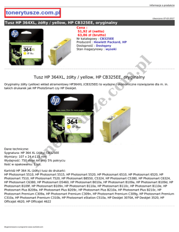 Informacje o produkcie Utworzono 07-03-2017 Tusz HP 364XL, żółty / yellow, HP CB325EE, oryginalny Cena : 51,92 zł (netto) 63,86 zł (brutto) .p l Nr katalogowy : CB325EE Producent : Hewlett Packard, HP Dostępność : Dostępny Stan magazynowy : wysoki om Tusz HP 364XL, żółty / yellow, HP CB325EE, oryginalny ne r yT u sz e. c Oryginalny żółty (yellow) wkład atramentowy HP364XL (CB325EE) to wydajne i ekonomiczne rozwiązanie dla m. in. takich drukarek jak HP PhotoSmart czy HP DeskJet. To Dane techniczne: Sygnatura: HP 364 XL (żółty) CB325EE Wymiary: 107 x 24 x 115 mm Wydajność: 750 stron A4 przy 5% pokryciu Ilość w opakowaniu: 1 szt. Kartridż HP 364 XL (żółty) tusz do drukarki: HP Photosmart 5510, HP Photosmart 5515, HP Photosmart 5520, HP Photosmart 6510, HP Photosmart 6520, HP Photosmart 7510, HP Photosmart 7520, HP Photosmart B8550, C5324, HP Photosmart C5380, HP Photosmart C6324, HP Photosmart C6380, HP Photosmart D5460, HP Photosmart B010a, HP Photosmart B109a, HP Photosmart B109d, HP Photosmart B109f, HP Photosmart B109n, HP Photosmart B110a, HP Photosmart B110c, HP Photosmart B110e, HP Photosmart Plus B209a, HP Photosmart Plus B209c, HP Photosmart Plus B210a, HP Photosmart Plus B210c, HP Photosmart Premium C309a, HP Photosmart Premium C309n, HP Photosmart Premium C309g, HP Photosmart Premium C310a, HP Photosmart Premium C310b, HP Photosmart eStation C510a, HP DeskJet 3070A, HP DeskJet 3520, HP OfficeJet 4620, HP OfficeJet 4622 Wygenerowano w programie www.oscGold.com