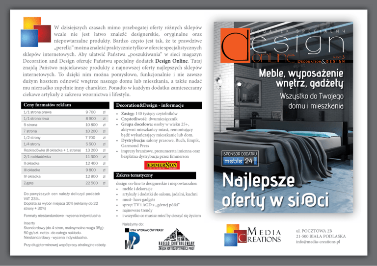 W dzisiejszych czasach mimo przebogatej oferty różnych sklepów wcale nie jest łatwo znaleźć designerskie, oryginalne oraz niepowtarzalne produkty. Bardzo często jest tak, że te prawdziwe „perełki” można znaleźć praktycznie tylko w ofercie specjalistycznych sklepów internetowych. Aby ułatwić Państwa „poszukiwania” w sieci magazyn Decoration and Design oferuje Państwu specjalny dodatek Design Online. Tutaj znajdą Państwo najciekawsze produkty z najnowszej oferty najlepszych sklepów internetowych. To dzięki nim można pomysłowo, funkcjonalnie i nie zawsze dużym kosztem odnowić wnętrze naszego domu lub mieszkania, a także nadać mu nierzadko zupełnie inny charakter. Ponadto w każdym dodatku zamieszczamy ciekawe artykuły z zakresu wzornictwa i lifestylu. Ceny formatów reklam D D O D A T E K e s i g n online 9 700 zł 1/1 strona lewa 8 900 zł 5 strona 10 800 zł 7 strona 10 200 zł 1/2 strony 7 700 zł 1/4 strony 5 500 zł Rozkładówka (II okładka + 1 strona) 13 200 zł 2/1 rozkładówka 11 300 zł II okładka 12 400 zł III okładka 9 800 zł IV okładka 12 900 zł Z-gate 22 500 zł Do powyższych cen należy doliczyć podatek VAT 23%. Dopłata za wybór miejsca 10% (reklamy do 22 strony + 30%) Formaty niestandardowe - wycena indywidualna Inserty Standardowy (do 4 stron, maksymalna waga 35g): 50 gr/szt. netto - do całego nakładu. Niestandardowy - wycena indywidualna. Przy długoterminowej współpracy atrakcyjne rabaty. • Zasięg: 140 tysięcy czytelników • Częstotliwość: dwumiesięcznik • Grupa docelowa: osoby w wieku 25+, aktywni mieszkańcy miast, remontujący bądź wykańczający mieszkanie lub dom. • Dystrybucja: salony prasowe, Ruch, Empik, Garmond Press • imprezy branżowe, prenumerata imienna oraz bezpłatna dystrybucja przez Emmerson Zakres tematyczny design on-line to designerskie i niepowtarzalne: • meble i dekoracje • artykuły i dodatki do salonu, jadalni, kuchni • must- have gadgets • sprzęt TV i AGD z „górnej półki” • najnowsze trendy • i wszystko co musisz mieć by cieszyć się życiem NUMER 3 D E C O R A T I O N &D E S I G N Meble, wyposażenie wnętrz, gadżety Wszystko do Twojego domu i mieszkania Decoration&Design - informacje 1/1 strona prawa S P E C J A L N Y SPONSOR DODATKU Najlepsze oferty w si ci Należymy do: IZBA WYDAWCÓW PRASY ul. POCZTOWA 2B 21-500 BIAŁA PODLASKA [email protected]