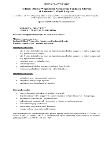 OFERTA PRACY NR 2/2017 Podlaski Oddział Wojewódzki Narodowego Funduszu Zdrowia ul. Pałacowa 3, 15-042 Białystok na podstawie art. 107a-107g ustawy z dnia 27 sierpnia 2004r. o świadczeniach opieki zdrowotnej finansowanych ze środków publicznych (Dz.U 5, poz. 581 tekst jednolity z późń, zm.) ogłasza nabór kandydatów na stanowisko : KSIĘGOWY - PEŁNY ETAT UMOWA O PRACĘ NA ZASTĘPSTWO Wykształcenie: wyższe ekonomiczne lub średnie ekonomiczne Miejsce wykonywania pracy: Podlaski Oddział Wojewódzki Narodowego Funduszu Zdrowia, Komórka organizacyjna : Wydział Księgowości Wymagania niezbędne: min. 3 letnie doświadczenie pracy na stanowisku samodzielnej księgowej w pełnej księgowości przy wykształceniu wyższym, min. 5 letnie doświadczenie pracy na stanowisku samodzielnej księgowej w pełnej księgowości przy wykształceniu średnim, znajomość ustawy o rachunkowości, komunikatywność, biegła znajomość obsługi komputera (aplikacje Word, Excel), sumienność, dokładność, terminowość i odpowiedzialność. Wymagania pożądane: umiejętność pracy samodzielnej i w zespole, umiejętność analitycznego myślenia, umiejętność sporządzania analiz i raportów. Główne obowiązki: kontrola formalno- rachunkowa dowodów księgowych, dekretowanie dowodów księgowych i wprowadzanie do systemu Finansowo – Księgowego, prowadzenie rozrachunków i uzgadnianie sald, realizacja zajęć komorniczych i umów cesji w zakresie prowadzonych spraw, rozliczanie delegacji służbowych, sporządzanie sprawozdawczości finansowej, obsługa systemu bankowości elektronicznej. Ponadto kandydaci do zatrudnienia powinni spełniać wymogi określone dla pracowników NFZ w art. 112 ustawy z dnia 27 sierpnia 2004 r. o świadczeniach opieki zdrowotnej finansowanych ze środków publicznych (Dz. U. z 2008 Nr 164, poz. 1027) Wymagane dokumenty: 1. kopie dokumentów potwierdzających wykształcenie i doświadczenie zawodowe, 2. własnoręcznie podpisany list motywacyjny z numerem oferty i c.v., w którym należy zamieścić następującą klauzulę; "wyrażam zgodę na przetwarzanie danych osobowych zawartych w mojej ofercie pracy przez POW NFZ, dla potrzeb niezbędnych do procesu rekrutacji – zgodnie z ustawą z dnia 29.08.1997 o ochronie danych osobowych" (Dz. U. z 2002 r. Nr 101 poz. 926 z późn. zm.), Dokumenty aplikacyjne należy składać w zamkniętej kopercie z dopiskiem: OFERTA PRACY NR 2/2017 osobiście w Kancelarii Oddziału lub przesłać listownie w terminie do 02.02.2017 r. (decyduje data wpływu do Oddziału) na adres: Podlaski Oddział Wojewódzki Narodowego Funduszu Zdrowia, ul. Pałacowa 3, 15-042 Białystok). Informacje telefoniczne pod nr: (0-85) 745–95–74 Pozostałe informacje: Oferty z niepełnymi bądź niepodpisanymi dokumentami, niezgodne z wymogami zawartymi w ogłoszeniu oraz otrzymane po terminie nie będą rozpatrywane (liczy się data wpływu do Podlaskiego Oddziału Wojewódzkiego NFZ), Kandydaci zakwalifikowani zostaną powiadomieni o terminie rozmowy wstępnej, Zgodnie z art. 107d oraz 107f ustawy z dnia 27 sierpnia 2004 r. o świadczeniach opieki zdrowotnej finansowanych ze środków publicznych listę kandydatów spełniających wymogi formalne określone w ogłoszeniu o naborze oraz wynik naboru ogłasza się w Biuletynie Informacji Publicznej na stronie :www. nfz-bialystok.pl oraz na tablicy ogłoszeń Podlaskiego Oddziału Wojewódzkiego Narodowego Funduszu Zdrowia, Oferty osób, które nie zostały wybrane na dane stanowisko w procesie rekrutacji, zostaną komisyjnie zniszczone, Dyrektor Oddziału zastrzega sobie prawo do odwołania postępowania rekrutacyjnego w każdym czasie, bez podania przyczyny.
