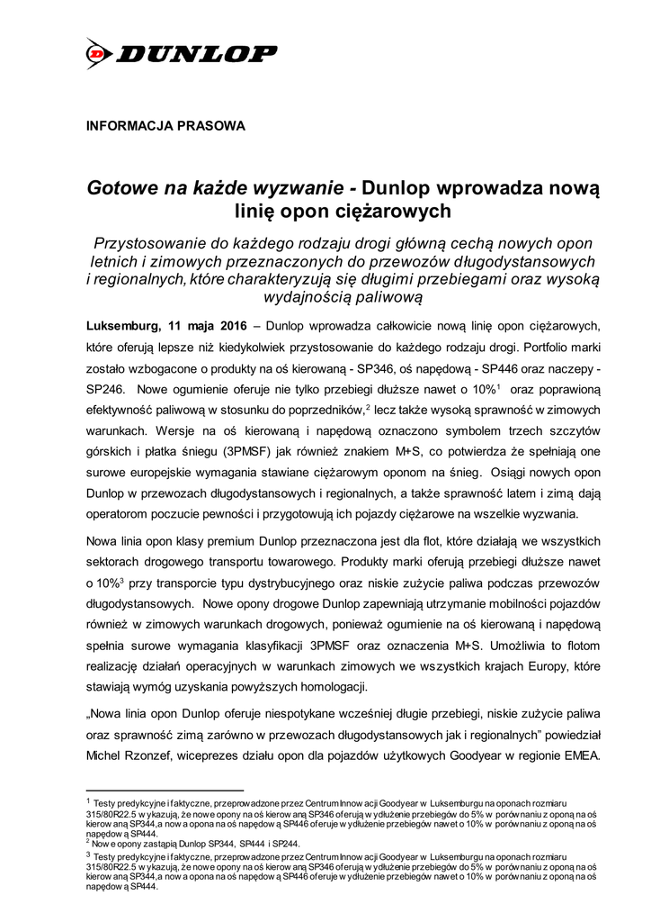 INFORMACJA PRASOWA Gotowe na każde wyzwanie - Dunlop wprowadza nową linię opon ciężarowych Przystosowanie do każdego rodzaju drogi główną cechą nowych opon letnich i zimowych przeznaczonych do przewozów długodystansowych i regionalnych, które charakteryzują się długimi przebiegami oraz wysoką wydajnością paliwową Luksemburg, 11 maja 2016 – Dunlop wprowadza całkowicie nową linię opon ciężarowych, które oferują lepsze niż kiedykolwiek przystosowanie do każdego rodzaju drogi. Portfolio marki zostało wzbogacone o produkty na oś kierowaną - SP346, oś napędową - SP446 oraz naczepy SP246. Nowe ogumienie oferuje nie tylko przebiegi dłuższe nawet o 10%1 oraz poprawioną efektywność paliwową w stosunku do poprzedników,2 lecz także wysoką sprawność w zimowych warunkach. Wersje na oś kierowaną i napędową oznaczono symbolem trzech szczytów górskich i płatka śniegu (3PMSF) jak również znakiem M+S, co potwierdza że spełniają one surowe europejskie wymagania stawiane ciężarowym oponom na śnieg. Osiągi nowych opon Dunlop w przewozach długodystansowych i regionalnych, a także sprawność latem i zimą dają operatorom poczucie pewności i przygotowują ich pojazdy ciężarowe na wszelkie wyzwania. Nowa linia opon klasy premium Dunlop przeznaczona jest dla flot, które działają we wszystkich sektorach drogowego transportu towarowego. Produkty marki oferują przebiegi dłuższe nawet o 10%3 przy transporcie typu dystrybucyjnego oraz niskie zużycie paliwa podczas przewozów długodystansowych. Nowe opony drogowe Dunlop zapewniają utrzymanie mobilności pojazdów również w zimowych warunkach drogowych, ponieważ ogumienie na oś kierowaną i napędową spełnia surowe wymagania klasyfikacji 3PMSF oraz oznaczenia M+S. Umożliwia to flotom realizację działań operacyjnych w warunkach zimowych we wszystkich krajach Europy, które stawiają wymóg uzyskania powyższych homologacji. „Nowa linia opon Dunlop oferuje niespotykane wcześniej długie przebiegi, niskie zużycie paliwa oraz sprawność zimą zarówno w przewozach długodystansowych jak i regionalnych” powiedział Michel Rzonzef, wiceprezes działu opon dla pojazdów użytkowych Goodyear w regionie EMEA. 1 Testy predykcyjne i faktyczne, przeprowadzone przez Centrum Innow acji Goodyear w Luksemburgu na oponach rozmiaru 315/80R22.5 w ykazują, że nowe opony na oś kierow aną SP346 oferują w ydłużenie przebiegów do 5% w porównaniu z oponą na oś kierow aną SP344,a now a opona na oś napędow ą SP446 oferuje w ydłużenie przebiegów nawet o 10% w porównaniu z oponą na oś napędow ą SP444. 2 Now e opony zastąpią Dunlop SP344, SP444 i SP244. 3 Testy predykcyjne i faktyczne, przeprowadzone przez Centrum Innow acji Goodyear w Luksemburgu na oponach rozmiaru 315/80R22.5 w ykazują, że nowe opony na oś kierow aną SP346 oferują w ydłużenie przebiegów do 5% w porównaniu z oponą na oś kierow aną SP344,a now a opona na oś napędow ą SP446 oferuje w ydłużenie przebiegów nawet o 10% w porównaniu z oponą na oś napędow ą SP444. „Opony te zapewniają poczucie pewności właścicielom flot, którzy poszukują produktów oferujących równowagę pomiędzy długimi przebiegami i niskim zużyciem paliwa, co zapewnia obniżenie całkowitego kosztu posiadania i optymalizuje inwestycję w ogumienie. Dodatkową zaletą jest sprawność zimą, dzięki której pojazdy ciężarowe mogą pozostać w ruchu nawet podczas nieprzewidywalnych warunków drogowych. Opony SP346, SP446 i SP246 są gotowe podjąć każde wyzwanie.” Opona na oś kierowaną Dunlop SP346 Nowa opona Dunlop SP346 na oś kierowaną oferuje dłuższe przebiegi i niższe zużycie paliwa niż poprzedniczka SP344, a także doskonałą trakcję i kontrolę w każdych warunkach. Innowacyjna konstrukcja bieżnika oferuje osiągi, za sprawą których ogumienie spełnia surowe regulacje dla unijnej homologacji opon zimowych dla pojazdów ciężarowych, jak również wymagania oznaczenia M+S. Lamele, pogłębione w stosunku do modelu SP344, są tutaj kluczowym elementem, ponieważ zwiększają elastyczność bloków bieżnika i umożliwiają wydajniejsze zbijanie śniegu. Konstrukcja lameli i ich gęstość zostały dobrane w taki sposób, aby zapewniać jednocześnie wolne zużycie opony, sprawność zimą i wysoką prz yczepność na mokrej nawierzchni. Charakterystyka zużycia utrzymuje właściwości bieżnika przez cały okres eksploatacji, aż do chwili gdy opona będzie gotowa do nacinania. Aby pomóc w utrzymaniu wydajności operacyjnej pojazdów, od których wymaga się zwiększonej nośności, nowa opona Dunlop SP346 na oś kierowaną jest w niektórych rozmiarach dostępna w wersji High Load. Ogumienie na oś kierowaną pomaga kompensować zwiększone obciążenia osi przedniej, na przykład dodatkowym osprzętem wymaganym przez normę Euro VI. Opona na oś napędową Dunlop SP446 Podobnie jak nowa opona na oś kierowaną, wersja Dunlop SP446 na oś napędową oferuje dłuższe przebiegi przy jednoczesnym zmniejszeniu zużycia paliwa w porównaniu z poprzednim modelem SP444. Ogumienie charakteryzuje się również doskonałą trakcją w każdych warunkach. Jednym z najważniejszych elementów dających przewagę pod względem osiągów jest podstawa lameli, która kształtem przypomina kroplę deszczu. Specjalna konstrukcja pomaga spełnić wymogi oznaczeń M+S i 3PMSF, jednocześnie zmniejszając obciążenie spodniej części lameli. Kolejną zaletą lameli jest trwałość w warunkach przewozów regionalnych. Rozmiar bloków bieżnika i szerokość rowków równomiernie rozkłada sztywność bieżnika, co wydłuża przebiegi i zwiększa przyczepność w mokrych warunkach drogowych. Dodatkową właściwością jest nowa technologia dwuwarstwowa. Zewnętrzna warstwa bieżnika jest wysoce odporna na ścieranie, natomiast wewnętrzna zmniejsza opór toczenia dzięki niskiej histerezie. Rozwiązania t