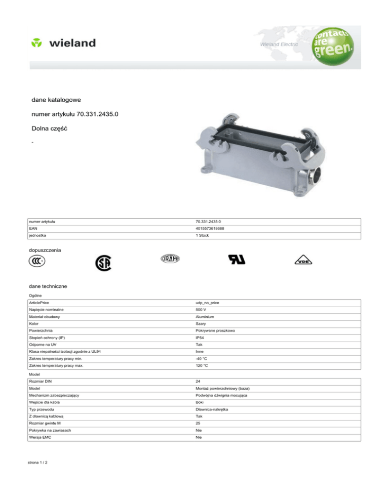 dane katalogowe numer artykułu 70.331.2435.0 Dolna część - numer artykułu 70.331.2435.0 EAN 4015573618688 jednostka 1 Stück dopuszczenia dane techniczne Ogólne ArticlePrice udp_no_price Napięcie nominalne 500 V Materiał obudowy Aluminium Kolor Szary Powierzchnia Pokrywane proszkowo Stopień ochrony (IP) IP54 Odporne na UV Tak Klasa niepalności izolacji zgodnie z UL94 Inne Zakres temperatury pracy min. -40 °C Zakres temperatury pracy max. 120 °C Model Rozmiar DIN 24 Model Montaż powierzchniowy (baza) Mechanizm zabezpieczający Podwójna dźwignia mocująca Wejście dla kabla Boki Typ przewodu Dławnica-nakrętka Z dławnicą kablową Tak Rozmiar gwintu M 25 Pokrywka na zawiasach Nie Wersja EMC Nie strona 1 / 2 rysunki techniczne strona 2 / 2