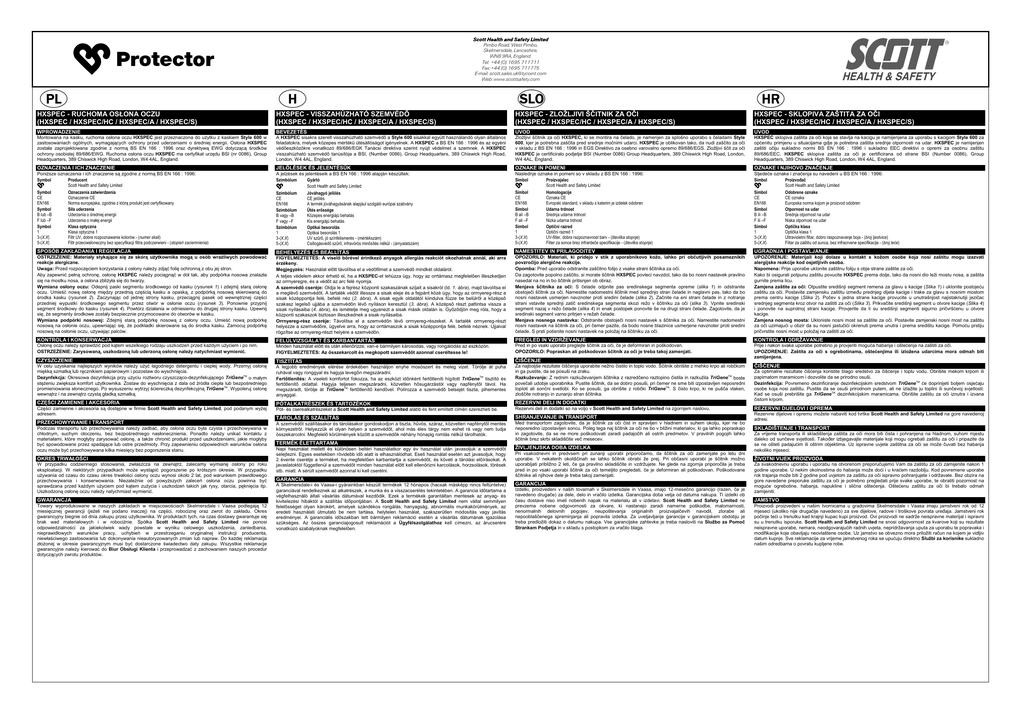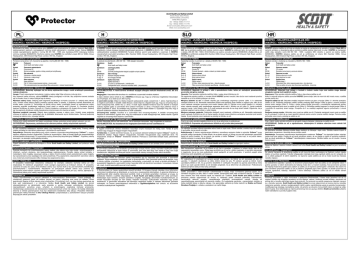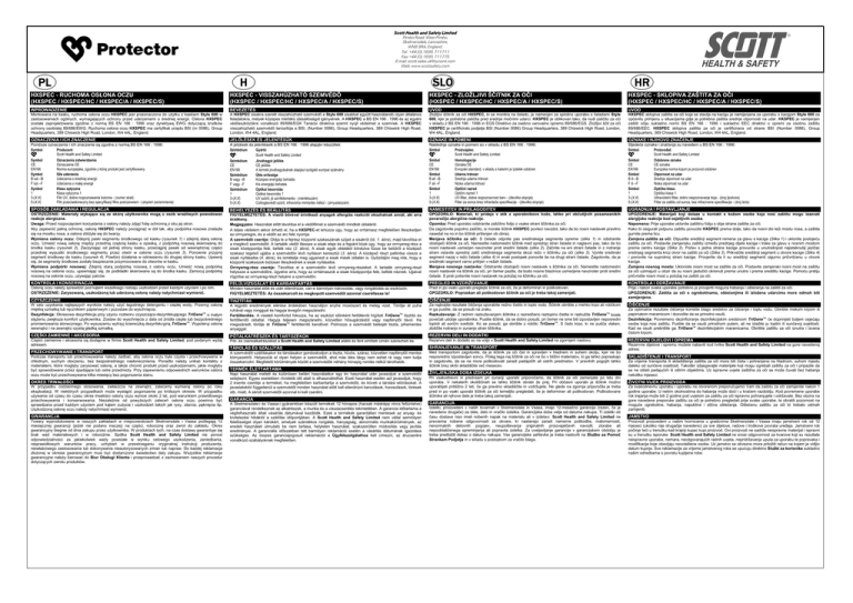 Scott Health and Safety Limited Pimbo Road, West Pimbo, Skelmersdale, Lancashire, WN8 9RA, England. Tel: +44 (0) 1695 711711 Fax: +44 (0) 1695 711775 E-mail: [email protected] Web: www.scottsafety.com A HXSPEC - RUCHOMA OSŁONA OCZU (HXSPEC / HXSPEC/HC / HXSPEC/A / HXSPEC/S) HXSPEC - VISSZAHÚZHATÓ SZEMVÉDŐ (HXSPEC / HXSPEC/HC / HXSPEC/A / HXSPEC/S) HXSPEC - ZLOŽLJIVI ŠČITNIK ZA OČI (HXSPEC / HXSPEC/HC / HXSPEC/A / HXSPEC/S) HXSPEC - SKLOPIVA ZAŠTITA ZA OČI (HXSPEC / HXSPEC/HC / HXSPEC/A / HXSPEC/S) WPROWADZENIE BEVEZETÉS UVOD UVOD Montowana na kasku, ruchoma osłona oczu HXSPEC jest przeznaczona do użytku z kaskiem Style 600 w zastosowaniach ogólnych, wymagających ochrony przed uderzeniami o średniej energii. Osłona HXSPEC została zaprojektowana zgodnie z normą BS EN 166 : 1996 oraz dyrektywą EWG dotyczącą środków ochrony osobistej 89/686/EWG. Ruchoma osłona oczu HXSPEC ma certyfikat urzędu BSI (nr 0086), Group Headquarters, 389 Chiswick High Road, London, W4 4AL, England. A HXSPEC sisakra szerelt visszahúzható szemvédő a Style 600 sisakkal együtt használandó olyan általános feladatokra, melyek közepes mértékű ütésállóságot igényelnek. A HXSPEC a BS EN 166 : 1996 és az egyéni védőeszközökre vonatkozó 89/686/EGK Tanácsi direktíva szerint nyújt védelmet a szemnek. A HXSPEC visszahúzható szemvédő tanúsítója a BSI, (Number 0086), Group Headquarters, 389 Chiswick High Road, London, W4 4AL, England. Zložljivi ščitnik za oči HXSPEC, ki se montira na čelado, je namenjen za splošno uporabo s čeladami Style 600, kjer je potrebna zaščita pred srednje močnimi udarci. HXSPEC je oblikovan tako, da nudi zaščito za oči v skladu z BS EN 166 : 1996 in EGS Direktivo za osebno varovalno opremo 89/686/EGS. Zložljivi ščit za oči HXSPEC je certificiralo podjetje BSI (Number 0086) Group Headquarters, 389 Chiswick High Road, London, W4 4AL, England. HXSPEC sklopiva zaštita za oči koja se stavlja na kacigu je namijenjena za uporabu s kacigom Style 600 za općenitu primjenu u situacijama gdje je potrebna zaštita srednje otpornosti na udar. HXSPEC je namijenjen zaštiti očiju sukladno normi BS EN 166 : 1996 i sukladno EEC direktivi o opremi za osobnu zaštitu 89/686/EEC. HXSPEC sklopiva zaštita za oči je certificirana od strane BSI (Number 0086), Group Headquarters, 389 Chiswick High Road, London, W4 4AL, England. OZNACZENIA I ICH ZNACZENIE JELÖLÉSEK ÉS JELENTÉSÜK OZNAKE IN POMENI OZNAKE I NJIHOVO ZNAČENJE Poniższe oznaczenia i ich znaczenie są zgodne z normą BS EN 166 : 1996: Symbol Producent B Scott Health and Safety Limited Symbol Oznaczenia zatwierdzenia CE Oznaczenie CE EN166 Norma europejska, zgodnie z którą produkt jest certyfikowany Symbol Siła uderzenia B lub –B Uderzenia o średniej energii F lub –F Uderzenia o małej energii Symbol Klasa optyczna 1 Klasa optyczna 1 3-(X.X) Filtr UV, dobre rozpoznawanie kolorów - (numer skali) 5-(X.X) Filtr przeciwsłoneczny bez specyfikacji filtra podczerwieni - (stopień zaciemnienia) A jelzések és jelentéseik a BS EN 166 : 1996 alapján készültek: Szimbólum Gyártó B Scott Health and Safety Limited Szimbólum Jóváhagyó jelölés CE CE jelölés EN166 A termék jóváhagyásának alapjául szolgáló európai szabvány Szimbólum Ütés erőssége B vagy –B Közepes energiájú behatás F vagy –F Kis energiájú behatás Szimbólum Optikai besorolás 1 Optikai besorolás 1 3-(X.X) UV szűrő, jó színfelismerés - (mértékszám) 5-(X.X) Csillogásvédő szűrő, infravörös minősítés nélkül - (árnyalatszám) Naslednje oznake in pomeni so v skladu z BS EN 166 : 1996: Simbol Proizvajalec B Scott Health and Safety Limited Simbol Homologacije CE Oznaka CE EN166 Evropski standard, v skladu s katerim je izdelek odobren Simbol Udarna trdnost B ali –B Srednja udarna trdnost F ali –F Nizka udarna trdnost Simbol Optični razred 1 Optični razred 1 3-(X.X) UV-filter, dobra razpoznavnost barv - (številka stopnje) 5-(X.X) Filter za sonce brez infrardeče specifikacije - (številka stopnje) Sljedeće oznake i značenja su navedeni u BS EN 166 : 1996: Simbol Proizvođač B Scott Health and Safety Limited Simbol Odobrene oznake CE CE oznaka EN166 Europska norma kojom je proizvod odobren Simbol Otpornost na udar B ili –B Srednja otpornost na udar F ili –F Niska otpornost na udar Simbol Optička klasa 1 Optička klasa 1 3-(X.X) Ultravioletni filtar, dobro raspoznavanje boja - (broj ljestvice) 5-(X.X) Filtar za zaštitu od sunca, bez infracrvene specifikacije - (broj leće) SPOSÓB ZAKŁADANIA I REGULACJA BEHELYEZÉS ÉS BEÁLLÍTÁS OSTRZEŻENIE: Materiały stykające się ze skórą użytkownika mogą u osób wrażliwych powodować reakcje alergiczne. Uwaga: Przed rozpoczęciem korzystania z osłony należy zdjąć folię ochronną z obu jej stron. Aby zapewnić pełną ochronę, osłonę HXSPEC należy pociągnąć w dół tak, aby podpórka nosowa znalazła się na mostku nosa, a osłona zbliżyła się do twarzy. Wymiana osłony oczu: Odepnij paski segmentu środkowego od kasku (rysunek 1) i zdejmij starą osłonę oczu. Umieść nową osłonę między przednią częścią kasku a opaską, z podpórką nosową skierowaną do środka kasku (rysunek 2). Zaczynając od jednej strony kasku, przeciągnij pasek od wewnętrznej części przedniej wypustki środkowego segmentu przez otwór w osłonie oczu (rysunek 3). Ponownie przypnij segment środkowy do kasku (rysunek 4). Powtórz działania w odniesieniu do drugiej strony kasku. Upewnij się, że segmenty środkowe zostały bezpiecznie przymocowane do otworów w kasku. Wymiana podpórki nosowej: Zdejmij starą podpórkę nosową z osłony oczu. Umieść nową podpórkę nosową na osłonie oczu, upewniając się, że podkładki skierowane są do środka kasku. Zamocuj podpórkę nosową na osłonie oczu, używając palców. FIGYELMEZTETÉS: A viselő bőrével érintkező anyagok allergiás reakciót okozh