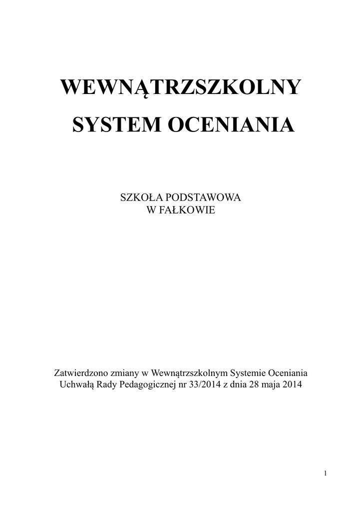 WEWNĄTRZSZKOLNY SYSTEM OCENIANIA SZKOŁA PODSTAWOWA W FAŁKOWIE Zatwierdzono zmiany w Wewnątrzszkolnym Systemie Oceniania Uchwałą Rady Pedagogicznej nr 33/2014 z dnia 28 maja 2014 1 PODSTAWA PRAWNA Ustawa z dnia 7 września 1991 r. o systemie oświaty ( Dz. U. Z 2004 r. Nr 256, poz.2572 ze zmianami) Rozporządzenie Ministra Edukacji Narodowej z dnia 30 kwietnia 2007 r. w sprawie warunków i sposobu oceniania, klasyfikowania i promowania uczniów i słuchaczy oraz przeprowadzania sprawdzianów i egzaminów w szkołach publicznych (Dz. U. z 2007 r. Nr 83, poz. 562 z późn.zm.) Rozporządzenie Ministra Edukacji Narodowej z dnia 20 sierpnia 2010 r. zmieniające rozporządzenie w sprawie warunków i sposobu oceniania, klasyfikowania i promowania uczniów i słuchaczy oraz przeprowadzania sprawdzianów i egzaminów w szkołach publicznych Rozporządzeniem Ministra Edukacji Narodowej z dnia 14 kwietnia 1992 r. w sprawie warunków i sposobu organizowania nauki religii w szkołach publicznych (Dz. U. Nr 36 poz. 155 z późn. zm.) Korespondencja MEN i Przewodniczącego Komisji Wychowania Katolickiego Episkopatu PolskiWarszawa, 2000.06.19 Rozporządzenie Ministra Edukacji Narodowej w sprawie warunków i sposobu organizowania nauki religii w publicznych przedszkolach i szkołach Rozporządzenie Ministra Edukacji Narodowej z dnia 30 kwietnia 2013 w sprawie zasad udzielania i organizacji pomocy psychologiczno-pedagogicznej w publicznych przedszkolach, szkołach i placówkach (Dz. U. 2013/532 z dnia 7 maja 2013 r.) Statut Szkoły Podstawowej w Fałkowie Rozporządzenie Ministra Edukacji Narodowej z dnia 25 kwietnia 2013 r. zmieniającym rozporządzenie Ministra Edukacji Narodowej z dnia 30 kwietnia 2007 r. w sprawie warunków i sposobu oceniania, klasyfikowania i promowania uczniów i słuchaczy oraz przeprowadzania sprawdzianów i egzaminów w szkołach publicznych (Dz.U. nr 65, poz. 400, ze zm) 2 SPIS TREŚCI 1. Przepisy ogólne ….............................................................................................. 4 2. Kryteria oceny zachowania ….......................................................................... 6 3. Ocenianie bieżące …........................................................................................... 10 4. Ocenianie śródroczne …...................................................................................... 12 5. Klasyfikacja końcoworoczna …........................................................................... 13 6. Ogólne kryteria na poszczególne oceny ….......................................................... 15 7. Warunki i tryb uzyskiwania wyższych niż przewidywane semestralnej/końcoworocznej oceny klasyfikacyjnej ………………………… 16 8. Promowanie …...................................................................................................... 17 9. Egzamin klasyfikacyjny ….................................................................................... 20 10. Egzamin poprawkowy …....................................................................................... 21 11. Procedura odwołania od oceny śródrocznej i końcoworocznej …......................... 22 12. Postanowienia końcowe ….................................................................................... 24 3 §1 PRZEPISY OGÓLNE 1. Ocenianiu podlegają: osiągnięcia edukacyjne ucznia; zachowanie ucznia. 2. Ocenianie osiągnięć edukacyjnych ucznia polega na rozpoznawaniu przez nauczycieli poziomu i postępów w opanowaniu przez ucznia wiadomości i umiejętności w stosunku do wymagań edukacyjnych wynikających z podstawy programowej, określonej w odrębnych przepisach, i realizowanych w szkole programów nauczania, uwzględniających tę podstawę. 3. Ocenianie zachowania ucznia polega na rozpoznawaniu przez wychowawcę klasy, nauczycieli oraz uczniów danej klasy stopnia respektowania przez ucznia zasad współżycia społecznego i norm etycznych oraz angażowanie się w życie społeczne klasy i szkoły. 4. Ocenianie osiągnięć edukacyjnych i zachowania ucznia odbywa się w ramach oceniania wewnątrzszkolnego. 5. Ocenianie wewnątrzszkolne ma na celu: poinformowanie ucznia o poziomie jego osiągnięć edukacyjnych; pomoc uczniowi w samodzielnym planowaniu swojego rozwoju; motywowanie ucznia do dalszej pracy; dostarczanie rodzicom (prawnym opiekunom) i nauczycielom informacji o postępach, trudnościach w uczeniu się oraz uzdolnieniach uczniów; umożliwianie nauczycielom doskonalenia organizacji i metod pracy dydaktyczno wychowawczej. 6. Ocenianie wewnątrzszkolne obejmuje: formułowanie przez nauczycieli wymagań edukacyjnych niezbędnych do uzyskania poszczególnych śródrocznych i końcoworocznych (semestralnych) ocen klasyfikacyjnych z obowiązkowych i nadobowiązkowych zajęć edukacyjnych; ustalanie kryteriów oceniania zachowania; ocenianie bieżące i ustalanie śródrocznych ocen klasyfikacyjnych z obowiązkowych i nadobowiązkowych zajęć edukacyjnych oraz śródrocznej oceny klasyfikacyjnej zachowania; przeprowadzanie egzaminów klasyfikacyjnych i poprawkowych; ustalanie końcoworocznych (semestralnych) ocen klasyfikacyjnych z obowiązkowych i nadobowiązkowych zajęć edukacyjnych oraz końcoworocznej 4 oceny klasyfikacyjnej zachowania ustalanie warunków i trybu uzyskania wyższych niż przewidywane końcoworocznych (semestralnych) ocen klasyfikacyjnych z obowiązkowych i nadobowiązkowych zajęć edukacyjnych; ustalanie warunków i sposobu przekazywania rodzicom (prawnym opiekunom) informacji o postępach i trudnościach ucznia w nauce. 7. Nauczyciele na początku każdego roku szkolnego informują uczniów oraz ich rodziców (prawnych opiekunów) o: wymaganiach śródrocznych edukacyjnych i niezbędnych końcoworocznych do uzyskania (semestralnych) ocen poszczególnych klasyfikacyjnych z obowiązkowych i nadobowiązkowych zajęć edukacyjnych, wynikających z realizowanego przez siebie p