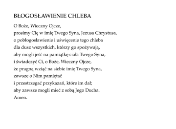Błogosławienie chleba O Boże, Wieczny Ojcze, prosimy Cię w imię Twego Syna, Jezusa Chrystusa, o pobłogosławienie i uświęcenie tego chleba dla dusz wszystkich, którzy go spożywają, aby mogli jeść na pamiątkę ciała Twego Syna, i świadczyć Ci, o Boże, Wieczny Ojcze, że pragną wziąć na siebie imię Twego Syna, zawsze o Nim pamiętać i przestrzegać przykazań, które im dał; aby zawsze mogli mieć z sobą Jego Ducha. Amen. Błogosławienie wody O Boże, Wieczny Ojcze, prosimy Cię w imię Twego Syna, Jezusa Chrystusa, o pobłogosławienie i uświęcenie tej wody dla dusz wszystkich, którzy ją piją, aby mogli uczynić to na pamiątkę przelanej za nich krwi Twego Syna; i świadczyć Ci, o Boże, Wieczny Ojcze, że zawsze o Nim pamiętają, aby mogli mieć z sobą Jego Ducha. Amen. © 2011 IRI. Wszelkie prawa zastrzeżone. Printed in Germany. 1/11. 1/11. Tłumaczenie z: Sacrament Prayers. Polish. 33133 166