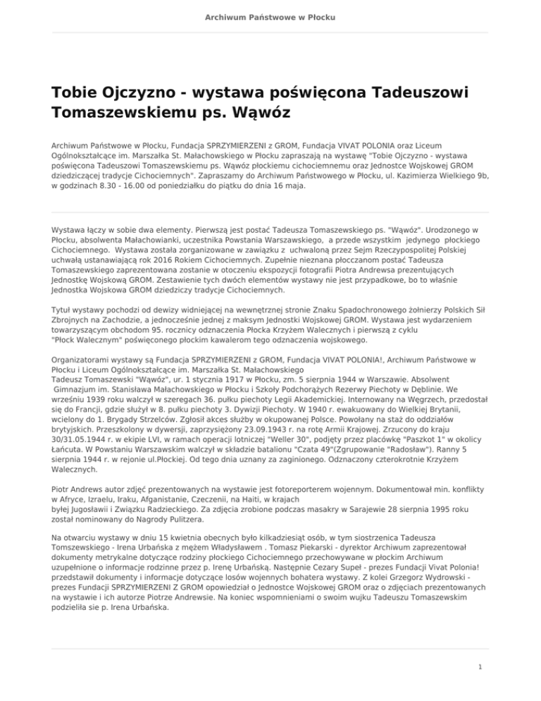 Archiwum Państwowe w Płocku Tobie Ojczyzno - wystawa poświęcona Tadeuszowi Tomaszewskiemu ps. Wąwóz Archiwum Państwowe w Płocku, Fundacja SPRZYMIERZENI z GROM, Fundacja VIVAT POLONIA oraz Liceum Ogólnokształcące im. Marszałka St. Małachowskiego w Płocku zapraszają na wystawę "Tobie Ojczyzno - wystawa poświęcona Tadeuszowi Tomaszewskiemu ps. Wąwóz płockiemu cichociemnemu oraz Jednostce Wojskowej GROM dziedziczącej tradycje Cichociemnych". Zapraszamy do Archiwum Państwowego w Płocku, ul. Kazimierza Wielkiego 9b, w godzinach 8.30 - 16.00 od poniedziałku do piątku do dnia 16 maja. Wystawa łączy w sobie dwa elementy. Pierwszą jest postać Tadeusza Tomaszewskiego ps. "Wąwóz". Urodzonego w Płocku, absolwenta Małachowianki, uczestnika Powstania Warszawskiego, a przede wszystkim jedynego płockiego Cichociemnego. Wystawa została zorganizowane w zawiązku z uchwaloną przez Sejm Rzeczypospolitej Polskiej uchwałą ustanawiającą rok 2016 Rokiem Cichociemnych. Zupełnie nieznana płocczanom postać Tadeusza Tomaszewskiego zaprezentowana zostanie w otoczeniu ekspozycji fotografii Piotra Andrewsa prezentujących Jednostkę Wojskową GROM. Zestawienie tych dwóch elementów wystawy nie jest przypadkowe, bo to właśnie Jednostka Wojskowa GROM dziedziczy tradycje Cichociemnych. Tytuł wystawy pochodzi od dewizy widniejącej na wewnętrznej stronie Znaku Spadochronowego żołnierzy Polskich Sił Zbrojnych na Zachodzie, a jednocześnie jednej z maksym Jednostki Wojskowej GROM. Wystawa jest wydarzeniem towarzyszącym obchodom 95. rocznicy odznaczenia Płocka Krzyżem Walecznych i pierwszą z cyklu "Płock Walecznym" poświęconego płockim kawalerom tego odznaczenia wojskowego. Organizatorami wystawy są Fundacja SPRZYMIERZENI z GROM, Fundacja VIVAT POLONIA!, Archiwum Państwowe w Płocku i Liceum Ogólnokształcące im. Marszałka St. Małachowskiego Tadeusz Tomaszewski "Wąwóz", ur. 1 stycznia 1917 w Płocku, zm. 5 sierpnia 1944 w Warszawie. Absolwent Gimnazjum im. Stanisława Małachowskiego w Płocku i Szkoły Podchorążych Rezerwy Piechoty w Dęblinie. We wrześniu 1939 roku walczył w szeregach 36. pułku piechoty Legii Akademickiej. Internowany na Węgrzech, przedostał się do Francji, gdzie służył w 8. pułku piechoty 3. Dywizji Piechoty. W 1940 r. ewakuowany do Wielkiej Brytanii, wcielony do 1. Brygady Strzelców. Zgłosił akces służby w okupowanej Polsce. Powołany na staż do oddziałów brytyjskich. Przeszkolony w dywersji, zaprzysiężony 23.09.1943 r. na rotę Armii Krajowej. Zrzucony do kraju 30/31.05.1944 r. w ekipie LVI, w ramach operacji lotniczej "Weller 30", podjęty przez placówkę "Paszkot 1" w okolicy Łańcuta. W Powstaniu Warszawskim walczył w składzie batalionu "Czata 49"(Zgrupowanie "Radosław"). Ranny 5 sierpnia 1944 r. w rejonie ul.Płockiej. Od tego dnia uznany za zaginionego. Odznaczony czterokrotnie Krzyżem Walecznych. Piotr Andrews autor zdjęć prezentowanych na wystawie jest fotoreporterem wojennym. Dokumentował min. konflikty w Afryce, Izraelu, Iraku, Afganistanie, Czeczenii, na Haiti, w krajach byłej Jugosławii i Związku Radzieckiego. Za zdjęcia zrobione podczas masakry w Sarajewie 28 sierpnia 1995 roku został nominowany do Nagrody Pulitzera. Na otwarciu wystawy w dniu 15 kwietnia obecnych było kilkadziesiąt osób, w tym siostrzenica Tadeusza Tomszewskiego - Irena Urbańska z mężem Władysławem . Tomasz Piekarski - dyrektor Archiwum zaprezentował dokumenty metrykalne dotyczące rodziny płockiego Cichociemnego przechowywane w płockim Archiwum uzupełnione o informacje rodzinne przez p. Irenę Urbańską. Następnie Cezary Supeł - prezes Fundacji Vivat Polonia! przedstawił dokumenty i informacje dotyczące losów wojennych bohatera wystawy. Z kolei Grzegorz Wydrowski prezes Fundacji SPRZYMIERZENI Z GROM opowiedział o Jednostce Wojskowej GROM oraz o zdjęciach prezentowanych na wystawie i ich autorze Piotrze Andrewsie. Na koniec wspomnieniami o swoim wujku Tadeuszu Tomaszewskim podzieliła sie p. Irena Urbańska. 1