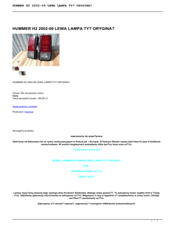 HUMMER H2 2002-09 LEWA LAMPA TY? ORYGINA? HUMMER H2 2002-09 LEWA LAMPA TY? ORYGINA? HUMMER H2 2002-09 LEWA LAMPA TY? ORYGINA? Ocena: Nie ma jeszcze oceny Cena Cena sprzeda?y brutto: 160,00 z? Zadaj pytanie o produkt Producent: Hummer Szczegó?y produktu -zapraszamy do wspó?pracyDzia?amy od kilkunastu lat na rynku motoryzacyjnym w Polsce jak i Europie. G?ównym filarem naszej dzia?alno?ci jest o?wietlenie samochodowe. W swoich magazynach posiadamy kilka tysi?cy lamp oraz cz??ci. Przedmiotem oferty jest MODEL: HUMMER H2 2002-09 LEWA LAMPA TY? ORYGINA? OPIS: NR MAGAZYNOWY: A3-118 CENA: 160 Z? Lampy wysy?amy jeszcze tego samego dnia Kurierem Siódemka, dlatego masz pewno??, ?e zakupiony towar szybko trafi w Twoje r?ce. Udzielamy gwarancji rozruchowej na zakupione cz??ci. Magazyny 2 razy w tygodniu s? zaopatrywany w nowy towar, istnieje mo?liwo?? zamówienia cz??ci. Zajmujemy si? równie? napraw?, regeneracj? i tuningiem reflektorów samochodowych. 1 / 2 HUMMER H2 2002-09 LEWA LAMPA TY? ORYGINA? Siedziba firmy: Lampy Samochodowe P.Alwin Nowa 33 64-560 Ostroróg NIP: 783-160-38-97 TEL.: 739-020-099 513-531-967 [email protected] Drogi kliencie! Masz prawo zwrotu zakupionego towaru w ci?gu 14 dni bez podania przyczyny, niczym nie ryzykujesz. Jedyne koszty, których nie zwracamy to koszty wysy?ki. 2 / 2 Powered by TCPDF (www.tcpdf.org)