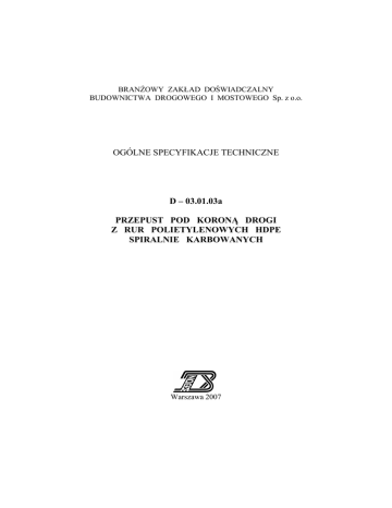 BRANśOWY ZAKŁAD DOŚWIADCZALNY BUDOWNICTWA DROGOWEGO I MOSTOWEGO Sp. z o.o. OGÓLNE SPECYFIKACJE TECHNICZNE D – 03.01.03a PRZEPUST POD KORONĄ DROGI Z RUR POLIETYLENOWYCH HDPE SPIRALNIE KARBOWANYCH Warszawa 2007 Jednostka autorska, opracowanie edytorskie i rozpowszechnienie: BranŜowy Zakład Doświadczalny Budownictwa Drogowego i Mostowego Sp. z o.o. 03-808 Warszawa, ul. Mińska 25, tel./fax 022 871 87 90 www.drogowa.strefa.pl Niniejsza ogólna specyfikacja techniczna jest materiałem pomocniczym do opracowania specyfikacji technicznej wykonania i odbioru robót budowlanych przy zlecaniu i realizacji robót na drogach. Treść ogólnej specyfikacji technicznej jest aktualna na dzień 31 marca 2007 r. Przy sporządzaniu specyfikacji technicznej wykonania i odbioru robót budowlanych naleŜy uaktualnić przepisy zawarte w wykorzystywanej niniejszej ogólnej specyfikacji technicznej. SPIS TREŚCI 1.WSTĘP.............................................................................................................................3 2. MATERIAŁY.................................................................................................................4 3. SPRZĘT ..........................................................................................................................5 4. TRANSPORT .................................................................................................................5 5. WYKONANIE ROBÓT ................................................................................................6 6. KONTROLA JAKOŚCI ROBÓT ................................................................................9 7. OBMIAR ROBÓT .......................................................................................................10 8. ODBIÓR ROBÓT ........................................................................................................10 9. PODSTAWA PŁATNOŚCI ........................................................................................10 10. PRZEPISY ZWIĄZANE .............................................................................................11 11. ZAŁĄCZNIKI ..............................................................................................................12 NAJWAśNIEJSZE OZNACZENIA I SKRÓTY OST ST IBDiM - ogólna specyfikacja techniczna - specyfikacja techniczna wykonania i odbioru robót budowlanych - Instytut Badawczy Dróg i Mostów D-03.01.03a Przepust pod koroną drogi z rur polietylenowych HDPE spiralnie karbowanych 3 1. WSTĘP 1.1. Przedmiot OST Przedmiotem niniejszej ogólnej specyfikacji technicznej (OST) są wymagania dotyczące wykonania i odbioru robót budowlanych przepustu z rur polietylenowych spiralnie karbowanych pod koroną drogi. 1.2. Zakres stosowania OST Ogólna specyfikacja techniczna (OST) jest materiałem pomocniczym do opracowania specyfikacji technicznej wykonania i odbioru robót budowlanych (ST), stosowanej jako dokument przetargowy i kontraktowy przy zlecaniu i realizacji robót na drogach. 1.3. Zakres robót objętych OST Ustalenia zawarte w niniejszej specyfikacji dotyczą zasad prowadzenia robót związanych z wykonaniem i odbiorem przepustu rurowego z polietylenu wysokiej gęstości (HDPE), z rur spiralnie karbowanych, budowanego pod koroną drogi. 1.4. Określenia podstawowe 1.4.1. Przepust – obiekt wybudowany w formie zamkniętej obudowy konstrukcyjnej, słuŜący do przepływu małych cieków wodnych pod nasypem korpusu drogowego lub słuŜący do ruchu kołowego i pieszego. 1.4.2. Przepust rurowy – przepust, którego konstrukcja nośna wykonana jest z rur. 1.4.3. Polietylen HDPE – wysokoudarowa odmiana polietylenu wysokiej gęstości, charakteryzująca się dobrą odpornością na działanie roztworu soli i olejów mineralnych oraz ograniczoną odpornością na benzynę. 1.4.4. Przepust z rur polietylenowych spiralnie karbowanych – przepust rurowy z polietylenu HDPE, którego zewnętrzna powierzchnia rur jest ukształtowana w formie spiralnego karbu o wielkości i skoku zwoju dostosowanego do średnicy rury. 1.4.5. Złączka do rur – element słuŜący do połączenia dwóch odcinków rur, przy montaŜu przepustu. 1.4.6. Element zaciskowy – opaska zaciskowa lub śruba zaciskająca złączkę, przy łączeniu dwóch odcinków rur. 1.4.7. Pozostałe określenia podstawowe są zgodne z obowiązującymi, odpowiednimi polskimi normami i z definicjami podanymi w OST D-M-00.00.00 „Wymagania ogólne”[1] pkt 1.4. 1.5. Ogólne wymagania dotyczące robót Ogólne wymagania dotyczące robót podano w OST D-M-00.00.00 „Wymagania ogólne” [1] pkt 1.5. 4 Przepust pod koroną drogi z rur polietylenowych HDPE spiralnie karbowanych D-03.01.03a 2. MATERIAŁY 2.1. Ogólne wymagania dotyczące materiałów Ogólne wymagania dotyczące materiałów, ich pozyskiwania i składowania, podano w OST D-M-00.00.00 „Wymagania ogólne” [1] pkt 2. 2.2. Materiały do wykonania robót 2.2.1. Zgodność materiałów z dokumentacją projektową i aprobatą techniczną Materiały do wykonania robót powinny być zgodne z ustaleniami dokumentacji projektowej lub ST oraz z aprobatą techniczną IBDiM. 2.2.2. Rodzaje materiałów – – – – Materiałami stosowanymi przy wykonywaniu przepustu są: rury polietylenowe HDPE spiralnie karbowane oraz elementy łączące rury, jak złączki, paski zaciskowe lub śruby, odpowiadające wymaganiom aprobaty technicznej, materiał, stanowiący fundament pod rury i do zasypki przepustu, zgodny z dokumentacją projektową, np. mieszanka kruszywa naturalnego (pospółka) odpowiadająca wymaganiom PN-B-11111:1996 [7], o uziarnieniu 0÷20 mm lub 0÷31,5 mm, ew. ława betonowa pod przepust lub jego część, zgodna z dokumentacją projektową, np. z betonu B 25, materiał do wykonania umocnienia skarp na wlocie i wylocie, zgodny z dokumentacją projektową, np. z: a) brukowca, odpowiadającego wymaganiom OST D-06.01.01 [6], b) betonowej kostki bru
