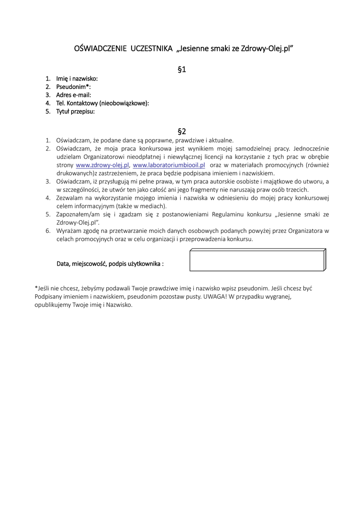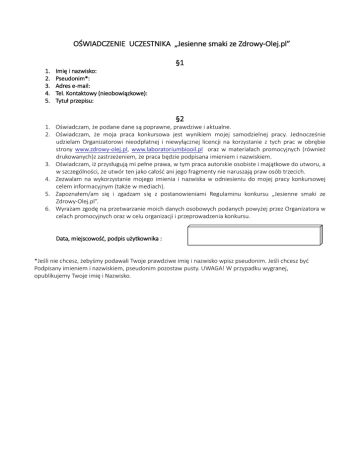 OŚWIADCZENIE UCZESTNIKA „Jesienne smaki ze Zdrowy-Olej.pl” §1 1. 2. 3. 4. 5. Imię i nazwisko: Pseudonim*: Adres e-mail: Tel. Kontaktowy (nieobowiązkowe): Tytuł przepisu: §2 1. Oświadczam, że podane dane są poprawne, prawdziwe i aktualne. 2. Oświadczam, że moja praca konkursowa jest wynikiem mojej samodzielnej pracy. Jednocześnie udzielam Organizatorowi nieodpłatnej i niewyłącznej licencji na korzystanie z tych prac w obrębie strony www.zdrowy-olej.pl, www.laboratoriumbiooil.pl oraz w materiałach promocyjnych (również drukowanych)z zastrzeżeniem, że praca będzie podpisana imieniem i nazwiskiem. 3. Oświadczam, iż przysługują mi pełne prawa, w tym praca autorskie osobiste i majątkowe do utworu, a w szczególności, że utwór ten jako całość ani jego fragmenty nie naruszają praw osób trzecich. 4. Zezwalam na wykorzystanie mojego imienia i nazwiska w odniesieniu do mojej pracy konkursowej celem informacyjnym (także w mediach). 5. Zapoznałem/am się i zgadzam się z postanowieniami Regulaminu konkursu „Jesienne smaki ze Zdrowy-Olej.pl”. 6. Wyrażam zgodę na przetwarzanie moich danych osobowych podanych powyżej przez Organizatora w celach promocyjnych oraz w celu organizacji i przeprowadzenia konkursu. Data, miejscowość, podpis użytkownika : *Jeśli nie chcesz, żebyśmy podawali Twoje prawdziwe imię i nazwisko wpisz pseudonim. Jeśli chcesz być Podpisany imieniem i nazwiskiem, pseudonim pozostaw pusty. UWAGA! W przypadku wygranej, opublikujemy Twoje imię i Nazwisko.