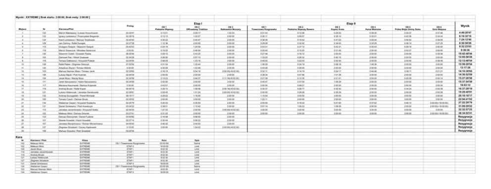 Wyniki : EXTREME [ Brak startu: 3:00:00, Brak mety: 2:00:00 ] Etap I Etap II Prolog OS 1 Piekielne Wąwozy OS 2 Offroadowy Triathlon OS 3 Bałtowskie Moczary OS 1 Trawersowa Rozgrzewka OS 2 Piekielne Wąwozy Rewers OS 3 Kopiec Kreta OS 4 Kanał Mistrzów OS 5 Próba Wójta Gminy Solec OS 6 Góra Małysza Miejsce Nr Kierowca/Pilot 1 122 Marcin Małolepszy / Łukasz Kozuchowski 02:32'47 0:13:01 0:29:17 1:02:33 0:31:43 0:12:26 0:25:53 0:39:30 0:34:37 0:37:48 2 123 Ignacy Lenkiewicz / Przemysław Bieganski 02:39'18 0:13:13 1:02:07 2:00:00 0:26:11 0:09:57 0:35:14 0:32:01 0:42:36 0:34:34 3 124 Karol Lenkiewicz / Mariusz Terpiłowski 02:40'40 0:30:22 0:40:47 2:00:00 0:38:35 0:19:02 0:41:03 0:55:44 0:56:50 0:39:09 4 129 Jan Ciemny / Rafał Dunajski 02:27'28 1:12:36 2:00:00 2:00:00 0:29:09 0:32:42 0:34:43 0:33:29 0:38:19 0:27:25 5 113 Grzegorz Święcki / Sławomir Święcki 05:42'03 0:24:19 1:24:09 2:00:00 0:53:31 0:37:12 0:43:31 0:55:43 0:28:16 2:00:00 6 118 Marcin Szewczuk / Mirosław Szewczuk 0:30:00 0:16:25 0:46:54 2:00:00 0:25:45 0:15:20 0:31:45 2:00:00 0:52:27 2:00:00 7 130 Slawomir Ciolek / Grzesiek Pawka 06:35'44 0:29:10 0:43:25 2:00:00 0:27:48 0:16:12 2:00:00 2:00:00 2:00:00 0:39:38 8 105 Ziemowit Paś / Witold Grabwski 02:34'28 0:26:00 0:57:10 2:00:00 1:33:25 0:26:32 0:40:15 2:00:00 2:00:00 2:00:00 9 116 Tomasz Dałkiewicz / Krzysztof Pułecki 02:24'54 0:58:29 1:33:16 3:00:00 0:45:02 0:22:03 0:53:45 2:00:00 2:00:00 0:38:49 10 128 Rafał Płatek / Zbigniew Sobczyk 07:00'54 0:31:54 1:32:44 2:00:00 1:06:29 0:34:19 0:58:18 1:08:36 2:00:00 3:00:00 11 120 Arkadiusz Zbyryt / Tomasz Mielnik 0:30:00 0:30:29 1:03:46 2:00:00 0:43:26 0:29:45 2:00:00 2:00:00 2:00:00 2:00:00 12 103 Mariusz Niemiec Misio / Tomasz Janik 02:33'65 0:16:15 0:54:16 2:00:00(+8:02:30) 0:32:11 0:14:19 0:24:17 0:44:46 0:38:11 0:21:21 13 106 Łukasz Męcik / Piotr Kubinek 02:44'09 2:00:00 2:00:00 2:00:00 0:38:34 0:47:56 1:01:38 2:00:00 2:00:00 2:00:00 14 104 Jacek Musz / Maciej Musz 02:30'58 0:14:23 0:44:37 2:11:18(+8:02:30) 0:27:09 0:12:35 0:21:41 2:00:00 0:20:29 0:50:14 15 111 Jarek Naruszewicz / Adam Naruszewicz 05:34'59 2:00:00 2:00:00 3:00:00 0:45:47 0:37:04 1:09:29 2:00:00 2:00:00 2:00:00 16 117 Marzena Kaczmarek / Bartosz Kulpinski 0:30:00 0:43:51 2:00:00 2:00:00 2:00:00 0:49:21 2:00:00 2:00:00 2:00:00 2:00:00 17 115 Andrzej Bruski / Rafał Krężel 04:45'19 0:26:10 1:06:06 2:05:18(+8:02:30) 0:30:37 0:26:17 0:30:43 2:00:00 0:34:24 0:50:39 18 121 Łukasz Walenczak / Jarosław Sierakowski 02:26'91 0:28:45 1:01:24 2:00:00(+8:02:30) 2:00:00 0:28:28 0:35:39 2:00:00 2:00:00 0:50:28 19 132 Andrzej Szczygielski / Paweł Michalak 08:15'17 0:29:22 1:16:45 2:00:00 1:15:54 3:00:00 3:00:00 3:00:00 3:00:00 3:00:00 20 100 Tomasz Czech / Damian Brudz 02:30'02 2:00:00 3:00:00 3:00:00 1:02:11 2:00:00 2:00:00 3:00:00 3:00:00 3:00:00 21 134 Waldemar Cesarz / Krzysztof Szalacha 02:25'79 0:20:33 0:35:55 2:00:00 2:00:00 0:18:32 0:41:50 0:37:02 0:46:12 2:00:00(+18:00:00) 22 131 Daniel Simkiewicz / Piotr Kowalczyk 03:34'22 0:38:01 1:15:42 2:00:00 0:57:14 1:05:23 1:09:35 2:00:00 2:00:00 2:00:00(+18:00:00) 23 114 Jarosław Jarzembowski / Krzysztof Gołda 02:54'25 1:27:33 2:00:00 3:00:00(+8:02:30) 3:00:00 3:00:00 3:00:00 3:00:00 3:00:00 3:00:00 24 102 Mateusz Mróz / Dariusz Gmyrek 03:27'41 0:31:25 2:00:00 2:00:00 2:00:00 2:00:00 3:00:00 3:00:00 3:00:00 3:00:00(+18:00:00) 25 133 Dariusz Dworzyński / Daniel Fudecki 03:50'82 0:16:58 0:56:00 2:00:00 26 101 Sławek Kowalski / Kamil Kowalski 02:27'14 0:30:44 0:56:22 2:00:00 27 107 Jarosław Monachowicz / Roman Monachowicz 04:05'40 0:46:32 2:00:00 2:00:00 28 127 Zbigniew Strzelecki / Cezary Kapkowski 0:15:05 2:00:00 1:04:02 2:00:00(+8:02:30) 29 109 Mariusz Szyszka / Piotr Grzadziel 02:22'34 Kara 02:00:SS 18:00:00 8:02:30 8:02:30 8:02:30 8:02:30 8:02:30 18:00:00 02:00:SS 8:02:30 18:00:00 Opis Taśma Limit Limit Limit Limit Limit Limit Limit Taśma Limit Limit Kara Nr 102 102 104 114 115 121 127 131 134 103 134 Kierowca / Pilot Mateusz Mróz Mateusz Mróz Jacek Musz Jarosław Jarzembowski Andrzej Bruski Łukasz Walenczak Zbigniew Strzelecki Daniel Simkiewicz Waldemar Cesarz Mariusz Niemiec Misio Waldemar Cesarz Klasa EXTREME EXTREME EXTREME EXTREME EXTREME EXTREME EXTREME EXTREME EXTREME EXTREME EXTREME OS OS 1 Trawersowa Rozgrzewka ETAP II ETAP I ETAP I ETAP I ETAP I ETAP I ETAP II OS 1 Trawersowa Rozgrzewka ETAP I ETAP II Wynik 4:49:20'47 6:18:32'18 7:24:12'40 8:30:50'28 9:32:23'03 9:38:36 10:42:48'44 12:05:56'28 12:13:48'54 12:59:20'54 13:17:26 14:10:39'65 14:30:52'09 15:27:26'58 15:37:54'59 16:03:12 16:37:29'19 19:29:40'91 20:10:16'17 22:04:41'02 27:22:29'79 31:09:29'22 32:32:57'25 38:34:52'41 Rezygnacja Rezygnacja Rezygnacja Rezygnacja Rezygnacja