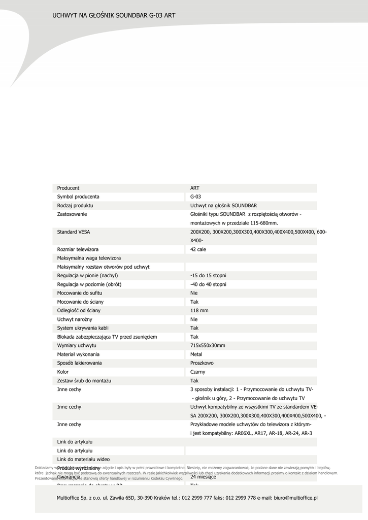 UCHWYT NA GŁOŚNIK SOUNDBAR G-03 ART Producent ART Symbol producenta G-03 Rodzaj produktu Uchwyt na głośnik SOUNDBAR Zastosowanie Głośniki typu SOUNDBAR z rozpiętością otworów montażowych w przedziale 115-680mm. Standard VESA 200X200, 300X200,300X300,400X300,400X400,500X400, 600X400- Rozmiar telewizora 42 cale Maksymalna waga telewizora Maksymalny rozstaw otworów pod uchwyt Regulacja w pionie (nachył) -15 do 15 stopni Regulacja w poziomie (obrót) -40 do 40 stopni Mocowanie do sufitu Nie Mocowanie do ściany Tak Odległość od ściany 118 mm Uchwyt narożny Nie System ukrywania kabli Tak Blokada zabezpieczająca TV przed zsunięciem Tak Wymiary uchwytu 715x550x30mm Materiał wykonania Metal Sposób lakierowania Proszkowo Kolor Czarny Zestaw śrub do montażu Tak Inne cechy 3 sposoby instalacji: 1 - Przymocowanie do uchwytu TV- głośnik u góry, 2 - Przymocowanie do uchwytu TV Inne cechy Uchwyt kompatybilny ze wszystkimi TV ze standardem VESA 200X200, 300X200,300X300,400X300,400X400,500X400, - Inne cechy Przykładowe modele uchwytów do telewizora z którymi jest kompatybilny: AR06XL, AR17, AR-18, AR-24, AR-3 Link do artykułu Link do artykułu Link do materiału wideo Dokładamy wszelkich starań aby podane zdjęcie i opis były w pełni prawidłowe i kompletne. Niestety, nie możemy zagwarantować, że podane dane nie zawierają pomyłek i błędów, Produkt wyróżniony które jednak nie mogą być podstawą do ewentualnych roszczeń. W razie jakichkolwiek wątpliwości lub chęci uzyskania dodatkowych informacji prosimy o kontakt z działem handlowym. 24 miesiące PrezentowaneGwarancja informacje nie stanowią oferty handlowej w rozumieniu Kodeksu Cywilnego. Dopuszczenie do obrotu w RP Tak Kraj pochodzenia Chiny Multioffice Sp. z o.o. ul. Zawiła 65D, 30-390 Kraków tel.: 012 2999 777 faks: 012 2999 778 e-mail: [email protected]
