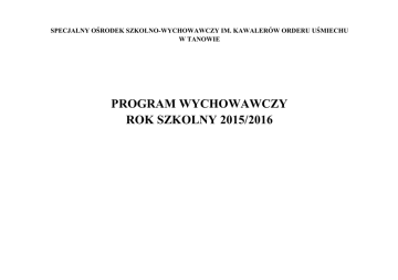 SPECJALNY OŚRODEK SZKOLNO-WYCHOWAWCZY IM. KAWALERÓW ORDERU UŚMIECHU W TANOWIE PROGRAM WYCHOWAWCZY ROK SZKOLNY 2015/2016 „W wychowaniu chodzi właśnie o to, ażeby człowiek stawał się coraz bardziej człowiekiem - o to, ażeby bardziej był, a nie tylko więcej miał; aby więc poprzez wszystko, co ma, co posiada, umiał bardziej i pełniej być człowiekiem, to znaczy, ażeby również umiał bardziej być nie tylko z drugimi, ale i dla drugich.” (z przemówienia Ojca Świętego Jana Pawła II wygłoszonego w UNESCO – 1980 r.) 2 Na podstawie Ustawy z dnia 20 lutego 2015 r. o zmianie ustawy o systemie oświaty oraz niektórych innych ustaw (Dz.U. z 2015 r. poz. 357) oraz Rozporządzenia Ministra Edukacji Narodowej z dnia 24 lipca 2015 r. w sprawie warunków organizowania kształcenia, wychowania i opieki dla dzieci i młodzieży niepełnosprawnych, niedostosowanych społecznie i zagrożonych niedostosowaniem społecznym (Dz. U. z 2015 r. poz. 1113) i na podstawie Rozporządzenia Ministra Edukacji Narodowej z dnia 18.08.2015 r. (Dz. U. z 2015 r. poz. 1249) w sprawie zakresu i form prowadzenia w szkołach i placówkach systemu oświaty działalności wychowawczej, edukacyjnej, informacyjnej i profilaktycznej w celu przeciwdziałania narkomani opracowano niniejszy program wychowawczy: DIAGNOZA PROBLEMU W pracy z uczniem z niepełnosprawnością intelektualną wychowanie staje się równoważne z nauczaniem, a w niektórych momentach nawet ważniejsze niż zdobycie przez uczniów określonych wiadomości. Wzmocnienie wychowawczej roli szkoły wymaga opracowania wielu dokumentów uwzględniających wychowanie jako ważny kierunek oddziaływań szkoły. Jednym z takich dokumentów jest program wychowawczy, który opisuje w sposób całościowy wszystkie treści i działania o charakterze wychowawczym i ma być realizowany przez wszystkich nauczycieli i wychowawców. Szkoła i nauczyciele stają się ogniwem wspierającym i uzupełniającym rodzinę w dziedzinie wychowania, a kierunek tej działalności wychowawczej musi być zgodny z wolą rodziców i wytycznymi MEN. Oddziaływania wychowawcze opracowane są dla uczniów Przedszkola, Szkoły Podstawowej, Gimnazjum i Szkoły Przysposabiającej do Pracy i realizowane będą podczas wszystkich zajęć szkolnych oraz w grupach wychowawczych w ramach pracy Ośrodka, we współpracy ze środowiskiem lokalnym, władzami samorządowymi oraz rodzicami i prawnymi opiekunami wychowanków. W pracy z dziećmi z niepełnosprawnością intelektualną cele wychowania i nauczania traktujemy łącznie, określając je także jako cele edukacji lub cele rewalidacji. Głównym zadaniem Ośrodka jest szeroko rozumiana rewalidacja uczniów z niepełnosprawnością intelektualną, która przyczynia się do ich wszechstronnego rozwoju na miarę możliwości indywidualnych oraz przygotowuje ich do codziennego życia tak, by byli zaradni, umieli sterować własnym zachowaniem i by mogli uczestniczyć w życiu społecznym. Działania dydaktyczne, wychowawcze i opiekuńcze nauczycieli i wychowawców opierają się na następujących założeniach: 1. 2. 3. 4. Zapewnienie bezpieczeństwa osobistego, a także ochrony zdrowia psychicznego i fizycznego uczniów. Tworzenie warunków niezbędnych dla wszechstronnego rozwoju każdego ucznia. Właściwa organizacja procesu dydaktycznego. Tworzenie warunków do rozwijania indywidualnych uzdolnień uczniów. 3 5. Wdrażanie uczniów do życia społecznego. 6. Realizowanie działalności rewalidacyjnej. 7. Zapewnienie spójnej organizacji wszelkich działań i zajęć prowadzonych w klasach i grupach wychowawczych. 8. Przygotowanie uczniów i wychowanków do samodzielnego życia na miarę ich indywidualnych możliwości psychofizycznych. 9. Motywowanie rodziców do aktywnego udziału w kontynuowaniu założeń programu wychowawczego w domu rodzinnym. 10. Skoordynowanie oddziaływań domu, szkoły, internatu i środowiska społecznego. 11. Zachowanie zgodności poczynań wychowawczych z zasadami i celami przyjętymi w niniejszym programie jest obowiązkiem każdego nauczyciela i wychowawcy Ośrodka Szkolno-Wychowawczego im. Kawalerów Orderu Uśmiechu w Tanowie. Za podstawową metodę wpajania wychowankom pożądanych sposobów postępowania uznaje się ukazywanie wartości poprzez własne postawy nauczyciela i wychowawców, jako niewerbalną metodę oddziaływania wychowawczego. ZASADY WYCHOWANIA Podstawową zasadą, na której oparto system wychowawczy w SOSW im. Kawalerów Orderu Uśmiechu w Tanowie, jest akceptacja ucznia z niepełnosprawnością intelektualną jako pełnowartościowego człowieka. Praca wychowawcza nauczycieli i wychowawców opiera się na następujących zasadach szczegółowych, których przestrzeganie tworzy właściwy klimat wychowawczy całego szeroko rozumianego procesu edukacji: 1. Zaakceptowanie dziecka wraz z jego ograniczeniami i indywidualnymi potrzebami. 2. Traktowanie wychowanka jako podmiotu wychowania i uwzględnianie jego całokształtu jego możliwości, potrzeb i oczekiwań, liczenie się z jego zdaniem i szanowanie jego praw, zwłaszcza prawa do rozwoju we własnym tempie oraz pomaganie mu w dokonywaniu przez niego wyborów. 3. Analizowanie podejmowanych działań wychowawczych wynikających z nich zmian w funkcjonowaniu dziecka. 4. Przestrzeganie zasady systematyczności i konsekwencji we wszelkich podjętych działaniach jako warunku prawidłowego przebiegu procesu wychowania. 4 5. Uwzględnienia w wychowaniu osób niepełnosprawnych osób z otoczenia społecznego dziecka, zwłaszcza rodziny i najbliższego dziecku kręgu. Uwzględnianie potrzeb, możliwości i oczekiwań tych osób, tak by nie czuły się przeciążone i aby nie prowadziło to do działań sprzecznych z przyjętym modelem wychowania. Podejmowanie działań obiektywnie realnych i akceptowanych przez rodzinę dziecka. 6. Podejmowanie działań w oparciu o powszechnie uznane w naszej kulturze zasady etyczne, takie