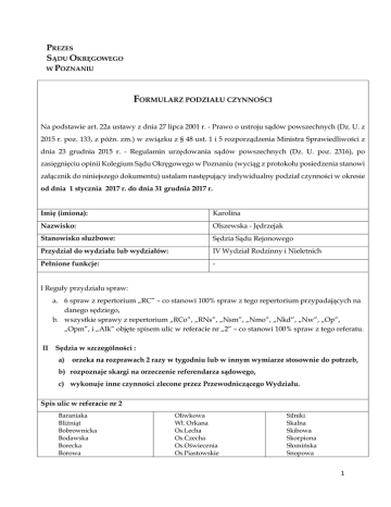 PREZES SĄDU OKRĘGOWEGO W POZNANIU FORMULARZ PODZIAŁU CZYNNOŚCI Na podstawie art. 22a ustawy z dnia 27 lipca 2001 r. - Prawo o ustroju sądów powszechnych (Dz. U. z 2015 r. poz. 133, z późn. zm.) w związku z § 48 ust. 1 i 5 rozporządzenia Ministra Sprawiedliwości z dnia 23 grudnia 2015 r. - Regulamin urzędowania sądów powszechnych (Dz. U. poz. 2316), po zasięgnięciu opinii Kolegium Sądu Okręgowego w Poznaniu (wyciąg z protokołu posiedzenia stanowi załącznik do niniejszego dokumentu) ustalam następujący indywidualny podział czynności w okresie od dnia 1 stycznia 2017 r. do dnia 31 grudnia 2017 r. Imię (imiona): Karolina Nazwisko: Olszewska - Jędrzejak Stanowisko służbowe: Sędzia Sądu Rejonowego Przydział do wydziału lub wydziałów: IV Wydział Rodzinny i Nieletnich Pełnione funkcje: - I Reguły przydziału spraw: a. 6 spraw z repertorium „RC” – co stanowi 100% spraw z tego repertorium przypadających na danego sędziego, b. wszystkie sprawy z repertorium „RCo”, „RNs”, „Nsm”, „Nmo”, „Nkd”, „Nw”, „Op”, „Opm”, i „Alk” objęte spisem ulic w referacie nr „2” – co stanowi 100% spraw z tego referatu. II Sędzia w szczególności : a) orzeka na rozprawach 2 razy w tygodniu lub w innym wymiarze stosownie do potrzeb, b) rozpoznaje skargi na orzeczenie referendarza sądowego, c) wykonuje inne czynności zlecone przez Przewodniczącego Wydziału. Spis ulic w referacie nr 2 Baraniaka Bliźniąt Bobrownicka Bodawska Borecka Borowa Oliwkowa Wł. Orkana Os.Lecha Os.Czecha Os.Oświecenia Os.Piastowskie Silniki Skalna Skibowa Skorpiona Słomińska Snopowa 1 Bruzdowa Brzoskwiniowa Centaura Chotomińska Chorzowska Chrzanowska Darzyńska Dereniowa Dębicka Dobrepole Dolska Franowo Garaszewo Gardowska Glebowa Gminna Gorlicka Gospodarska Gościnna Jagodowa Janowska Jarosławska Jastrzębia Jemielińska Jeżynowa Juracka Iłowka Kaliska Klenowska Kłońska Kobylepole Koziorożca Krzesiny Krzywoustego Bolesława Leżajska Lubelska Lwa Łabędzka Łopawska Łosiowa Łuczkowska Ługańska Majakowskiego Mielecka Mohańska Morwowa Nad Krzesinką Na Dołku Nad Łężynką Nad Pokrzywką Nad Spławką Na Skarpie Nawrot Obrzyca Okólna Os.Przemysława Os.Rusa Os.Tysiąclecia Ostrowska Owocowa Pabianicka Panny E.Piaseckiego Piaśnicka J. Pietrusińskiego Piłsudskiego Piwna E. Plater Plonowa Podjaryszki Podmokła Pokrzywno Polanka Poniecka Poprzeczna Porzeczkowa Poznańskie Sady Pruszkowska Prużańska Przedpole Przełęcz- od 36 do końca parzyste i od początku do końca wszystkie nieparzyste Przełom Przemyska Przeskok J. Przybylskiego Przyjemna Raka Rakietowa Reknicka Radawska Rawicka- od 41 nieparzyste do końca i od 44 parzyste do końca M. Rejewskiego Ropczyńska Roślinna Rudzka Ryb Rymanowska Rysia Sanocka Salicka Sarbinowska S. Sempołowskiej Serdeczna Sierpowa Siewierska Sosnowa Sowice Spławie Stalowa W. Stefańskiego Stewnicka Strzelca Strzyżowska H. Sucharskiego Szamocińska Szczytnicka Szpaków L. Szenwalda Szwajcarska Szubkińska Śliwkowa Śmiała Śmiełowska Śmigli Śremska Świątniczki Święciańska Tarnowska Ternicka Torowa Truskawkowa H. Ułaszyna Uprawna Urszulanek Ustrzycka Wagi Wiatraczna Widawska Wielichowska Wieprawska Wiewiórcza Winiarskiego Wioślarska Fr. Witaszka Wodnika J. Wojkiewicza Wołkowyska St. Worcela W. Wróblewskiego Wybieg Wygon Zabrzańska Zajęcza Wł. Zamojskiego Zawiertowska Zodiakowa Żelazna Żerkowska Żlebowa Żyzna 2 Zasady zastępstw: Zastępowana przez SSR Bartosza Sadurę Zastępuje SSR Bartosza Sadurę Uzasadnienie reguły przydziału spraw a. w repertorium „RC” każdy sędzia ma przydzielone 6 kolejnych spraw wg. kolejności ich wpływu b. przydział pozostałych sprawy odbywa się wg spisu ulic przydzielonych do danego referatu. Przydział spraw określony ulicami ma na celu skupienie u jednego sędziego spraw danej rodziny, co wpływa na lepsze rozeznanie jej problemów oraz lepszą znajomość prowadzonych postępowań, co z kolei przyspiesza rozpoznanie sprawy Dodatkowe obciążenia oraz ich wymiar (np. dyżury aresztowe, dyżury sędziów rodzinnych, koordynatorzy): a) współpracuje z kuratorami zawodowymi i społecznymi z rejonu, b) pełni dyżury związane z nagłymi sprawami nieletnich oraz psychiatrycznymi w dni wolne od pracy w terminach i na warunkach ustalonych według osobnego harmonogramu zatwierdzonego przez Prezesa Sądu Rejonowego Poznań-Nowe Miasto i Wilda w Poznaniu, c) pełni dyżury raz w tygodniu celem zastępstwa sędziów na wokandach i przy wysłuchaniu nieletnich oraz załatwia wówczas sprawy interwencyjne, d) sprawuje nadzór nad sposobem i trybem legalności przyjęcia i przebywania osób z zaburzeniami psychicznymi w Domu Pomocy Społecznej w Poznaniu przy ul. Św. Rocha 13, 17.11.2016 (data) Prezes SO Poznań /-/ SSA Henryk Komisarski (podpis prezesa sądu) 3