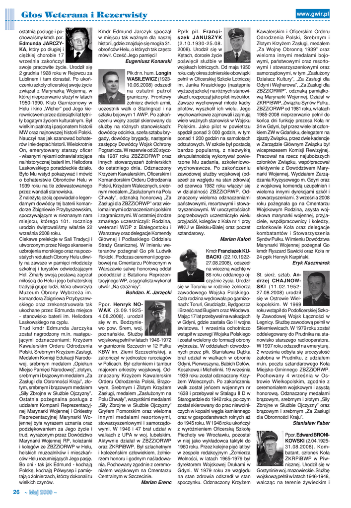 G³os Weterana i Rezerwisty ostatnią posługę i pochowaliśmy kmdr. por. Edmunda JARCZYKA, który po długiej i ciężkiej chorobie 17 września zakończył swoje pracowite życie. Urodził się 2 grudnia 1928 roku w Rejowcu za Lublinem i tam dorastał. Po ukończeniu szkoły oficerskiej swoje życie związał z Marynarką Wojenną, w której nieprzerwanie służył w latach 1950-1990. Klub Garnizonowy w Helu i kino „Wicher” pod Jego kierownictwem przez dziesiątki lat tętniły bogatym życiem kulturalnym. Był wielkim patriotą i pasjonatem historii MW oraz najnowszej historii Polski. Nauczył nas jak szanować bohaterów i nie deptać historii. Wielokrotnie On, emerytowany starszy oficer - własnymi rękami odnawiał stojące na historycznej baterii im. Heliodora Laskowskiego poradzieckie działo. Było Mu wstyd pokazywać i mówić o bohaterstwie Obrońców Helu w 1939 roku na tle zdewastowanego przez wandali stanowiska. Z należytą czcią opowiadał o legendarnym dowódcy tej baterii komandorze Zbigniewie Przybyszewskim, spoczywającym w nieznanym nam miejscu, którego 101. rocznicę urodzin świętowaliśmy właśnie 22 września 2008 roku. Ciekawe prelekcje w Sali Tradycji i utworzonym przez Niego skansenie uzbrojenia morskiego oraz na pozostałych redutach Obrony Helu utkwiły na zawsze w pamięci młodzieży szkolnej i turystów odwiedzającym Hel. Zmarły swoją postawą zagrzał miłością do Helu i jego bohaterskiej tradycji grupę ludzi, która utworzyła Muzeum Obrony Wybrzeża im. komandora Zbigniewa Przybyszewskiego oraz zrekonstruowała tak ukochane przez Edmunda miejsce - stanowisko baterii im. Heliodora Laskowskiego na cyplu. Trud kmdr Edmunda Jarczyka został nagrodzony m.in. następującymi odznaczeniami: Krzyżem Kawalerskim Orderu Odrodzenia Polski, Srebrnym Krzyżem Zasługi, Medalem Komisji Edukacji Narodowej, srebrnym medalem „Opiekun Miejsc Pamięci Narodowej”, złotym, srebrnym i brązowym medalem „Za Zasługi dla Obronności Kraju”, złotym, srebrnym i brązowym medalem „Siły Zbrojne w Służbie Ojczyzny”. Ostatnia pożegnalna posługa z udziałem Kompanii Reprezentacyjnej Marynarki Wojennej i Orkiestry Reprezentacyjnej Marynarki Wojennej była wyrazem uznania oraz podziękowaniem za Jego życie i trud, wyrażonym przez Dowództwo Marynarki Wojennej RP, koleżanki i kolegów ze ZBŻZiORWP w Helu, helskich muzealników i mieszkańców Helu rozumiejących Jego pasję. Bo oni - tak jak Edmund - kochają Polskę, kochają Półwysep i pamiętają o żołnierzach, którzy dokonali tu wielkich czynów. 26 ~ Maj 2009 ~ Kmdr Edmund Jarczyk spoczął w miejscu tak ważnym dla naszej historii, gdzie znajduje się mogiła 31. obrońców Helu, o których tak często mówił. Cześć Jego pamięci! Eugeniusz Konarski Płk dr n. hum. Longin WASILEWICZ (192310.06.2008) odszedł na ostatni patrol graniczny. Frontowy żołnierz dwóch armii, uczestnik walk o Stalingrad i na szlaku bojowym 1 AWP. Po zakończeniu wojny został skierowany do służby na różnych stanowiskach: dowódcy odcinka, szefa sztabu brygady, dowódcy brygady, następnie zastępcy Dowódcy Wojsk Ochrony Pogranicza. W rezerwie od 20 stycznia 1987 roku ZBŻZiORWP oraz innych stowarzyszeń żołnierskich do ostatniego dnia. Odznaczony Krzyżem Kawalerskim, Oficerskim i Komandorskim Orderu Odrodzenia Polski, Krzyżem Walecznych, srebrnym medalem „Zasłużonym na Polu Chwały”, odznaką honorową „Za Zasługi dla ZBŻZiORWP” oraz wieloma innymi odznaczeniami polskim i zagranicznymi. W ostatniej drodze zmarłego uczestniczyli: Rodzina, weterani WOP z Białegostoku i Warszawy oraz delegacje Komendy Głównej i Podlaskiego Oddziału Straży Granicznej. W imieniu weteranów pożegnał Go płk Ludwik Rokicki. Podczas ceremonii pogrzebowej na Cmentarzu Północnym w Warszawie salwę honorową oddał pododdział z Batalionu Reprezentacyjnego WP, a sygnalista wykonał utwór „Na strażnicy”. Bohdan. K. Jarzęcki Ppor. Henryk NOWAK (3.09.19254.08.2008). urodził się w m. Bodzyniewo pow. Śrem, woj. poznańskie. Służbę wojskową pełnił w latach 1946-1972 w garnizonie Szczecin w 12 Pułku KBW im. Ziemi Szczecińskiej, a zakończył w jednostce rurociągów w Policach. Był członkiem i tambur majorem orkiestry wojskowej. Odznaczony Krzyżem Kawalerskim Orderu Odrodzenia Polski, Brązowym, Srebrnym i Złotym Krzyżem Zasługi, medalem „Zasłużonym na Polu Chwały”, wszystkimi medalami „Siły Zbrojne w Służbie Ojczyzny” Gryfem Pomorskim oraz wieloma innymi medalami resortowymi, stowarzyszeniowymi i samorządowymi. W 1946 i 47 brał udział w walkach z UPA w woj. lubelskim. Aktywnie działał w ZBŻZiORWP oraz ZKRPiBWP. Był szlachetnym i koleżeńskim człowiekiem, żołnierzem honoru i godnym naśladowania. Pochowany zgodnie z ceremoniałem wojskowym na Cmentarzu Centralnym w Szczecinie. Marian Erenc www.gwir.pl Ppłk pil. Franciszek JANUSZYK (2.10.1930-25.08. 2008). Urodził się w Kętach, dorosłe życie poświęcił służbie w wojskach lotniczych. Od maja 1950 roku cały okres żołnierskie obowiązki pełnił w Oficerskiej Szkole Lotniczej im. Janka Krasickiego (następnie wyższej szkole) na różnych stanowiskach, rozpoczął jako pilot-instruktor. Zawsze wychowywał młode kadry pilotów, wyszkolił ich wielu. Jego wychowankowie zajmowali i zajmują wiele ważnych stanowisk w Wojsku Polskim. Jako pilot w powietrzu spędził ponad 3 000 godzin, w tym ponad 1 200 godzin na samolotach odrzutowych. W szkole był postacią bardzo popularną, z niezwykłą skrupulatnością wykonywał powierzone Mu zadania, szkoleniowowychowawcze. Po zakończeniu zawodowej służby wojskowej (odszedł ze względu na stan zdrowia) od czerwca 1982 roku włączył się w działalność ZBŻZiORWP. Odznaczony wieloma odznaczeniami państwowymi, resortowymi i stowarzyszeniowymi. W uroczystościach pogrzebowych uczestniczyło wielu przyjaciół, kolegów z Koła nr 1 przy WKU w Bielsku-Białe