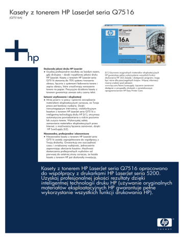 Kasety z tonerem HP LaserJet seria Q7516 (Q7516A) Doskonała jakość druku HP LaserJet ● Uzyskaj profesjonalne rezultaty za każdym razem, gdy drukujesz – dzięki wyjątkowej jakości druku HP LaserJet. Kasety z tonerem HP LaserJet seria Q7516 stanowią do 70% systemu tworzenia obrazu, łącznie z systemami ładowania tonera i zapisu obrazu, które umożliwiają nanoszenie tonera na papier. Precyzyjne działanie kasety z tonerem gwarantuje zawsze ostry czarny tekst. [k1] Używanie oryginalnych materiałów eksploatacyjnych HP gwarantuje pełne wykorzystanie wszystkich funkcji drukowania HP. [k2] Zasady i dostępność programu mogą być różne dla poszczególnych krajów. Więcej informacji można znaleźć pod adresem www.hp.com/learn/suresupply. Łączenie zamówień dostępne w przypadku drukarek z zainstalowanym oprogramowaniem HP Easy Printer Care. Łatwość użytkowania i eksploatacji ● Mniej przerw w pracy i sprawne zarządzanie materiałami eksploatacyjnymi oznacza, że Twoja praca jest bardziej wydajna. Dzięki niewymagającym interwencji, wielofunkcyjnym kasetom z tonerem HP LaserJet seria Q7516 z inteligentną technologią druku HP [k1], otrzymasz automatyczne powiadomienia o niskim poziomie lub zużyciu tonera. Wykorzystaj zalety zamawiania materiałów eksploatacyjnych przez Internet, z możliwością łączenia zamówień, dzięki HP SureSupply [k2]. Niezawodne, profesjonalne i ekonomiczne ● Niezawodne kasety z tonerem HP LaserJet seria Q7516 zostały zaprojektowane do współpracy z Twoją drukarką. Gwarantują one oszczędność czasu i zwiększoną wydajność, jednocześnie zapewniając obniżenie kosztów. Możliwość dostarczenia profesjonalnych wydruków od pierwszej do ostatniej strony oznacza, że każda kaseta z tonerem HP jest doskonałą inwestycją. Kasety z tonerem HP LaserJet seria Q7516 opracowano do współpracy z drukarkami HP LaserJet seria 5200. Uzyskaj profesjonalnej jakości rezultaty dzięki inteligentnej technologii druku HP (używanie oryginalnych materiałów eksploatacyjnych HP gwarantuje pełne wykorzystanie wszystkich funkcji drukowania HP). Kasety z tonerem HP LaserJet seria Q7516 Właściwości techniczne ● Niezawodne kasety z tonerem HP stanowią do 70% systemu tworzenia obrazu, dzięki czemu gwarantują wydruki na niezmiennym poziomie. ● Oryginalny toner HP i system druku HP – opracowane razem, aby zapewnić precyzyjne nanoszenie tonera i wyraźne wydruki ● Inteligentna technologia druku HP kontroluje ładowanie cząsteczek tonera, zapewniając niezmienne rezultaty* ● Wielofunkcyjna kaseta z tonerem HP – kaseta z tonerem, toner oraz bęben obrazowy w jednym zestawie. ● Proste zarządzanie materiałami eksploatacyjnymi dzięki inteligentnej technologii druku HP* i procedurze HP SureSupply**. * Używanie oryginalnych materiałów eksploatacyjnych HP gwarantuje pełne wykorzystanie wszystkich funkcji drukowania HP. ** Zasady i dostępność programu mogą być różne dla poszczególnych krajów. Więcej informacji można znaleźć pod adresem www.hp.com/learn/suresupply. Łączenie zamówień dostępne w przypadku drukarek z zainstalowanym oprogramowaniem HP Easy Printer Care. Dane techniczne produktu P/N Q7516A Opis Kaseta z czarnym tonerem HP LaserJet Q7516A Kod UPC 8-29160-75504-5 Wymiary (dł x szer x gł) 497 x 195 x 330 mm © Copyright 2006 Hewlett-Packard Development Company, L.P. Specyfikacje zawarte w tym dokumencie mogą bez uprzedzenia ulec zmianie. Wszystkie gwarancje udzielane w odniesieniu do produktów i usług HP określone zostały w oświadczeniach gwarancyjnych załączanych do każdego produktu i usługi. Żaden zapis niniejszego dokumentu nie może być uważany za dodatkową gwarancję. HP nie ponosi odpowiedzialności za błędy techniczne lub drukarskie w niniejszym dokumencie. Aby uzyskać więcej informacji na temat materiałów konsumpcyjnych HP, odwiedź http://www.hp.com 4AA0-4252PLE, 03/06 Waga 2,7 kg Średnia wydajność kasety z tonerem 12 000 stron zgodnie z ISO/IEC 19752