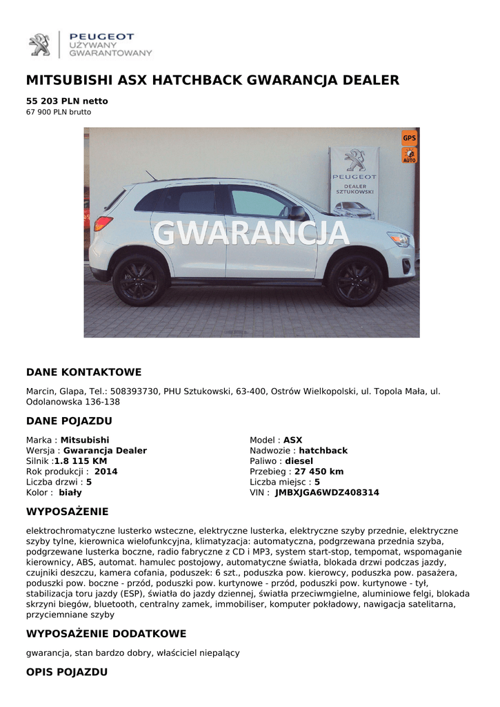 MITSUBISHI ASX HATCHBACK GWARANCJA DEALER