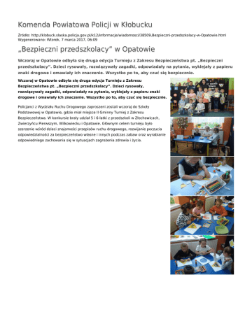 Komenda Powiatowa Policji w Kłobucku Źródło: http://klobuck.slaska.policja.gov.pl/k12/informacje/wiadomosci/38509,Bezpieczni-przedszkolacy-w-Opatowie.html Wygenerowano: Wtorek, 7 marca 2017, 06:09 „Bezpieczni przedszkolacy” w Opatowie Wczoraj w Opatowie odbyła się druga edycja Turnieju z Zakresu Bezpieczeństwa pt. „Bezpieczni przedszkolacy”. Dzieci rysowały, rozwiązywały zagadki, odpowiadały na pytania, wyklejały z papieru znaki drogowe i omawiały ich znaczenie. Wszystko po to, aby czuć się bezpiecznie. Wczoraj w Opatowie odbyła się druga edycja Turnieju z Zakresu Bezpieczeństwa pt. „Bezpieczni przedszkolacy”. Dzieci rysowały, rozwiązywały zagadki, odpowiadały na pytania, wyklejały z papieru znaki drogowe i omawiały ich znaczenie. Wszystko po to, aby czuć się bezpiecznie. Policjanci z Wydziału Ruchu Drogowego zaproszeni zostali wczoraj do Szkoły Podstawowej w Opatowie, gdzie miał miejsce II Gminny Turniej z Zakresu Bezpieczeństwa. W konkursie brały udział 5 i 6-latki z przedszkoli w Złochowicach, Zwierzyńcu Pierwszym, Wilkowiecku i Opatowie. Głównym celem turnieju było szerzenie wśród dzieci znajomości przepisów ruchu drogowego, rozwijanie poczucia odpowiedzialności za bezpieczeństwo własne i innych podczas zabaw oraz wyrabianie odpowiedniego zachowania się w sytuacjach zagrożenia zdrowia i życia. Ocena: 0/5 (0) Tweetnij