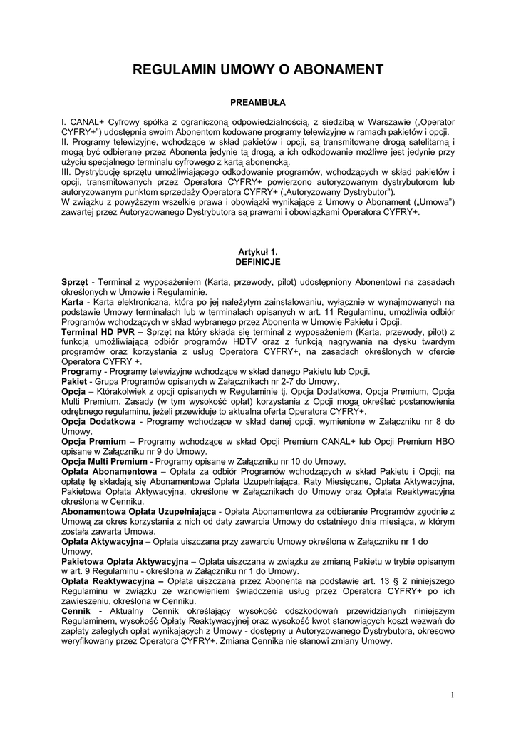 REGULAMIN UMOWY O ABONAMENT PREAMBUŁA I. CANAL+ Cyfrowy spółka z ograniczoną odpowiedzialnością, z siedzibą w Warszawie („Operator CYFRY+”) udostępnia swoim Abonentom kodowane programy telewizyjne w ramach pakietów i opcji. II. Programy telewizyjne, wchodzące w skład pakietów i opcji, są transmitowane drogą satelitarną i mogą być odbierane przez Abonenta jedynie tą drogą, a ich odkodowanie możliwe jest jedynie przy użyciu specjalnego terminalu cyfrowego z kartą abonencką. III. Dystrybucję sprzętu umożliwiającego odkodowanie programów, wchodzących w skład pakietów i opcji, transmitowanych przez Operatora CYFRY+ powierzono autoryzowanym dystrybutorom lub autoryzowanym punktom sprzedaży Operatora CYFRY+ („Autoryzowany Dystrybutor”). W związku z powyższym wszelkie prawa i obowiązki wynikające z Umowy o Abonament („Umowa”) zawartej przez Autoryzowanego Dystrybutora są prawami i obowiązkami Operatora CYFRY+. Artykuł 1. DEFINICJE Sprzęt - Terminal z wyposażeniem (Karta, przewody, pilot) udostępniony Abonentowi na zasadach określonych w Umowie i Regulaminie. Karta - Karta elektroniczna, która po jej należytym zainstalowaniu, wyłącznie w wynajmowanych na podstawie Umowy terminalach lub w terminalach opisanych w art. 11 Regulaminu, umożliwia odbiór Programów wchodzących w skład wybranego przez Abonenta w Umowie Pakietu i Opcji. Terminal HD PVR – Sprzęt na który składa się terminal z wyposażeniem (Karta, przewody, pilot) z funkcją umożliwiającą odbiór programów HDTV oraz z funkcją nagrywania na dysku twardym programów oraz korzystania z usług Operatora CYFRY+, na zasadach określonych w ofercie Operatora CYFRY +. Programy - Programy telewizyjne wchodzące w skład danego Pakietu lub Opcji. Pakiet - Grupa Programów opisanych w Załącznikach nr 2-7 do Umowy. Opcja – Którakolwiek z opcji opisanych w Regulaminie tj. Opcja Dodatkowa, Opcja Premium, Opcja Multi Premium. Zasady (w tym wysokość opłat) korzystania z Opcji mogą określać postanowienia odrębnego regulaminu, jeżeli przewiduje to aktualna oferta Operatora CYFRY+. Opcja Dodatkowa - Programy wchodzące w skład danej opcji, wymienione w Załączniku nr 8 do Umowy. Opcja Premium – Programy wchodzące w skład Opcji Premium CANAL+ lub Opcji Premium HBO opisane w Załączniku nr 9 do Umowy. Opcja Multi Premium - Programy opisane w Załączniku nr 10 do Umowy. Opłata Abonamentowa – Opłata za odbiór Programów wchodzących w skład Pakietu i Opcji; na opłatę tę składają się Abonamentowa Opłata Uzupełniająca, Raty Miesięczne, Opłata Aktywacyjna, Pakietowa Opłata Aktywacyjna, określone w Załącznikach do Umowy oraz Opłata Reaktywacyjna określona w Cenniku. Abonamentowa Opłata Uzupełniająca - Opłata Abonamentowa za odbieranie Programów zgodnie z Umową za okres korzystania z nich od daty zawarcia Umowy do ostatniego dnia miesiąca, w którym została zawarta Umowa. Opłata Aktywacyjna – Opłata uiszczana przy zawarciu Umowy określona w Załączniku nr 1 do Umowy. Pakietowa Opłata Aktywacyjna – Opłata uiszczana w związku ze zmianą Pakietu w trybie opisanym w art. 9 Regulaminu - określona w Załączniku nr 1 do Umowy. Opłata Reaktywacyjna – Opłata uiszczana przez Abonenta na podstawie art. 13 § 2 niniejszego Regulaminu w związku ze wznowieniem świadczenia usług przez Operatora CYFRY+ po ich zawieszeniu, określona w Cenniku. Cennik - Aktualny Cennik określający wysokość odszkodowań przewidzianych niniejszym Regulaminem, wysokość Opłaty Reaktywacyjnej oraz wysokość kwot stanowiących koszt wezwań do zapłaty zaległych opłat wynikających z Umowy - dostępny u Autoryzowanego Dystrybutora, okresowo weryfikowany przez Operatora CYFRY+. Zmiana Cennika nie stanowi zmiany Umowy. 1 Artykuł 2. STRONY UMOWY, OBOWIĄZKI OPERATORA CYFRY+ § 1. Umowa zawierana jest przez Autoryzowanego Dystrybutora lub innego upoważnionego przedstawiciela Operatora CYFRY+ z jednej strony, działającego w imieniu i na rzecz Operatora CYFRY+ oraz, z drugiej strony, przez Abonenta, tj. osobę zamierzającą korzystać z wybranego w Umowie Pakietu oraz wybranej Opcji dla osobistego użytku. § 2. Operator CYFRY+ zobowiązuje się do rozprowadzania do Abonenta Programów wchodzących w skład wybranego w Umowie Pakietu oraz wybranej Opcji, z zastrzeżeniem art. 7 Regulaminu. § 3. Umowa dotycząca danej, określonej w Umowie, Opcji Dodatkowej może być zawarta wyłącznie: (a) razem z Umową na odbiór Pakietu, przy czym w wypadku Pakietu Powitalnego Umowa może być zawarta wyłącznie na odbiór jednej wybranej Opcji Dodatkowej (b) przez Abonenta, posiadającego już Umowę na odbiór Pakietu, przy czym w wypadku Pakietu Powitalnego Umowa może być zawarta wyłącznie na odbiór jednej wybranej Opcji Dodatkowej § 4. Umowa dotycząca danej, określonej w Umowie, Opcji Premium/Opcji Multi Premium może być zawarta wyłącznie: (a) razem z Umową na odbiór Pakietu Tematycznego, Pakietu Podstawowego lub Komfortowego, (b) przez Abonenta, posiadającego już Umowę na odbiór Pakietu Tematycznego, Pakietu Podstawowego lub Komfortowego § 5. W wypadku Abonenta posiadającego Umowę na odbiór Pakietu Powitalnego wnioski na zawarcie Umowy na odbiór więcej niż jednej Opcji Dodatkowej nie będą rozpatrywane przez Operatora CYFRY+. Również wnioski Abonentów składane w trybie opisanym w art. 9 Regulaminu o zmianę posiadanego Pakietu na Pakiet Powitalny łącznie z więcej niż jedną Opcją Dodatkową nie będą rozpatrywane przez Operatora CYFRY+. Artykuł 3. NAJEM SPRZĘTU; OBOWIĄZKI AUTORYZOWANEGO DYSTRYBUTORA § 1. Operator CYFRY+ wynajmuje Abonentowi Sprzęt umożliwiający - po jego należytym zainstalowaniu oraz pod warunkiem posiadania przez Abonenta instalacji i urządzeń odbiorczych umożliwiających współdziałanie ze Sprzętem - odkodowanie i odbiór Programów wchodzących w skład wybranego w Umowie Pakietu oraz wybra
