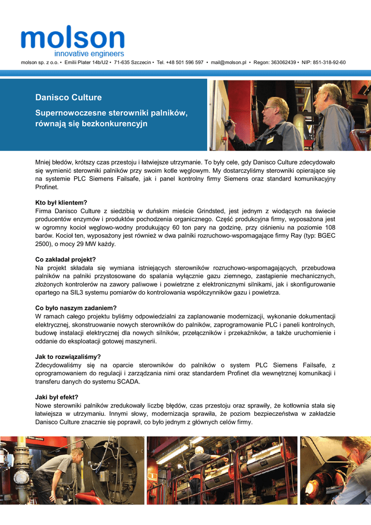 molson sp. z o.o. • Emilii Plater 14b/U2 • 71-635 Szczecin • Tel. +48 501 596 597 • [email protected] • Regon: 363062439 • NIP: 851-318-92-60 Danisco Culture Supernowoczesne sterowniki palników, równają się bezkonkurencyjn Mniej błedów, krótszy czas przestoju i łatwiejsze utrzymanie. To były cele, gdy Danisco Culture zdecydowało się wymienić sterowniki palników przy swoim kotle węglowym. My dostarczyliśmy sterowniki opierające się na systemie PLC Siemens Failsafe, jak i panel kontrolny firmy Siemens oraz standard komunikacyjny Profinet. Kto był klientem? Firma Danisco Culture z siedzibią w duńskim mieście Grindsted, jest jednym z wiodących na świecie producentów enzymów i produktów pochodzenia organicznego. Część produkcyjna firmy, wyposażona jest w ogromny kocioł węglowo-wodny produkujący 60 ton pary na godzinę, przy ciśnieniu na poziomie 108 barów. Kocioł ten, wyposażony jest również w dwa palniki rozruchowo-wspomagające firmy Ray (typ: BGEC 2500), o mocy 29 MW każdy. Co zakładał projekt? Na projekt składała się wymiana istniejących sterowników rozruchowo-wspomagających, przebudowa palników na palniki przystosowane do spalania wyłącznie gazu ziemnego, zastąpienie mechanicznych, złożonych kontrolerów na zawory paliwowe i powietrzne z elektronicznymi silnikami, jak i skonfigurowanie opartego na SIL3 systemu pomiarów do kontrolowania współczynników gazu i powietrza. Co było naszym zadaniem? W ramach całego projektu byliśmy odpowiedzialni za zaplanowanie modernizacji, wykonanie dokumentacji elektrycznej, skonstruowanie nowych sterowników do palników, zaprogramowanie PLC i paneli kontrolnych, budowę instalacji elektrycznej dla nowych silników, przełączników i przekaźników, a także uruchomienie i oddanie do eksploatacji gotowej maszynerii. Jak to rozwiązaliśmy? Zdecydowaliśmy się na oparcie sterowników do palników o system PLC Siemens Failsafe, z oprogramowaniem do regulacji i zarządzania nimi oraz standardem Profinet dla wewnętrznej komunikacji i transferu danych do systemu SCADA. Jaki był efekt? Nowe sterowniki palników zredukowały liczbę błędów, czas przestoju oraz sprawiły, że kotłownia stała się łatwiejsza w utrzymaniu. Innymi słowy, modernizacja sprawiła, że poziom bezpieczeństwa w zakładzie Danisco Culture znacznie się poprawił, co było jednym z głównych celów firmy.