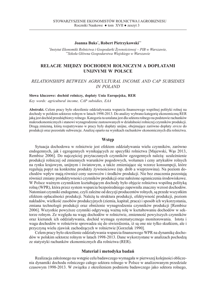 STOWARZYSZENIE EKONOMISTÓW ROLNICTWA I AGROBIZNESU Relacje między dochodem rolniczym a dopłatami unijnymi w Polsce Roczniki Naukowe ● tom XVII ● zeszyt 3 67 Joanna Buks*, Robert Pietrzykowski** Instytut Ekonomiki Rolnictwa i Gospodarki Żywnościowej – PIB w Warszawie, ** Szkoła Główna Gospodarstwa Wiejskiego w Warszawie * RELACJE MIĘDZY DOCHODEM ROLNICZYM A DOPŁATAMI UNIJNYMI W POLSCE RELATIONSHIPS BETWEEN AGRICULTURAL INCOME AND CAP SUBSIDIES IN POLAND Słowa kluczowe: dochód rolniczy, dopłaty Unia Europejska, RER Key words: agricultural income, CAP subsidies, EAA Abstrakt. Celem pracy było określenie oddziaływania wsparcia finansowego wspólnej polityki rolnej na dochody w polskim sektorze rolnym w latach 1998-2013. Do analizy wybrano kategorię ekonomiczną RER jaką jest dochód przedsiębiorcy rolnego. Kategoria ta ustalana jest dla sektora rolnego na podstawie rachunków makroekonomicznych i stanowi wynagrodzenie zastosowanych w działalności rolniczej czynników produkcji. Drugą zmienną, którą rozpatrywano w pracy były dopłaty unijne, obejmujące zarówno dopłaty stricte do produkcji oraz pozostałe subwencje. Analizę oparto na wynikach rachunków ekonomicznych dla rolnictwa. Wstęp Sytuacja dochodowa w rolnictwie jest efektem oddziaływania wielu czynników, zarówno endogennych, jak i egzogennych wynikających ze specyfiki rolnictwa [Majewski, Wąs 2013, Rembisz 2006]. Do najczęściej przytaczanych czynników egzogennych należą: uzależnienie produkcji rolniczej od zmiennych warunków pogodowych, wolumen i ceny artykułów rolnych na rynku krajowym, unijnym i światowym, a także zmieniające się wzorce konsumpcji, które regulują popyt na konkretne produkty żywnościowe (np. drób a wieprzowina). Na poziom dochodów wpływ mają również ceny surowców i środków produkcji. Nie bez znaczenia pozostają również zmiany produktywności czynników produkcji oraz nałożone ograniczenia środowiskowe. W Polsce ważnym czynnikiem kształtującym dochody było objęcie rolnictwa wspólną polityką rolną (WPR), która przez system wsparcia bezpośredniego zapewniła znaczny wzrost dochodów. Natomiast czynniki endogenne, czyli zależne od decyzji producentów rolnych, są przede wszystkim efektem opłacalności produkcji. Należą tu struktura produkcji, efektywność produkcji, poziom nakładów, wielkość zasobów produkcyjnych (ziemia, kapitał, praca) i sposób ich wykorzystania, zmiana technologii produkcji oraz obniżenie wynagrodzenia czynników produkcji [Rembisz 2006]. Wszystkie powyższe czynniki odgrywają ważną rolę w kształtowaniu dochodów w sektorze rolnym. Ze względu na wagę dochodów w rolnictwie, zmienność powyższych czynników oraz kierunek ich oddziaływania, dochód wymaga systematycznego monitorowania. Istota i waga dochodów w rolnictwie sprowadza się do stwierdzenia, iż są one nie tylko skutkiem, ale i przyczyną wielu zjawisk zachodzących w rolnictwie [Gorzelak 1990]. Celem pracy było określenie oddziaływania wsparcia finansowego WPR na dynamikę dochodów w polskim sektorze rolnym w latach 1998-2013. Dane wykorzystane w analizach pochodzą ze statystyki rachunków ekonomicznych dla rolnictwa (RER). Materiał i metodyka badań Realizacja założonego na wstępie celu badawczego wymagała w pierwszej kolejności obliczenia dynamiki dochodu rolniczego całego sektora rolnego w Polsce w analizowanym przedziale czasowym 1998-2013. W związku z określeniem podmiotu badawczego jako sektora rolnego, 68 Joanna Buks, Robert Pietrzykowski dane empiryczne do badania wybrano RER1. RER są rachunkiem satelitarnym w stosunku do rachunków narodowych, tzn. że są ich rozwinięciem i uszczegółowieniem. Wybrane dane do analizy dostarczają informacji na temat całego sektora rolnego, w przeciwieństwie do rachunków narodowych, które tylko częściowo odpowiadają sektorowi rolnictwa, ponieważ dotyczą jedynie podsektora pracodawców i pracujących na własny rachunek w gospodarstwach indywidualnych w rolnictwie [Rocznik statystyczny… 2014]. Na tej podstawie można stwierdzić, że tylko w przybliżeniu rachunki te odpowiadają sektorowi rolnemu [Zegar 2001]. RER są instrumentem wykorzystywanym w statystyce rolniczej przez Eurostat na potrzeby Unii Europejskiej (UE). Charakter makroekonomiczny RER oraz dane dotyczące wielkości i wartości produkcji wytworzonej w rolnictwie w danym roku pozwalają na monitoring dochodów rolnictwa. Cechą charakterystyczną RER jest ujęcie memoriałowe transferów2 związanych ze WPR (zarówno tych związanych, jak i niezwiązanych z produkcją). RER dostarczają zarówno informacji niezbędnych podczas ustalania głównych priorytetów, jak i podejmowania decyzji w ramach WPR WPR. Podstawą prawną, dla sporządzanych RER jest Rozporządzenie (WE) 138/2004 Parlamentu Europejskiego i Rady z dnia 5 grudnia 2003 roku dotyczące rachunków gospodarczych dla rolnictwa we Wspólnocie [DZ.U. L 33/1 z 5.2.2004] będące zasadniczym dokumentem obligującym kraje UE do opracowania RER i jednocześnie określającym zakres i metodę rachunków. W Polsce RER są wykonywane od 1998 roku w Instytucie Ekonomiki Rolnictwa i Gospodarki Żywnościowej – PIB (IERiGŻ-PIB) przy współpracy z Departamentem Statystyki Rolnictwa i Środowiska GUS. Do celów badawczych jako kategorię ekonomiczną RER wybrano dochód przedsiębiorcy rolnego, która jest ich wynikową pozycją. Dochód ten, ustalony dla sektora rolnego na podstawie rachunków makroekonomicznych stanowi wynagrodzenie zastosowanych w działalności rolniczej czynników produkcji. Wybrana kategoria dochodu w krajach, w których dominują gospodarstwa indywidualne stanowi faktyczne wynagrodzenie za zaangażowaną pracę rolnika i jego rodziny, gratyfikację za zaangażowanie w działalność rolniczą gruntów oraz ewentualny zysk z tytułu zaangażowanego kapitału. Poprzez możliwość wyrażenia kategorii dochodu w RER w cenach baz