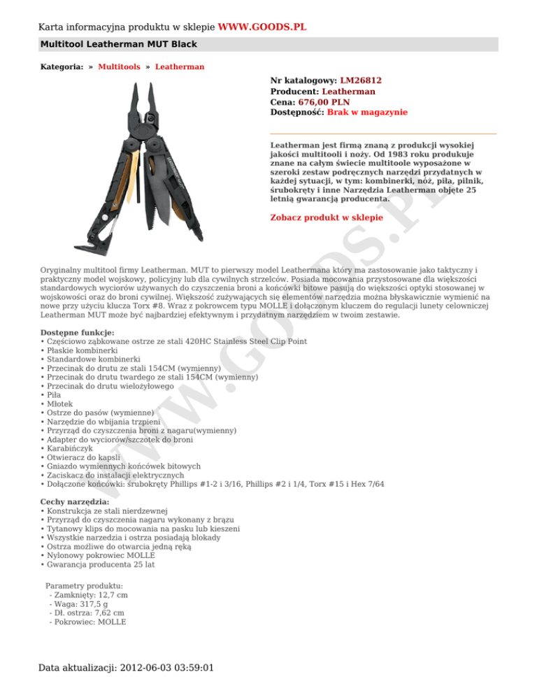 Karta informacyjna produktu w sklepie WWW.GOODS.PL Multitool Leatherman MUT Black Kategoria: » Multitools » Leatherman Nr katalogowy: LM26812 Producent: Leatherman Cena: 676,00 PLN Dostępność: Brak w magazynie S. PL Leatherman jest firmą znaną z produkcji wysokiej jakości multitooli i noży. Od 1983 roku produkuje znane na całym świecie multitoole wyposażone w szeroki zestaw podręcznych narzędzi przydatnych w każdej sytuacji, w tym: kombinerki, nóż, piła, pilnik, śrubokręty i inne Narzędzia Leatherman objęte 25 letnią gwarancją producenta. Zobacz produkt w sklepie O O D Oryginalny multitool firmy Leatherman. MUT to pierwszy model Leathermana który ma zastosowanie jako taktyczny i praktyczny model wojskowy, policyjny lub dla cywilnych strzelców. Posiada mocowania przystosowane dla większości standardowych wyciorów używanych do czyszczenia broni a końcówki bitowe pasują do większości optyki stosowanej w wojskowości oraz do broni cywilnej. Większość zużywających się elementów narzędzia można błyskawicznie wymienić na nowe przy użyciu klucza Torx #8. Wraz z pokrowcem typu MOLLE i dołączonym kluczem do regulacji lunety celowniczej Leatherman MUT może być najbardziej efektywnym i przydatnym narzędziem w twoim zestawie. W W W .G Dostępne funkcje: • Częściowo ząbkowane ostrze ze stali 420HC Stainless Steel Clip Point • Płaskie kombinerki • Standardowe kombinerki • Przecinak do drutu ze stali 154CM (wymienny) • Przecinak do drutu twardego ze stali 154CM (wymienny) • Przecinak do drutu wielożyłowego • Piła • Młotek • Ostrze do pasów (wymienne) • Narzędzie do wbijania trzpieni • Przyrząd do czyszczenia broni z nagaru(wymienny) • Adapter do wyciorów/szczotek do broni • Karabińczyk • Otwieracz do kapsli • Gniazdo wymiennych końcówek bitowych • Zaciskacz do instalacji elektrycznych • Dołączone końcówki: śrubokręty Phillips #1-2 i 3/16, Phillips #2 i 1/4, Torx #15 i Hex 7/64 Cechy narzędzia: • Konstrukcja ze stali nierdzewnej • Przyrząd do czyszczenia nagaru wykonany z brązu • Tytanowy klips do mocowania na pasku lub kieszeni • Wszystkie narzedzia i ostrza posiadają blokady • Ostrza możliwe do otwarcia jedną ręką • Nylonowy pokrowiec MOLLE • Gwarancja producenta 25 lat Parametry produktu: - Zamknięty: 12,7 cm - Waga: 317,5 g - Dł. ostrza: 7,62 cm - Pokrowiec: MOLLE Data aktualizacji: 2012-06-03 03:59:01