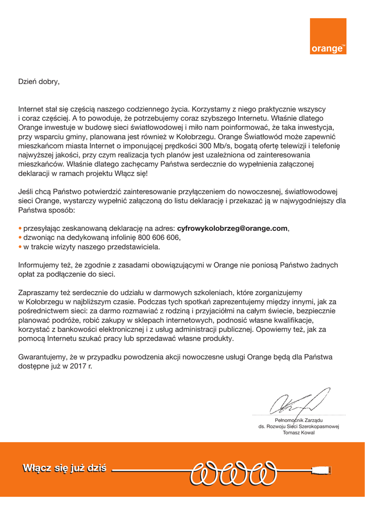 Dzień dobry, Internet stał się częścią naszego codziennego życia. Korzystamy z niego praktycznie wszyscy i coraz częściej. A to powoduje, że potrzebujemy coraz szybszego Internetu. Właśnie dlatego Orange inwestuje w budowę sieci światłowodowej i miło nam poinformować, że taka inwestycja, przy wsparciu gminy, planowana jest również w Kołobrzegu. Orange Światłowód może zapewnić mieszkańcom miasta Internet o imponującej prędkości 300 Mb/s, bogatą ofertę telewizji i telefonię najwyższej jakości, przy czym realizacja tych planów jest uzależniona od zainteresowania mieszkańców. Właśnie dlatego zachęcamy Państwa serdecznie do wypełnienia załączonej deklaracji w ramach projektu Włącz się! Jeśli chcą Państwo potwierdzić zainteresowanie przyłączeniem do nowoczesnej, światłowodowej sieci Orange, wystarczy wypełnić załączoną do listu deklarację i przekazać ją w najwygodniejszy dla Państwa sposób: •przesyłając zeskanowaną deklarację na adres: [email protected], •dzwoniąc na dedykowaną infolinię 800 606 606, •w trakcie wizyty naszego przedstawiciela. Informujemy też, że zgodnie z zasadami obowiązującymi w Orange nie poniosą Państwo żadnych opłat za podłączenie do sieci. Zapraszamy też serdecznie do udziału w darmowych szkoleniach, które zorganizujemy w Kołobrzegu w najbliższym czasie. Podczas tych spotkań zaprezentujemy między innymi, jak za pośrednictwem sieci: za darmo rozmawiać z rodziną i przyjaciółmi na całym świecie, bezpiecznie planować podróże, robić zakupy w sklepach internetowych, podnosić własne kwalifikacje, korzystać z bankowości elektronicznej i z usług administracji publicznej. Opowiemy też, jak za pomocą Internetu szukać pracy lub sprzedawać własne produkty. Gwarantujemy, że w przypadku powodzenia akcji nowoczesne usługi Orange będą dla Państwa dostępne już w 2017 r. Pełnomocnik Zarządu ds. Rozwoju Sieci Szerokopasmowej Tomasz Kowal