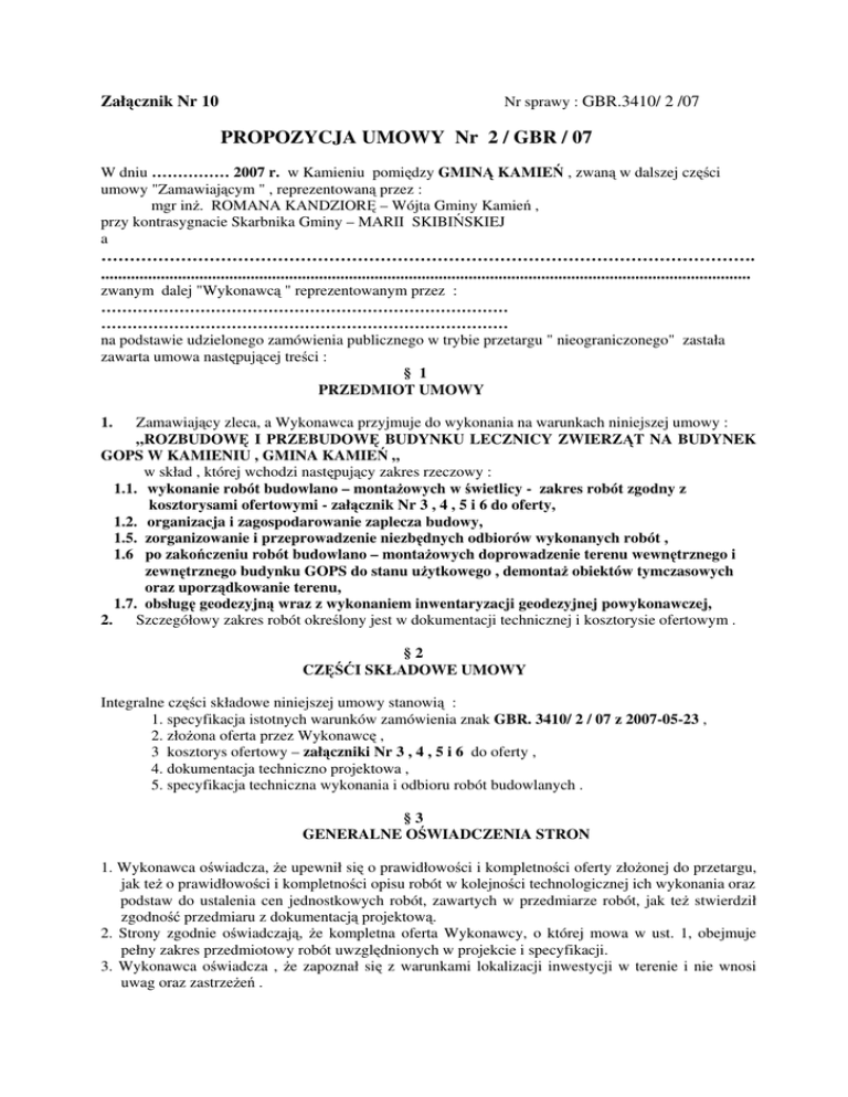 Załącznik Nr 10 Nr sprawy : GBR.3410/ 2 /07 PROPOZYCJA UMOWY Nr 2 / GBR / 07 W dniu …………… 2007 r. w Kamieniu pomiędzy GMINĄ KAMIEŃ , zwaną w dalszej części umowy "Zamawiającym " , reprezentowaną przez : mgr inż. ROMANA KANDZIORĘ – Wójta Gminy Kamień , przy kontrasygnacie Skarbnika Gminy – MARII SKIBIŃSKIEJ a ……………………………………………………………………………………………………. ........................................................................................................................................................ zwanym dalej "Wykonawcą " reprezentowanym przez : …………………………………………………………………… …………………………………………………………………… na podstawie udzielonego zamówienia publicznego w trybie przetargu " nieograniczonego" zastała zawarta umowa następującej treści : § 1 PRZEDMIOT UMOWY 1. Zamawiający zleca, a Wykonawca przyjmuje do wykonania na warunkach niniejszej umowy : „ROZBUDOWĘ I PRZEBUDOWĘ BUDYNKU LECZNICY ZWIERZĄT NA BUDYNEK GOPS W KAMIENIU , GMINA KAMIEŃ „ w skład , której wchodzi następujący zakres rzeczowy : 1.1. wykonanie robót budowlano – montażowych w świetlicy - zakres robót zgodny z kosztorysami ofertowymi - załącznik Nr 3 , 4 , 5 i 6 do oferty, 1.2. organizacja i zagospodarowanie zaplecza budowy, 1.5. zorganizowanie i przeprowadzenie niezbędnych odbiorów wykonanych robót , 1.6 po zakończeniu robót budowlano – montażowych doprowadzenie terenu wewnętrznego i zewnętrznego budynku GOPS do stanu użytkowego , demontaż obiektów tymczasowych oraz uporządkowanie terenu, 1.7. obsługę geodezyjną wraz z wykonaniem inwentaryzacji geodezyjnej powykonawczej, 2. Szczegółowy zakres robót określony jest w dokumentacji technicznej i kosztorysie ofertowym . §2 CZĘŚĆI SKŁADOWE UMOWY Integralne części składowe niniejszej umowy stanowią : 1. specyfikacja istotnych warunków zamówienia znak GBR. 3410/ 2 / 07 z 2007-05-23 , 2. złożona oferta przez Wykonawcę , 3 kosztorys ofertowy – załączniki Nr 3 , 4 , 5 i 6 do oferty , 4. dokumentacja techniczno projektowa , 5. specyfikacja techniczna wykonania i odbioru robót budowlanych . §3 GENERALNE OŚWIADCZENIA STRON 1. Wykonawca oświadcza, że upewnił się o prawidłowości i kompletności oferty złożonej do przetargu, jak też o prawidłowości i kompletności opisu robót w kolejności technologicznej ich wykonania oraz podstaw do ustalenia cen jednostkowych robót, zawartych w przedmiarze robót, jak też stwierdził zgodność przedmiaru z dokumentacją projektową. 2. Strony zgodnie oświadczają, że kompletna oferta Wykonawcy, o której mowa w ust. 1, obejmuje pełny zakres przedmiotowy robót uwzględnionych w projekcie i specyfikacji. 3. Wykonawca oświadcza , że zapoznał się z warunkami lokalizacji inwestycji w terenie i nie wnosi uwag oraz zastrzeżeń . Nr sprawy : GBR.3410/ 2 /07 4. Wykonawca zobowiązuje się wykonać przedmiot umowy zgodnie z obowiązującymi przepisami , zasadami współczesnej wiedzy technicznej , obowiązującymi przepisami i normami oraz przy zachowaniu należytej staranności . §4 TERMINY ROZPOCZĘCIA I ZAKOŃCZENIA ROBÓT Termin rozpoczęcia robót budowlanych – …………… 2007 r. , Termin zakończenia robót budowlanych – 15 grudnia 2007 r. , §5 OBOWIĄZKI ZAMAWIAJĄCEGO 1. Zamawiający zobowiązuje się do protokolarnego przekazania Wykonawcy terenu budowy i dokumentacji w całości w terminie trzech dni od podpisania umowy. 2. W przypadku nie dotrzymania terminu o którym mowa w ust.1 z przyczyn leżących po stronie Zamawiającego, termin zakończenia robót ulega przedłużeniu o czas opóźnienia Zamawiającego. §6 1. Zamawiający powołuje Inspektorów nadzoru inwestorskiego, zwanych dalej Inspektorami , w osobach : Pana ………………………….posiadającego uprawnienia budowlane Nr ……………branży budowlanej , Pana ………………………….posiadającego uprawnienia budowlane Nr ……………- branży sanitarnej , Pana ………………………….posiadającego uprawnienia budowlane Nr ……………- branży elektrycznej . 2. Inspektorzy działają w granicach umocowania określonego przepisami ustawy z dnia 7 lipca 1994r. Prawo budowlane (tj. Dz. U. z 2003r. Nr 89, poz. 216 z późn. zm.). §7 OBOWIĄZKI WYKONAWCY 1. Wykonawca ustanawia Kierownika budowy w osobie Pana ………………… posiadającego uprawnienia budowlane Nr …… , który działa w granicach umocowania określonego przepisami ustawy z dnia 7 lipca 1994r. Prawo budowlane (tj. Dz. U. z 2003r. Nr 89, poz. 216 z późn. zm.). 2. Wykonawca we własnym zakresie zabezpieczy wodę i energię elektryczną na teren budowy. 3. Wykonawca będzie ponosił koszty zużycia wody i energii, opłat związanych z przejściem sieci i przyłączy pod drogami organizacji ruchu na drogach oraz utrzymania konserwacji urządzeń i obiektów, z których będzie korzystał. §8 1. Wykonawca zobowiązuje się wykonać i utrzymać na swój koszt ogrodzenie budowy, strzec mienia znajdującego się na terenie budowy, a także zapewnić warunki bezpieczeństwa. 2. Do obowiązków Wykonawcy w okresie realizacji robót będzie należało zabezpieczenie wykopów przed zalaniem wodą deszczową i gruntową oraz utrzymywanie terenu budowy w stanie wolnym od przeszkód komunikacyjnych, składowanie i usuwanie po ich wykorzystaniu wszelkich urządzeń pomocniczych i zbędnych materiałów, odpadów, śmieci, itp.. 3. Po zakończeniu robót Wykonawca zobowiązany jest uporządkować teren budowy i przekazać go Zamawiającemu w terminie odbioru robót. 4. W przypadku uszkodzenia lub zniszczenia istniejącej infrastruktury (płoty , drzewa, krzewy ,drogi dojazdowe itp.) w toku realizacji robót do obowiązków Wykonawcy należy ich naprawienie i doprowadzenie do stanu pierwotnego . Nr sprawy : G