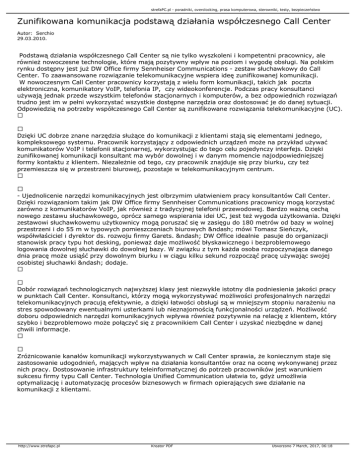 strefaPC.pl - poradniki, overclocking, prasa komputerowa, sterowniki, testy, bezpieczeństwo Zunifikowana komunikacja podstawą działania współczesnego Call Center Autor: Serchio 29.03.2010. Podstawą działania współczesnego Call Center są nie tylko wyszkoleni i kompetentni pracownicy, ale również nowoczesne technologie, które mają pozytywny wpływ na poziom i wygodę obsługi. Na polskim rynku dostępny jest już DW Office firmy Sennheiser Communications - zestaw słuchawkowy do Call Center. To zaawansowane rozwiązanie telekomunikacyjne wspiera ideę zunifikowanej komunikacji. W nowoczesnym Call Center pracownicy korzystają z wielu form komunikacji, takich jak poczta elektroniczna, komunikatory VoIP, telefonia IP, czy wideokonferencje. Podczas pracy konsultanci używają jednak przede wszystkim telefonów stacjonarnych i komputerów, a bez odpowiednich rozwiązań trudno jest im w pełni wykorzystać wszystkie dostępne narzędzia oraz dostosować je do danej sytuacji. Odpowiedzią na potrzeby współczesnego Call Center są zunifikowane rozwiązania telekomunikacyjne (UC). Dzięki UC dobrze znane narzędzia służące do komunikacji z klientami stają się elementami jednego, kompleksowego systemu. Pracownik korzystający z odpowiednich urządzeń może na przykład używać komunikatorów VoIP i telefonii stacjonarnej, wykorzystując do tego celu pojedynczy interfejs. Dzięki zunifikowanej komunikacji konsultant ma wybór dowolnej i w danym momencie najodpowiedniejszej formy kontaktu z klientem. Niezależnie od tego, czy pracownik znajduje się przy biurku, czy też przemieszcza się w przestrzeni biurowej, pozostaje w telekomunikacyjnym centrum. - Ujednolicenie narzędzi komunikacyjnych jest olbrzymim ułatwieniem pracy konsultantów Call Center. Dzięki rozwiązaniom takim jak DW Office firmy Sennheiser Communications pracownicy mogą korzystać zarówno z komunikatorów VoIP, jak również z tradycyjnej telefonii przewodowej. Bardzo ważną cechą nowego zestawu słuchawkowego, oprócz samego wspierania idei UC, jest też wygoda użytkowania. Dzięki zestawowi słuchawkowemu użytkownicy mogą poruszać się w zasięgu do 180 metrów od bazy w wolnej przestrzeni i do 55 m w typowych pomieszczeniach biurowych – mówi Tomasz Sieńczyk, współwłaściciel i dyrektor ds. rozwoju firmy Garets. – DW Office idealnie pasuje do organizacji stanowisk pracy typu hot desking, ponieważ daje możliwość błyskawicznego i bezproblemowego logowania dowolnej słuchawki do dowolnej bazy. W związku z tym każda osoba rozpoczynająca danego dnia pracę może usiąść przy dowolnym biurku i w ciągu kilku sekund rozpocząć pracę używając swojej osobistej słuchawki – dodaje. Dobór rozwiązań technologicznych najwyższej klasy jest niezwykle istotny dla podniesienia jakości pracy w punktach Call Center. Konsultanci, którzy mogą wykorzystywać możliwości profesjonalnych narzędzi telekomunikacyjnych pracują efektywnie, a dzięki łatwości obsługi są w mniejszym stopniu narażeniu na stres spowodowany ewentualnymi usterkami lub nieznajomością funkcjonalności urządzeń. Możliwość doboru odpowiednich narzędzi komunikacyjnych wpływa również pozytywnie na relację z klientem, który szybko i bezproblemowo może połączyć się z pracownikiem Call Center i uzyskać niezbędne w danej chwili informacje. Zróżnicowanie kanałów komunikacji wykorzystywanych w Call Center sprawia, że koniecznym staje się zastosowanie udogodnień, mających wpływ na działania konsultantów oraz na ocenę wykonywanej przez nich pracy. Dostosowanie infrastruktury teleinformatycznej do potrzeb pracowników jest warunkiem sukcesu firmy typu Call Center. Technologia Unified Communication ułatwia to, gdyż umożliwia optymalizację i automatyzację procesów biznesowych w firmach opierających swe działanie na komunikacji z klientami. http://www.strefapc.pl Kreator PDF Utworzono 7 March, 2017, 06:18
