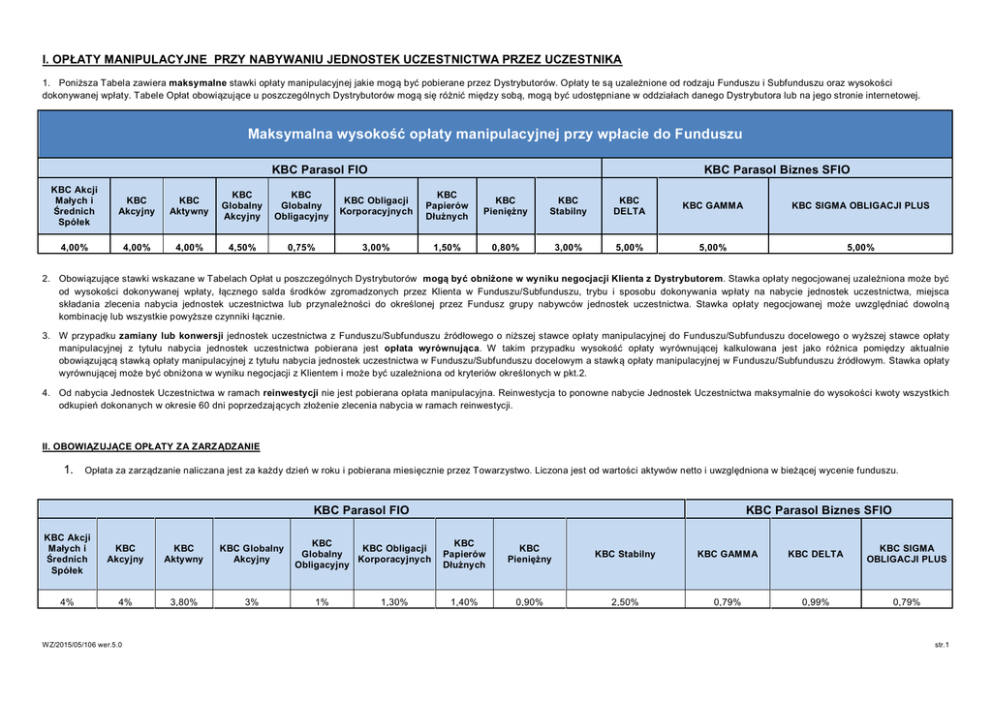 I. OP ATY MANIPULACYJNE PRZY NABYWANIU JEDNOSTEK UCZESTNICTWA PRZEZ UCZESTNIKA 1. Poni sza Tabela zawiera maksymalne stawki op aty manipulacyjnej jakie mog by pobierane przez Dystrybutorów. Op aty te s uzale nione od rodzaju Funduszu i Subfunduszu oraz wysoko ci dokonywanej wp aty. Tabele Op at obowi zuj ce u poszczególnych Dystrybutorów mog si ró ni mi dzy sob , mog by udost pniane w oddzia ach danego Dystrybutora lub na jego stronie internetowej. Maksymalna wysoko op aty manipulacyjnej przy wp acie do Funduszu KBC Parasol FIO KBC Parasol Biznes SFIO KBC Akcji Ma ych i rednich Spó ek KBC Akcyjny KBC Aktywny KBC Globalny Akcyjny KBC Globalny Obligacyjny KBC Obligacji Korporacyjnych KBC Papierów nych KBC Pieni ny KBC Stabilny KBC DELTA KBC GAMMA KBC SIGMA OBLIGACJI PLUS 4,00% 4,00% 4,00% 4,50% 0,75% 3,00% 1,50% 0,80% 3,00% 5,00% 5,00% 5,00% 2. Obowi zuj ce stawki wskazane w Tabelach Op at u poszczególnych Dystrybutorów mog by obni one w wyniku negocjacji Klienta z Dystrybutorem. Stawka op aty negocjowanej uzale niona mo e by od wysoko ci dokonywanej wp aty, cznego salda rodków zgromadzonych przez Klienta w Funduszu/Subfunduszu, trybu i sposobu dokonywania wp aty na nabycie jednostek uczestnictwa, miejsca sk adania zlecenia nabycia jednostek uczestnictwa lub przynale no ci do okre lonej przez Fundusz grupy nabywców jednostek uczestnictwa. Stawka op aty negocjowanej mo e uwzgl dnia dowoln kombinacj lub wszystkie powy sze czynniki cznie. 3. W przypadku zamiany lub konwersji jednostek uczestnictwa z Funduszu/Subfunduszu ród owego o ni szej stawce op aty manipulacyjnej do Funduszu/Subfunduszu docelowego o wy szej stawce op aty manipulacyjnej z tytu u nabycia jednostek uczestnictwa pobierana jest op ata wyrównuj ca. W takim przypadku wysoko op aty wyrównuj cej kalkulowana jest jako ró nica pomi dzy aktualnie obowi zuj stawk op aty manipulacyjnej z tytu u nabycia jednostek uczestnictwa w Funduszu/Subfunduszu docelowym a stawk op aty manipulacyjnej w Funduszu/Subfunduszu ród owym. Stawka op aty wyrównuj cej mo e by obni ona w wyniku negocjacji z Klientem i mo e by uzale niona od kryteriów okre lonych w pkt.2. 4. Od nabycia Jednostek Uczestnictwa w ramach reinwestycji nie jest pobierana op ata manipulacyjna. Reinwestycja to ponowne nabycie Jednostek Uczestnictwa maksymalnie do wysoko ci kwoty wszystkich odkupie dokonanych w okresie 60 dni poprzedzaj cych z enie zlecenia nabycia w ramach reinwestycji. II. OBOWI ZUJ CE OP ATY ZA ZARZ DZANIE 1. Op ata za zarz dzanie naliczana jest za ka dy dzie w roku i pobierana miesi cznie przez Towarzystwo. Liczona jest od warto ci aktywów netto i uwzgl dniona w bie KBC Parasol FIO KBC Akcji Ma ych i rednich Spó ek KBC Akcyjny KBC Aktywny KBC Globalny Akcyjny 4% 4% 3,80% 3% WZ/2015/05/106 wer.5.0 KBC KBC Obligacji Globalny Korporacyjnych Obligacyjny 1% 1,30% cej wycenie funduszu. KBC Parasol Biznes SFIO KBC Papierów nych KBC Pieni ny KBC Stabilny KBC GAMMA KBC DELTA KBC SIGMA OBLIGACJI PLUS 1,40% 0,90% 2,50% 0,79% 0,99% 0,79% str.1 Tabela op at dla funduszy KBC Parasol FIO i Biznes SFIO obowi zuj ca w Deutsche Bank Polska S.A MINIMALNE WP ATY DO POSZCZEGÓLNYCH FUNDUSZY: minimalna pierwsza wp ata dla osób fizycznych: dla osób prawnych oraz jednostek organizacyjnych nieposiadaj cych osobowo ci prawnej: dla osób fizycznych: dla osób prawnych oraz jednostek organizacyjnych nieposiadaj cych osobowo ci prawnej: 500 pln 500 pln 100 pln 100 pln równowarto w z otych 40.000,00 EURO, ustalonej przy zastosowaniu redniego kursu walut obcych og aszanego przez NBP 25 000,00 z - promocja trwa do 31 grudnia 2017 r. 1 000 pln 1 000 pln dla subfunduszy KBC Parasol FIO: KBC Akcji Ma ych i rednich Spó ek KBC Akcyjny KBC Aktywny KBC Globalny Akcyjny KBC Obligacji Korporacyjnych KBC Papierów D nych KBC Pieni ny KBC Stabilny KBC Zmiennej Alokacji KBC DELTA KBC GAMMA KBC SIGMA OBLIGACJI PLUS kolejna minimalna wp ata III. OP ATY MANIPULACYJNE PRZY UMORZENIU JEDNOSTEK UCZESTNICTWA PRZEZ UCZESTNIKA: 1. Przy zbywaniu jednostek uczestnictwa funduszy zarz dzanych przez KBC TFI op ata manipulacyjna nie jest pobierana. Tabela Op at obowi zuje od dnia 10 stycznia 2017. WZ/2015/05/106 wer.5.0 str.1