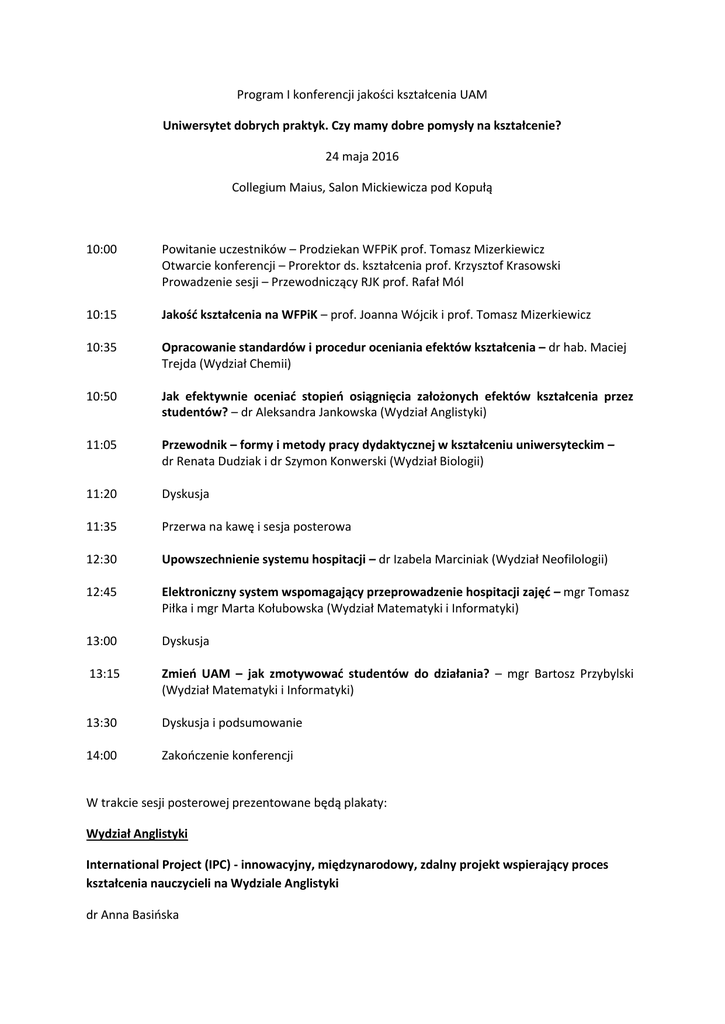 Program I konferencji jakości kształcenia UAM Uniwersytet dobrych praktyk. Czy mamy dobre pomysły na kształcenie? 24 maja 2016 Collegium Maius, Salon Mickiewicza pod Kopułą 10:00 Powitanie uczestników – Prodziekan WFPiK prof. Tomasz Mizerkiewicz Otwarcie konferencji – Prorektor ds. kształcenia prof. Krzysztof Krasowski Prowadzenie sesji – Przewodniczący RJK prof. Rafał Mól 10:15 Jakość kształcenia na WFPiK – prof. Joanna Wójcik i prof. Tomasz Mizerkiewicz 10:35 Opracowanie standardów i procedur oceniania efektów kształcenia – dr hab. Maciej Trejda (Wydział Chemii) 10:50 Jak efektywnie oceniać stopień osiągnięcia założonych efektów kształcenia przez studentów? – dr Aleksandra Jankowska (Wydział Anglistyki) 11:05 Przewodnik – formy i metody pracy dydaktycznej w kształceniu uniwersyteckim – dr Renata Dudziak i dr Szymon Konwerski (Wydział Biologii) 11:20 Dyskusja 11:35 Przerwa na kawę i sesja posterowa 12:30 Upowszechnienie systemu hospitacji – dr Izabela Marciniak (Wydział Neofilologii) 12:45 Elektroniczny system wspomagający przeprowadzenie hospitacji zajęć – mgr Tomasz Piłka i mgr Marta Kołubowska (Wydział Matematyki i Informatyki) 13:00 Dyskusja 13:15 Zmień UAM – jak zmotywować studentów do działania? – mgr Bartosz Przybylski (Wydział Matematyki i Informatyki) 13:30 Dyskusja i podsumowanie 14:00 Zakończenie konferencji W trakcie sesji posterowej prezentowane będą plakaty: Wydział Anglistyki International Project (IPC) - innowacyjny, międzynarodowy, zdalny projekt wspierający proces kształcenia nauczycieli na Wydziale Anglistyki dr Anna Basińska Wydział Biologii Szkoła i Uniwersytet – wspólne działania na rzecz podniesienia jakości studenckich praktyk pedagogocznych Dr Agnieszka Cieszyńska, dr Renata Dudziak Biotechnology Master of Sciences – anglojęzyczne studia II stopnia na Wydziale Biologii dr hab. Agnieszka Ludwików Wydział Fizyki Zajęcia zerowe w Pracowni Podstaw Eksperymentu Fizycznego dr Iwona Iwaszkiewicz-Kostka i dr Krzysztof Gębura Wydział Historyczny JAKOŚĆ KSZTAŁCENIA NA WYDZIALE HISTORYCZNYM UAM RADA - PROGRAM - PRAKTYKA – PARTNERSTWO POSTER 1. RADA Zespół Doradczy ds. Zapewniania Jakości Kształcenia Instytutu Historii UAM prof. UAM dr hab. Jędrzej Paszkiewicz POSTER 2. PROGRAM Otwarty program. Międzyprzedmiotowe ścieżki problemowe Instytutu Historii UAM prof. UAM dr hab. Izabela Skórzyńska i dr hab. Maciej Michalski POSTERY od 3 do 6. PRAKTYKA Projekty eksploracyjne w ramach praktyk terenowych Instytutu Etnologii i Antropologii Kulturowej dr Anna Weronika Brzezińska i dr Małgorzata Kowalska Badania zespołu pałacowego w Gładyszach: wirtualna rekonstrukcja parku barokowego seminarium Instytutu Historii Sztuki UAM mgr Patrycja Łobodzińska i mgr Witold Miedziak Konwersatorium wschodoznawcze Instytutu Wschodniego UAM dr Grzegorz Skrukwa Praktyki etnomuzykologiczne Katedry Muzykologii UAM Maria Kulczewska i Stefania Zielonka POSTER 7. PARTNERSTWO Nauka i otoczenie gospodarcze. Instytut Etnologii i Antropologii Kulturowej dr Anna Weronika Brzezińska i dr Małgorzata Kowalska Wydział Nauk Geograficznych i Geologicznych Geoinformacja – innowacyjny kierunek kształcenia na WNGiG prof. UAM dr hab. Zbigniew Zwoliński i prof. UAM dr hab. Małgorzata Mazurek Wydział Nauk Społecznych Dobre praktyki w kształceniu na kierunku praca socjalna prof. UAM. dr hab. Anna Michalska Wydział Studiów Edukacyjnych Przedszkolaki na Uniwersytecie jako przykład działań sprzyjających rozwijaniu kompetencji psychopedagogicznych i metodycznych przyszłych pedagogów mgr Anna Schmidt i mgr Joanna Sikorska