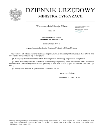 DZIENNIK URZĘDOWY MINISTRA CYFRYZACJI Warszawa, dnia 25 maja 2016 r. Elektronicznie podpisany przez: Witold Kołodziejski Data: 2016-05-25 11:51:45 Poz. 17 ZARZĄDZENIE NR 15 MINISTRA CYFRYZACJI z dnia 24 maja 2016 r. w sprawie nadania statutu Centrum Projektów Polska Cyfrowa Na podstawie art. 12 ust. 2 ustawy z dnia 27 sierpnia 2009 r. o finansach publicznych (Dz. U. z 2013 r. poz. 885, z późn. zm.1)) zarządza się, co następuje: § 1. Nadaje się statut Centrum Projektów Polska Cyfrowa, stanowiący załącznik do zarządzenia. § 2. Traci moc zarządzenie Nr 26 Ministra Administracji i Cyfryzacji z dnia 12 czerwca 2015 r. w sprawie nadania statutu Centrum Projektów Polska Cyfrowa (Dz. Urz. Min. Ad. i Cyf. poz. 40 oraz Dz. Urz. Min. Cyf. poz. 2). § 3. Zarządzenie wchodzi w życie z dniem 15 czerwca 2016 r. - Anna STREŻYŃSKA MINISTER CYFRYZACJI 1) Zmiany tekstu jednolitego wymienionej ustawy zostały ogłoszone w Dz. U. z 2013 r. poz. 938 i 1646, z 2014 r. poz. 379, 911, 1146, 1626 i 1877, z 2015 r. poz. 238, 532, 1045, 1117, 1130, 1189, 1190, 1269, 1358, 1513, 1830, 1854, 1890 i 2150 oraz z 2016 r. poz. 195. Dziennik Urzędowy Ministra Cyfryzacji –2– Poz. 17 Załącznik do Zarządzenia Nr 15 Ministra Cyfryzacji z dnia 24 maja 2016 r. STATUT CENTRUM PROJEKTÓW POLSKA CYFROWA § 1. 1. Centrum Projektów Polska Cyfrowa, zwane dalej „CPPC”, jest państwową jednostką budżetową podległą ministrowi właściwemu do spraw informatyzacji, zwanemu dalej „Ministrem”. 2. Siedzibą CPPC jest Warszawa. 3. CPPC realizuje zadania związane z wdrażaniem programów i projektów współfinansowanych ze środków pochodzących z budżetu Unii Europejskiej zapewniających wsparcie w ramach polityki spójności, środków pochodzących z bezzwrotnej pomocy zagranicznej oraz środków pochodzących z innych programów w zakresie mu powierzonym do realizacji na podstawie właściwych umów lub porozumień. 4. CPPC zarządza programami powierzonymi mu do realizacji w zakresie i w sposób zgodny z decyzjami uprawnionych organów administracji rządowej oraz zasadami obowiązującymi przy realizacji tych programów. § 2. W skład CPPC wchodzą: 1) Dyrektor; 2) Departament Kompetencji Cyfrowych; 3) Departament Wdrażania Projektów Szerokopasmowych; 4) Departament Projektów e-Administracji; 5) Departament Prawny; 6) Departament Systemowy; 7) Departament Finansowy; 8) Departament Programów Europejskich; 9) Biuro Administracyjne; 10) Stanowisko do spraw Audytu Wewnętrznego. § 3. 1. Dyrektora powołuje i odwołuje Minister. 2. Dyrektor kieruje CPPC i reprezentuje jednostkę jednoosobowo na zewnątrz. 3. Dyrektor wykonuje zadania CPPC przy pomocy dyrektorów departamentów, o których mowa w § 2 pkt 2-8, dyrektora Biura Administracyjnego oraz samodzielnych stanowisk pracy. 4. CPPC jest pracodawcą w rozumieniu ustawy z dnia 26 czerwca 1974 r. – Kodeks pracy (Dz. U. z 2014 r. poz. 1502, z późn. zm.1)). 5. Dyrektor wykonuje czynności z zakresu prawa pracy w stosunku do osób zatrudnionych w CPPC i może powierzać wykonywanie określonych zadań innym osobom na podstawie umów cywilnoprawnych, pełnomocnictw oraz upoważnień. 6. Dyrektor może wydawać zarządzenia, decyzje i wytyczne w sprawach związanych z funkcjonowaniem i zakresem działania CPPC. 7. Dyrektor może upoważnić dyrektorów departamentów, o których mowa w § 2 pkt 2-8, dyrektora Biura Administracyjnego oraz kierowników komórek organizacyjnych wchodzących w skład departamentów, o których mowa w § 2 pkt 2-8, do podejmowania w jego imieniu decyzji w określonych sprawach. 1) Zmiany tekstu jednolitego wymienionej ustawy zostały ogłoszone w Dz. U. z 2014 r. poz. 1662 oraz z 2015 r. poz. 1066, 1220, 1224, 1240 i 1268.