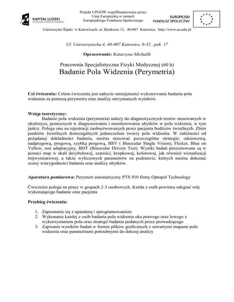 Projekt UPGOW współfinansowany przez Unię Europejską w ramach Europejskiego Funduszu Społecznego Uniwersytet Śląski w Katowicach, ul. Bankowa 12, 40-007 Katowice, http://www.us.edu.pl Ul. Uniwersytecka 4, 40-007 Katowice, 0-32 , pok. 17 Opracowanie: Katarzyna Michalik Pracownia Specjalistyczna Fizyki Medycznej (60 h) Badanie Pola Widzenia (Perymetria) Cel ćwiczenia: Celem ćwiczenia jest nabycie umiejętności wykonywania badania pola widzenia za pomocą perymetru oraz analizy otrzymanych wyników. Wstęp teoretyczny: Badanie pola widzenia (perymetria) należy do diagnostycznych testów stosowanych w okulistyce, pomocnych w diagnozowaniu i monitorowaniu ubytków w polu widzenia, w tym jaskry. Polega ono na rejestracji zaobserwowanych przez pacjenta bodźców świetlnych. Zbiór punktów świetlnych dostrzegalnych jednocześnie tworzy pole widzenia. W zależności od pożądanej dokładności badania, można stosować poszczególne strategie: odsiewową, nadprogową, progową, szybką progową, BSV ( Binocular Single Vision), Flicker, Blue on Yellow, test adaptacyjny, BDT (Binocular Drivers Test). Wyniki badań prezentowane są w postaci map w skali decybelowej, szarości, kropkowej, kolorowej, jak również wizualizacji trójwymiarowej, a także wyliczonych parametrów na podstawie, których można dokonać oceny wiarygodności badania oraz analizy ubytków. Aparatura pomiarowa: Perymetr automatyczny PTS 910 firmy Optopol Technology Ćwiczenie polega na pracy w grupach 2-3 osobowych. Każda z osób powinna odegrać rolę wykonującego badanie oraz pacjenta Przebieg ćwiczenia: 1. Zapoznanie się z aparaturą i oprogramowaniem 2. Wykonanie każdej z osób badania pola widzenia oka prawego oraz lewego z wykorzystaniem pola oraz strategii badania podanych przez prowadzącego 3. Zapisanie wyników badań w formie plików graficznych z zawartymi mapami pola widzenia oraz parametrami potrzebnymi do dalszej analizy Projekt UPGOW współfinansowany przez Unię Europejską w ramach Europejskiego Funduszu Społecznego Uniwersytet Śląski w Katowicach, ul. Bankowa 12, 40-007 Katowice, http://www.us.edu.pl Wykonanie ćwiczenia: Ćwiczenia zostaną zaliczone pod warunkiem obecności na każdych zajęciach oraz oddania w terminie ustalonym przez prowadzącego pisemnego sprawozdania z wykonanego ćwiczenia. Sprawozdanie powinno składać się z następujących części: • Cel ćwiczenia • Metodyka i materiał badawczy • Przebieg doświadczenia • Wyniki pomiarów • Analiza wyników • Wnioski W analizie wyników należy dokonać oceny wiarygodności każdego wykonanego badania na podstawie poznanych parametrów, a następnie porównania właściwych parametrów używanych do oceny wielkości i rozległości ubytków w polu widzenia wraz z analizą wykresu krzywej Bebiego. Należy również dokonać porównania wyników oka lewego i prawego każdego badanego. Wymagania: 1. Budowa oka ludzkiego wraz ze szczegółową budowa warstwową siatkówki + dołek środkowy, plamka ślepa 2. Mechanizm widzenia 3. Tworzenie obrazu przez soczewkę skupiającą dla różnych odległości przedmiotu w stosunku do ogniskowej: • gdy przedmiot znajduje się w odległości większej niż dwukrotna wartość ogniskowej • gdy przedmiot znajduje się w odległości mniejszej niż dwukrotna wartość ogniskowej i większej niż ogniskowa • gdy przedmiot znajduje się w odległości mniejszej niż ogniskowa 4. Wady refrakcji oka 5. Rozmieszczenie receptorów na siatkówce 6. Droga wzrokowa 7. Ostrość widzenia centralnego i obwodowego 8. Własności widzenia (ostrość, akomodacja, adaptacja, konwergencja, stereoskopowość) 9. Pojęcie fotometrii i jednostki fotometryczne 10. Rodzaje perymetrii 11. Strategie badań perymetrycznych 12. Krzywa Bebiego 13. Parametry wiarygodności badania perymetrycznego Literatura: 1. W.Z. Traczyk, Fizjologia człowieka w zarysie, PZWL 2. P. Tesla, J. Szaflik, Perymetria, Górnicki Wydawnictwo Medyczne 2002 3. J.J. Kaczyński, P. Tesla, Jaskra. Kompendium diagnostyki i leczenia, Górnicki Wydawnictwo Medyczne, rozdz. 2: http://www.gornicki.pl/uploads/TiShop/50/perymetria.pdf 4. Instrukcja obsługi perymetru automatycznego PTS 910 (dostępna na stronie www ZFMed) 5. Wykłady dr inż. P. Steć, System wizyjny człowieka, 2005, http://www.uz.zgora.pl/~pstec/files/widzenie2.pdf