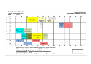 Wydział: Przyrodniczo-Technologiczny Rok akademicki 2016/2017 Data modyfikacji rozkładu zajeć: 28.09.2016 Kierunek: Technika Rolnicza i Leśna Rok: I Semestr: 1 1000 1100 1200 Techn inform ćw. 2.11 1400 1500 2 1 Podst prod zwierz ćw. 1.24 (co 2 tyg zmina grupy) 2 Podstawy produkcji zwierzęcej 2 w. 26MR Podstawy prawa w techn rolniczej w. 26MR Biolog podst. roln. ćw. 115* 1 I Matematyka wyższa I w. 26MR 700 800 900 1800 1900 2000 1800 1900 2000 Grafika inż ćw. 1.23 Biologiczne podstawy rolnictwa w. VIR Chemia w. VIR Podstawy funkcjonowan ia obszar. w. 26MR Chemia ćw. 201 Biolog podst. roln.ćw. s.wł.* 2 1700 Podst funk obsza ćw. 1.24 (co 2 tyg zmina grupy) 1 I 1600 Techn inform ćw. 2.11 Godz Dzieka ńska w. 26MR 1 Wtorek 1300 Grafika inż ćw. 1.23 Matematyka wyższa I ćw. 18MR 2 I Czwartek 900 I I Piątek 800 1 Środa Poniedziałek A P,L 700 1000 Chemia ćw. 201 1100 1200 1300 1400 1500 Podstawy produkcji zwierzęcej, Podstawy funkcjonowania obszarów wiejskich co 2 tygodnie Biologiczne podstawy rolnictwa co 2 tygodnie - sala 115 pl. Grunwaldzki 24A Zajęcia z Chemii odbywają się w sali 201 ul. C.K. Norwida 25 Pozostałe sale znajdują się w Instytucie Inżynierii Rolniczej ul. Chełmońskiego 37/41 Uwaga: Semestr rozpoczyna się 01.10.2016r Wszelkie zmiany w rozkładzie zajęć należy uzgadniać z Prodziekanem i zgłaszać w Dziale Organizacji Studiów 1600 1700 Rozkład zaakceptował Prodziekan