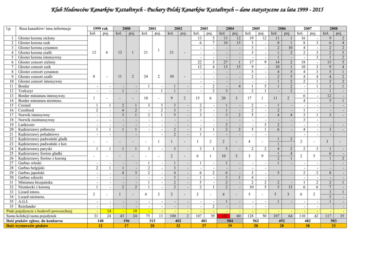 Klub Hodowców Kanarków Kształtnych - Puchary Polski Kanarków Kształtnych – dane statystyczne za lata 1999 - 2015 l.p. Rasa kanarków/ inne.informacje 1 Gloster korona zielony 2 Gloster korona szek 3 Gloster korona cynamon 4 Gloster korona szafir 5 Gloster korona intensywny 6 Gloster consort zielony 7 Gloster consort szek 8 Gloster consort cynamon 9 Gloster consort szafir 10 Gloster consort intensywny 11 Border 12 Yorkszyr 13 Border miniatura intensywny 14 Border miniatura nieintens. 15 Crested 16 Crestbred 17 Norwik intensywny 18 Norwik nieintensywny 19 Lankeszer 20 Kędzierzawy północny 21 Kędzierzawy południowy 22 Kędzierzawy padwański gładk 23 Kędzierzawy padwański z kor. 24 Kędzierzawy paryski 25 Kędzierzawy fiorino gładki 26 Kędzierzawy fiorino z koroną 27 Garbus włoski 28 Garbus belgijski 29 Garbus japoński 30 Garbus szkocki 31 Miniatura hiszpańska 32 Niemiecki z koroną 33 Lizard intens. 34 Lizard nieintens. 35 A.G.I. 35 Reinlander Ptaki pojedyncze z hodowli powszechnej Suma kolekcji/suma pojedynek Ilość ptaków zgłosz. do konkursu Ilość wystawców ptaków 1999 rok kol. poj. kol. 2000 poj. kol. 12 6 12 1 21 8 - 11 2 24 1 - 1 2 1 - 1 1 - 1 - - - 1 1 - 14 31 24 148 12 1 - - 3 2 - 10 43 24 196 17 1 1 2 1 - 75 13 313 28 - 3 - 100 402 32 2 3 3 3 1 - 1 3 4 3 2 2 6 1 - 2 2003 kol. poj. 13 5 6 7 22 3 12 4 2 2 15 - 2 2 - 3 3 5 2 2 - 1 2 2 1 1 4 30 9 1 - - 3 2 1 - 3 2002 poj. 21 1 3 2 - 1 1 4 2 2 1 1 2 1 1 - kol. 1 10 - - - - 2 4 3 1 1 2 1 2 - - - 1 2001 poj. - 3 1 1 3 2 2 - 2 1 1 1 6 1 5 2 2 2 1 - 3 - 20 2 6 2004 kol. poj. 13 12 10 15 27 1 13 15 4 3 - - 2 107 39 481 37 2 2 - 5 2 1 1 2 2 5 5 - 4 - 5 1 6 3 2 2 4 17 - 10 2005 kol. poj. 19 12 3 3 3 17 9 9 5 2 1 5 2 1 - 1 131 60 584 39 3 1 - 2 2 9 3 4 2 10 5 11 - 3 1 - 2006 kol. poj. 11 1 8 1 2 10 1 2 1 14 2 10 1 4 5 2 5 1 2 1 2 2 2 5 - 128 50 562 38 2 1 2 4 2 6 4 - 1 1 4 1 2 1 2 2 4 1 - 5 - 2 3 13 5 3 1 2007 kol. poj. 16 8 3 4 2 3 3 18 10 3 4 3 4 4 2 1 1 6 4 1 3 1 3 4 2 2 2 107 64 492 28 3 3 3 5 2 1 6 6 - - 2008 poj. 9 2 6 4 2 2 2 5 1 2 15 5 9 4 5 1 4 2 2 2 1 1 1 12 5 1 3 - kol. 2 2 6 2 110 42 482 38 - 1 6 1 2 8 2 1 7 3 1 5 1 117 35 503 33 l.p. Rasa kanarków/ inne.informacje 1 Gloster korona zielony 2 Gloster korona szek 3 Gloster korona cynamon 4 Gloster korona szafir 5 Gloster korona intensywny 6 Gloster korona fawn 7 Gloster consort zielony 8 Gloster consort szek 9 Gloster consort cynamon 10 Gloster consort szafir 11 Gloster consort intensywny 12 Gloster consort agat 13 Gloster consort fawn 14 Border 15 Yorkszyr 16 Border miniatura intensywny 17 Border miniatura nieintensywny 18 Crested 19 Crestbred 20 Norwik intensywny 21 Norwik nieintensywny 22 Lankeszer gładki 23 Lankeszer z koroną 24 Kędzierzawy północny 25 Kędzierzawy południowy 26 Kędzierzawy padwański gładki 27 Kędzierzawy padwański z koroną 28 Kędzierzawy paryski 29 Kędzierzawy fiorino gładki 30 Kędzierzawy fiorino z koroną 31 Garbus włoski 32 Garbus belgijski 33 Garbus japoński intensywny 34 Garbus japoński nieintensywny . 35 Garbus szkocki 36 Miniatura hiszpańska intensywna 37 Miniatura hiszpańska nieintensywna 38 Niemiecki z koroną 39 Lizard intensywny 40 Lizard nieintensywny 41 A.G.I. 42 Reinlander 43 Llarguet hiszpański 44 Melado Tenerfeno Ptaki pojedyncze z hodowli powszechnej Suma kolekcji/suma pojedynek Ilość ptaków zgłosz. do konkursu Ilość wystawców ptaków 2009 kol. poj. 11 20 9 1 3 1 2 2 2 7 12 13 6 5 2 3 4 2 2 4 1 5 2 10 2 1 2 2 2 2 1 2 2 1 1 5 - 5 7 8 5 111 517 40 2010 poj. 8 12 8 10 3 11 3 10 2 3 20 15 6 13 6 8 4 6 1 15 1 6 9 3 4 7 -- kol. 2 2 6 1 2 - 4 - 1 3 4 73 5 5 - 4 - 2011 kol. poj. 11 25 11 12 3 12 4 12 21 26 11 18 5 6 6 12 2 10 3 4 1 5 7 3 2 4 1 4 2 2 2 3 7 3 3 5 3 1 106 141 565 43 15 7 10 1 126 178 682 51 1 - 23 17 4 1 1 2 119 198 674 52 2 2 12 12 12 2 2 7 1 113 251 703 47 3 6 - 1 2 - 1 3 33 4 6 3 8 2 2 - 2 10 2014 kol poj 14 11 5 11 1 7 3 11 1 5 5 21 22 3 14 8 12 3 19 3 10 7 4 2 1 8 6 6 6 - 2 3 1 - 2 5 5 16 8 4 - 2 - 4 2 3 - 2 - 4 6 11 2013 kol. poj. 10 18 7 12 4 12 4 9 3 11 21 9 15 4 13 7 22 1 8 1 3 1 1 - - 2 2 3 3 5 6 - - - 12 4 7 8 7 1 - 6 2012 kol. poj. 13 15 9 16 2 10 3 11 1 11 21 8 11 12 7 13 8 8 1 12 3 - 10 10 1 3 2 7 3 7 6 3 8 6 2 20 3 4 9 4 3 1 127 232 740 49 Puchar Polski Kanarków Kształtnych Dane statystyczne za lata 1999 – 2015 (siedemnaście wystaw) 1999 rok – pierwsza wystawa kanarków kształtnych w Łaziskach Górnych, 12 wystawców zgłosiło do konkursu 148 ptaków 2003 rok – podział kanarków rasy gloster na 4 klasy wystawowe 2004 rok – największa ilość kolekcji ptaków zgłoszona do konkursu: 131 kolekcji 2005 rok – podział kanarków rasy gloster na 10 klas wystawowych 2007 rok – podział kanarków rasy border miniatura ze względu na intensywność upierzenia 2012 rok – największa liczba wystawców ptaków: 52 hodowców 2013 rok – podział kanarków rasy miniatura hiszpańska ze względu na intensywność upierzenia 2013 rok – największa ilość ptaków pojedynczych zgłoszonych do konkursu: 251 sztuk 2014 rok – podział kanarków rasy garbus japoński na intensywne i nieintensywne 2014 rok – wprowadzenie dwóch nowych klas wystawowych dla kanarków rasy gloster – consort fawn i korona fawn 2014 rok – największa ilość ptaków zgłoszonych do konkursu: 740 sztuk l.p Rasa kanarków/ inne.informacje . 1 Gloster korona zielony (100% melaniny) 2 Gloster korona szek (ponad 50% melaniny) 3 Gloster korona szek (ponad 50% lipochromu) 4 Gloster korona biały i żółty (100% lipochromu) 5 Gloster korona cynamon 6 Gloster korona szafir 7 Gloster korona intensywny 8 Gloster korona fawn 9 Gloster consort zielony (100% melaniny) 10 Gloster consort szek (ponad 50% melaniny) 11 Gloster consort szek (ponad 50% lipochromu) 12 Gloster consort biały i żółty (100% lipochromu) 13 Gloster consort cynamon 14 Gloster consort szafir 15 Gloster consort intensywny 16 Gloster consort fawn 17 Border 18 Yorkszyr 19 Border miniatura (100% lipochromu) 20 Border miniat