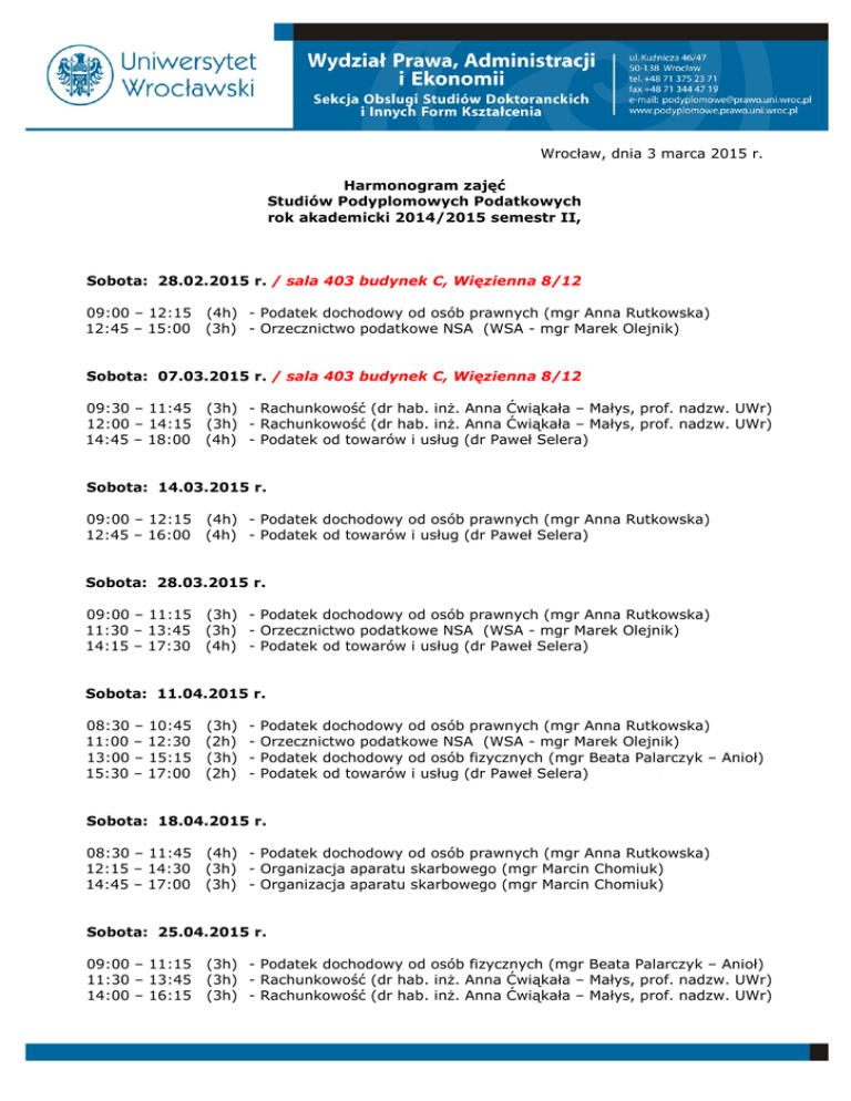 Wrocław, dnia 3 marca 2015 r. Harmonogram zajęć Studiów