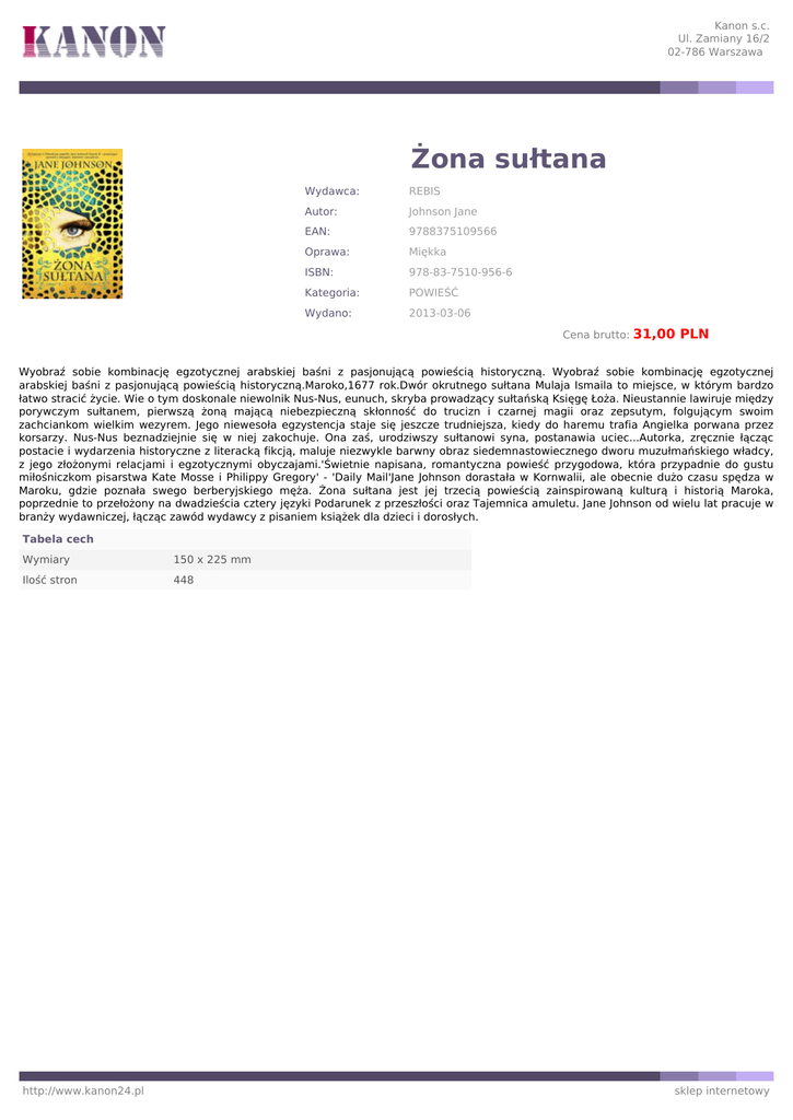 Kanon s.c. Ul. Zamiany 16/2 02-786 Warszawa Żona sułtana Wydawca: REBIS Autor: Johnson Jane EAN: 9788375109566 Oprawa: Miękka ISBN: 978-83-7510-956-6 Kategoria: POWIEŚĆ Wydano: 2013-03-06 Cena brutto: 31,00 PLN Wyobraź sobie kombinację egzotycznej arabskiej baśni z pasjonującą powieścią historyczną. Wyobraź sobie kombinację egzotycznej arabskiej baśni z pasjonującą powieścią historyczną.Maroko,1677 rok.Dwór okrutnego sułtana Mulaja Ismaila to miejsce, w którym bardzo łatwo stracić życie. Wie o tym doskonale niewolnik Nus-Nus, eunuch, skryba prowadzący sułtańską Księgę Łoża. Nieustannie lawiruje między porywczym sułtanem, pierwszą żoną mającą niebezpieczną skłonność do trucizn i czarnej magii oraz zepsutym, folgującym swoim zachciankom wielkim wezyrem. Jego niewesoła egzystencja staje się jeszcze trudniejsza, kiedy do haremu trafia Angielka porwana przez korsarzy. Nus-Nus beznadziejnie się w niej zakochuje. Ona zaś, urodziwszy sułtanowi syna, postanawia uciec...Autorka, zręcznie łącząc postacie i wydarzenia historyczne z literacką fikcją, maluje niezwykle barwny obraz siedemnastowiecznego dworu muzułmańskiego władcy, z jego złożonymi relacjami i egzotycznymi obyczajami.'Świetnie napisana, romantyczna powieść przygodowa, która przypadnie do gustu miłośniczkom pisarstwa Kate Mosse i Philippy Gregory' - 'Daily Mail'Jane Johnson dorastała w Kornwalii, ale obecnie dużo czasu spędza w Maroku, gdzie poznała swego berberyjskiego męża. Żona sułtana jest jej trzecią powieścią zainspirowaną kulturą i historią Maroka, poprzednie to przełożony na dwadzieścia cztery języki Podarunek z przeszłości oraz Tajemnica amuletu. Jane Johnson od wielu lat pracuje w branży wydawniczej, łącząc zawód wydawcy z pisaniem książek dla dzieci i dorosłych. Tabela cech Wymiary 150 x 225 mm Ilość stron 448 http://www.kanon24.pl sklep internetowy