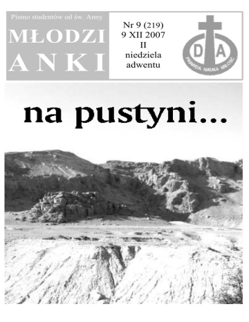Pismo studentów od św. Anny MŁODZI ANKI Nr 9 (219) 9 XII 2007 II niedziela adwentu KOMENTARZ DO NIEDZIELNEJ EWANGELII , 2 ! ! 0 " ) ! ) ' ! 4 & & * # ! + ! ! ' " ! ! # " ) " 2 " Oczywiście, nie ulega wątpliwości, że faryzeusze nie żywili specjalnym szacunkiem odzianego w suknię z sierści wielbłądziej nawiedzonego pustelnika Jana. Dlaczego zatem, wchodzili oni do rzeki Jordan i przyjmowali Chrzest z rąk tego ostatniego proroka Starego Testamentu? Myślę, że kierował nimi ten sam mechanizm, który dzisiaj sprawia, że politycy pojawiają się na uroczystościach kościelnych lub przyjmują Sakrament Małżeństwa po wielu latach życia w konkubinacie. Równocześnie wiadomo, że ci sami politycy nie podążają w swym życiu drogą Prawdy Jezusa. Zarówno oni, jak i faryzeusze za czasów Jezusa, wyzna”, tzn. wali bowiem zasadę: „ jeżeli ogromna większość narodu uczestniczy w obchodach religijnych, to wtedy należy podkreślić swoją jedność z narodem poprzez współuczestniczenie, robienie świętoszkowatych min i gestów. Gdybyśmy mieli odwagę Jana Chrzciciela, powinniśmy wtedy zakrzyknąć: „o plemię żmijowe, dlaczego rujnujecie państwo? dlaczego okradacie obywateli? dlaczego wykorzystujecie niedolę innych, aby ich + & ! ' - / * " . & ( ' " 3 ' ' " ' ! ! % & ' + 2 " 1 ' ! " ! 0 ! & ' 3 " $ # & ! (Mt 3,1-12) poniżać i odbierać im godność? dlaczego kłamiecie, oszukujecie, brukacie najwyższe godności państwowe?!” Myślę jednak, że współczesny Jan Chrzciciel byłby wrogiem wszystkich. I tych, których postępowanie piętnuje i tych o „chrześcijańskich sercach”, którzy natychmiast znaleźliby usprawiedliwienia dla występków innych. Czyżbyśmy zatem byli bezradni wobec zła? Tak, my jesteśmy bezradni, bo gdy na jednym froncie odnosimy zwycięstwo, zło w swojej zuchwałości zdobywa inne przyczółki. Ale oto przychodzi Ten, który „.... 2 3 ! ! # 4 & " Bądźmy zatem pewni, że Dzieciątko Jezus, na którego przyjście przecież czekamy, nie przychodzi, aby śpiewać Mu słodkie, rzewne kolędy. To przychodzi Dowódca Zastępów Anielskich, które czekają na Niego wokół stajenki Betlejemskiej, aby w Jego Imię odnieść ostateczne zwycięstwo nad złem. Drżyj więc plemię żmijowe.... Rafał Bober 5 " ADWENT W TRZECH WYMIARACH Chrześcijanin, Adwent czyli przyjście Chrystusa, powinien przeżywać w trzech wymiarach: Wcielenia Syna Bożego ponad dwa tysiące lat temu, Jego powrotu w chwale na końcu czasów oraz na płaszczyźnie przychodzenia Boga do naszych serc dzisiaj i każdego dnia. Jakie znaczenie ma Adwent Chrystusa dla nas chrześcijan? Przyjście Jezusa ma głęboki sens, dlatego, że to sam „Pan Bóg przychodzi z mocą”, chce spotkać się z człowiekiem, z Tobą. Pragnie wejść do Twojego serca, nadać nowy sens Twojemu życiu, relacjom. Przychodzi i kołacze, czeka na zaproszenie z Twojej strony, na Twoje wyjście Mu naprzeciw. Adwent jest zatem, czasem radosnych przygotowań do spotkania się Boga z człowiekiem. Na czym mają jednak one polegać? Odpowiedź znajduje się w czytaniach mszalnych przeznaczonych na ten okres liturgiczny. Po pierwsze, chodzi tu o czujność. Trzeba być czujnym, aby dostrzec, że Pan nadchodzi. Nie znamy przecież czasu Jego przyjścia, ale wiemy, że jest ono bliskie i że potrzeba, abyśmy byli na nie stale otwarci i gotowi. Być może Jezus właśnie w tej chwili chce się z Tobą spotkać, tu i teraz puka do Twoich drzwi, ale Ty Go nie słyszysz, bo jesteś zbyt zajęty sobą, swoim „ja”. A może nie możesz siebie znieść i uciekasz przed samym sobą? Jezus chce, abyś odnalazł siebie, żebyś zobaczył kim jesteś, dostrzegł Jego pełne miłości spojrzenie i nauczył się patrzeć na siebie Jego oczami. Jezus chce Ci dać miłość, pragnie byś cały czuł się kochany, ze swoim grzechem, słabością. Jezus chce również, abyś i Ty kochał. Na dowód tego przyszedł na ziemię w ciele, stał się jednym z nas. I tu zaczyna się drugi aspekt przygotowywania się do Adwentu: musisz wrócić do siebie, mieć kontakt z samym sobą, zmierzyć się z pustynią Twojej samotności, pokonać górzyste szczyty Twoich zabezpieczeń, ominąć strome zbocza wiodące do grzechu, wyprostować ścieżki Twojego życia; po prostu i przede wszystkim – zaufać Panu. Wtedy usłyszysz pukanie Boga, otworzysz Jezusowi drzwi i pozwolisz Mu się kochać. Adwent zaprasza Cię więc, abyś powrócił do harmonii ze Stwórcą i z samym sobą, żebyś był przygotowany w każdej chwili Twojego życia na spotkanie z Tym, który umiłował Cię miłością odwieczną, na to spotkanie „teraz” i „na końcu czasów”, gdy Chrystus przyjdzie w pełnej chwale. Ewa Wójcicka Na okładce: Pustynia Judzka w okolicach Jerycha Fot. MM 3 Kościół św. Anny ale w Jerozolimie Jerozolima. Nie tak daleko, po wejściu w obręb Starego Miasta przez Bramę Lwów (jedną z siedmiu otwartych bram miasta) znajduje się kościół św. Anny. Bardzo znajome wezwanie tej świątyni, wraz ze wzmiankami w przewodnikach, że jest to najlepiej zachowany kościół z okresu krzyżowców w całej Ziemi Świętej, intryguje mnie i przyciąga. I rzeczywiście, świątynia zbudowana w pięknym i surowym stylu romańskim, zachwyca. Jak wiele kościołów w Ziemi Świętej i ten również stoi pośrodku zadbanego placu i ogrodu – stanowi taką małą oazę. Jego dodatkowym atutem jest także wspaniała akustyka, która zachęca grupy pielgrzymów do głośnego śpiewania swojego hymnu narodowego, bądź innych pieśni. Kościół został zbudowany za czasów panowania krzyżowców około roku 1140. Jako jeden z nielicznych, przetrwał bez większych zmian do naszych czasów, chociaż przez kilka wieków, w okresie panowania władców muzułmańskich, był wykorzystywany jako siedziba islamskiej szkoły, a następnie stał zaniedbany. Dopiero w 1856 roku, na podstawie umów zawartych między Francją, a Turcj