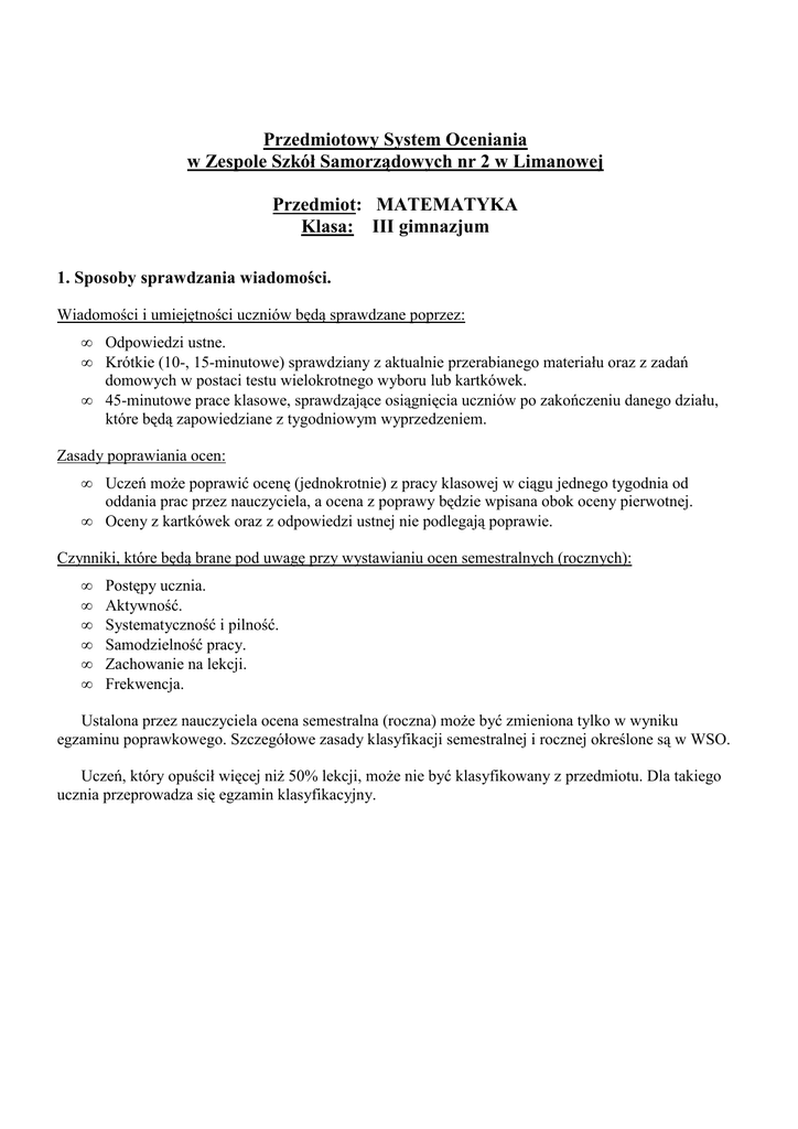 Przedmiotowy System Oceniania w Zespole Szkół Samorządowych nr 2 w Limanowej Przedmiot: MATEMATYKA Klasa: III gimnazjum 1. Sposoby sprawdzania wiadomości. Wiadomości i umiejętności uczniów będą sprawdzane poprzez: • • • Odpowiedzi ustne. Krótkie (10-, 15-minutowe) sprawdziany z aktualnie przerabianego materiału oraz z zadań domowych w postaci testu wielokrotnego wyboru lub kartkówek. 45-minutowe prace klasowe, sprawdzające osiągnięcia uczniów po zakończeniu danego działu, które będą zapowiedziane z tygodniowym wyprzedzeniem. Zasady poprawiania ocen: • • Uczeń moŜe poprawić ocenę (jednokrotnie) z pracy klasowej w ciągu jednego tygodnia od oddania prac przez nauczyciela, a ocena z poprawy będzie wpisana obok oceny pierwotnej. Oceny z kartkówek oraz z odpowiedzi ustnej nie podlegają poprawie. Czynniki, które będą brane pod uwagę przy wystawianiu ocen semestralnych (rocznych): • • • • • • Postępy ucznia. Aktywność. Systematyczność i pilność. Samodzielność pracy. Zachowanie na lekcji. Frekwencja. Ustalona przez nauczyciela ocena semestralna (roczna) moŜe być zmieniona tylko w wyniku egzaminu poprawkowego. Szczegółowe zasady klasyfikacji semestralnej i rocznej określone są w WSO. Uczeń, który opuścił więcej niŜ 50% lekcji, moŜe nie być klasyfikowany z przedmiotu. Dla takiego ucznia przeprowadza się egzamin klasyfikacyjny. 2. Wymagania na oceny. Stopień niedostateczny otrzymuje uczeń, który nie spełnił wymagań na stopień dopuszczający, nie opanował nawet minimum koniecznych wiadomości i umiejętności, co uniemoŜliwia dalsze zdobywanie wiedzy. Nie potrafi rozwiązać elementarnych zadań nawet przy pomocy nauczyciela. Na stopień dopuszczający uczeń: - podaje przykłady zbiorów - zna pojęcie zbioru pustego - zaznacza na osi liczbowej proste przykłady zbiorów liczbowych - wie, co to jest wartość bezwzględna liczby - wykonuje działania w zbiorze liczb R – proste przypadki - potęguje liczby naturalne – proste przypadki - pierwiastkuje liczby naturalne – proste przypadki - nazywa proste wyraŜenia algebraiczne - wyszukuje jednomiany - wie, co to jest suma algebraiczna - oblicza wartość liczbową prostych wyraŜeń algebraicznych - zapisuje proste wyraŜenia algebraiczne - rozróŜnia wyrazy podobne - wskazuje wyrazy sumy algebraicznej - mnoŜy jednomian przez prostą sumę algebraiczną - zna wzory skróconego mnoŜenia - wskazuje liczby niewymierne - redukuje wyrazy podobne w sytuacjach typowych - mnoŜy proste sumy algebraiczne przez siebie - stosuje wzory skróconego mnoŜenia w sytuacjach typowych - rozkłada sumę algebraiczną na czynniki, wyciągając wspólny czynnik przed nawias - zna pojęcia: niewiadoma, równanie, nierówność - zdefiniuje pojęcie równania i nierówności I stopnia z jedną niewiadomą - poda przykłady równań i nierówności I stopnia z jedną niewiadomą - rozumie pojęcia: rozwiązanie równania, rozwiązanie nierówności - rozwiązuje proste równania i nierówności I stopnia z jedną niewiadomą - potrafi sprawdzić, czy dana liczba jest rozwiązaniem równania, nierówności - układa równanie do prostego zadania tekstowego - rozumie pojęcia równań równowaŜnych - potrafi rozwiązywać równania i nierówności I stopnia z jedną niewiadomą - rysuje wykres funkcji liniowej y = ax + b a, b ∈ C , x ∈ R - oblicza miejsce zerowe funkcji y = ax + b a, b ∈ C , x ∈ R - określa monotoniczność funkcji y = ax + b , x ∈ R - oblicza ze wzoru punkty przecięcia się wykresu funkcji z osiami x i y - sprawdza ze wzoru, które z podanych punktów naleŜą do wykresu funkcji - rozróŜnia na podstawie tabelki i prostych zadań tekstowych wielkości wprost i odwrotnie proporcjonalne - zna warunek równoległości prostych - zna terminy: równanie I stopnia z dwiema niewiadomymi, układ równań I stopnia z dwiema niewiadomymi - rozumie pojęcie rozwiązania układu dwóch równań I stopnia z dwiema niewiadomymi - zna rodzaje układów równań ze względu na liczbę rozwiązań - zna metody rozwiązywania układów równań z dwiema niewiadomymi - rozwiązuje metodą podstawiania układ równań – proste przypadki - poda przykłady doświadczeń losowych - wykona doświadczenie losowe np. rzut monetą i wyniki zapisze w tabeli - odczyta dane statystyczne prezentowane w tabeli, na wykresie i na diagramie - zna pojęcie średniej arytmetycznej, mody, mediany i rozstępu - oblicza średnią arytmetyczną, modę, medianę i rozstęp - rozumie pojęcie liczebności - klasyfikuje trójkąty ze względu na boki oraz kąty - oblicza wysokość lub podstawę ze wzoru na pole dowolnego trójkąta - rozróŜnia kąty zewnętrzne i wewnętrzne trójkąta - potrafi obliczyć brakujący kąt w trójkącie - stosuje tw.Pitagorasa do obliczania długości przyprostokątnej i przeciwprostokątnej w trójkącie prostokątnym - potrafi sprawdzić wykonalność konstrukcji np. z nierówności trójkąta - zna własności czworokątów - wskazuje wśród wielokątów, wielokąty wypukłe i wklęsłe - potrafi ze wzorów obliczyć pole lub obwód figur płaskich - oblicza miarę stopniową kąta wpisanego i środkowego opartego na danym łuku - zna podstawowe twierdzenia dotyczące kątów wpisanych i środkowych - potrafi wykreślić sieczną i styczną do okręgu przechodzącą przez punkt leŜący na okręgu - oblicza pole i obwód koła - dzieli konstrukcyjnie odcinek na parzystą liczbę równych części stosując symetralną odcinka - dzieli konstrukcyjnie odcinek na nieparzystą liczbę równych części - rozróŜnia wyrazy stosunku dwóch odcinków - zna odpowiedź na pytanie, czy stosunek długości dwóch odcinków zaleŜy od wyboru jednostki miary tych odcinków - dzieli konstrukcyjnie odcinek w danym stosunku - potrafi sformułować tw.Talesa - wyszuka załoŜenie i tezę w tw.Talesa - wskaŜe na ramionach kąta przeciętych prostymi równoległymi odc