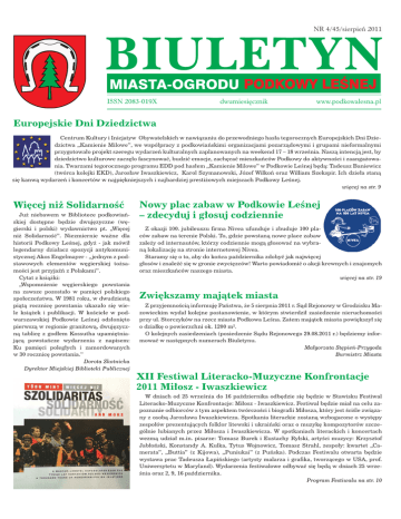 NR 4/45/sierpień 2011 Europejskie Dni Dziedzictwa Centrum Kultury i Inicjatyw Obywatelskich w nawiązaniu do przewodniego hasła tegorocznych Europejskich Dni Dziedzictwa „Kamienie Milowe”, we współpracy z podkowiańskimi organizacjami pozarządowymi i grupami nieformalnymi przygotowało projekt szeregu wydarzeń kulturalnych zaplanowanych na weekend 17 – 18 września. Naszą intencją jest, by dziedzictwo kulturowe zaczęło fascynować, budzić emocje, zachęcać mieszkańców Podkowy do aktywności i zaangażowania. Twarzami tegorocznego programu EDD pod hasłem „Kamienie Milowe” w Podkowie Leśnej będą: Tadeusz Baniewicz (twórca kolejki EKD), Jarosław Iwaszkiewicz, Karol Szymanowski, Józef Wilkoń oraz William Szekspir. Ich dzieła staną się kanwą wydarzeń i koncertów w najpiękniejszych i najbardziej prestiżowych miejscach Podkowy Leśnej. więcej na str. 9 Więcej niż Solidarność Już niebawem w Bibliotece podkowiańskiej dostępne będzie dwujęzyczne (węgierski i polski) wydawnictwo pt. „Więcej niż Solidarność”. Niezmiernie ważne dla historii Podkowy Leśnej, gdyż - jak mówił legendarny działacz opozycji antykomunistycznej Akos Engelmayer - „jednym z podstawowych elementów węgierskiej tożsamości jest przyjaźń z Polakami”. Cytat z książki: „Wspomnienie węgierskiego powstania na zawsze pozostało w pamięci polskiego społeczeństwa. W 1981 roku, w dwudziestą piątą rocznicę powstania ukazało się wiele książek i publikacji. W kościele w podwarszawskiej Podkowie Leśnej odsłonięto pierwszą w regionie granitową, dwujęzyczną tablicę z godłem Kossutha upamiętniającą powstańcze wydarzenia z napisem: Ku pamięci poległych i zamordowanych w 30 rocznicę powstania.” Dorota Skotnicka Dyrektor Miejskiej Biblioteki Publicznej Nowy plac zabaw w Podkowie Leśnej – zdecyduj i głosuj codziennie Z okazji 100. jubileuszu firma Nivea ufunduje i zbuduje 100 placów zabaw na terenie Polski. To, gdzie powstaną nowe place zabaw zależy od internautów, którzy codziennie mogą głosować na wybraną lokalizację na stronie internetowej Nivea. Staramy się o to, aby do końca października zdobyć jak najwięcej głosów i znaleźć się w gronie zwycięzców! Warto powiadomić o akcji krewnych i znajomych oraz mieszkańców naszego miasta. więcej na str. 19 Zwiększamy majątek miasta Z przyjemnością informuję Państwa, że 5 sierpnia 2011 r. Sąd Rejonowy w Grodzisku Mazowieckim wydał kolejne postanowienie, w którym stwierdził zasiedzenie nieruchomości przy ul. Storczyków na rzecz miasta Podkowa Leśna. Zatem majątek miasta powiększył się o działkę o powierzchni ok. 1200 m². O kolejnych zasiedzeniach (posiedzenie Sądu Rejonowego 29.08.2011 r.) będziemy informować w następnych numerach Biuletynu. Małgorzata Stępień-Przygoda Burmistrz Miasta XII Festiwal Literacko-Muzyczne Konfrontacje 2011 Miłosz - Iwaszkiewicz W dniach od 25 września do 16 października odbędzie się będzie w Stawisku Festiwal Literacko-Muzyczne Konfrontacje: Miłosz - Iwaszkiewicz. Festiwal będzie miał na celu zapoznanie odbiorców z tym aspektem twórczości i biografii Miłosza, który jest ściśle związany z osobą Jarosława Iwaszkiewicza. Spotkania literackie zostaną wzbogacone o występy zespołów prezentujących folklor litewski i ukraiński oraz o muzykę kompozytorów szczególnie lubianych przez Miłosza i Iwaszkiewicza. W spotkaniach literackich i koncertach wezmą udział m.in. pisarze: Tomasz Burek i Eustachy Rylski, artyści muzycy: Krzysztof Jabłoński, Konstandy A. Kulka, Tytus Wojnowicz, Tomasz Strahl, zespoły: kwartet „Camerata”, „Buttia” (z Kijowa), „Puniukai” (z Puńska). Podczas Festiwalu otwarta będzie wystawa prac Tadeusza Łapińskiego (artysty malarza i grafika, tworzącego w USA, prof. Uniwersytetu w Maryland). Wydarzenia festiwalowe odbywać się będą w dniach 25 września oraz 2, 9, 16 października. Program F P Festiwalu ti l na str. t 10 www.podkowalesna.pl 1 Wieści z Urzędu Rozmowa z Elżbietą Mieszkowską, dyrektorem Zespołu Szkół Samorządowych w Podkowie Leśnej Spotykamy się pod koniec wakacji, rozpoczyna się nowy rok szkolny. Przed uczniami i nauczycielami 10 miesięcy pracy. W tym roku nietypowo rozpoczniemy nowy rok szkolny: nie 1 wrzeElżbieta Mieszkowska śnia, który wypadyrektor Zespołu Szkół Samorządowych da w środę, lecz 5 września, w poniedziałek. Decyzję taką podjęłam w oparciu o przepisy prawa oświatowego, które zezwalają z ważnych powodów organizacyjnych na taką zmianę. Po uzyskaniu zgody pani Burmistrz, uzyskaniu pozytywnej opinii Rady Szkoły, a przedtem po konsultacji z wykonawcą robót budowlanych na terenie szkoły, zostawiamy sobie kilkudniową rezerwę czasową na przygotowanie szkoły do rozpoczęcia zajęć, szczególnie w tej części, gdzie trwają w wakacje duże prace remontowe. Uczniowie mają zatem nieco dłuższe wakacje, a nauczyciele wykorzystają ten czas na przygotowane szkolenie. Ilu uczniów rozpocznie naukę w nowym roku szkolnym? W nowym roku szkolnym naukę rozpocznie w szkole podstawowej 289 uczniów, a w gimnazjum 152 uczniów, co daje ogólną liczbę 441 w całym Zespole Szkół. Utworzo- no 18 oddziałów klasowych, tak jak do tej pory, po 2 klasy na każdym poziomie. W szkole uczą się także dzieci uchodźców z ośrodka w Dębaku. Czy udaje się pokonać przeszkody, które niewątpliwie istnieją, chociażby nieznajomość języka? Obecnie uczy się w całym Zespole Szkół 25 takich dzieci, przy czym większa część w szkole podstawowej (19 osób), natomiast w gimnazjum mamy 5 takich uczniów. Uczniowie ci pochodzą z Czeczenii, Gruzji, Kazachstanu, ale według najświeższych informacji do ośrodka w Dębaku dotarła nowa grupa z Afryki i najprawdopodobniej będą też uczniami naszej szkoły. Po wielu już latach pracy z cudzoziemcami, poszukiwania rozwiązań dydaktycznych, organizacyjnych,