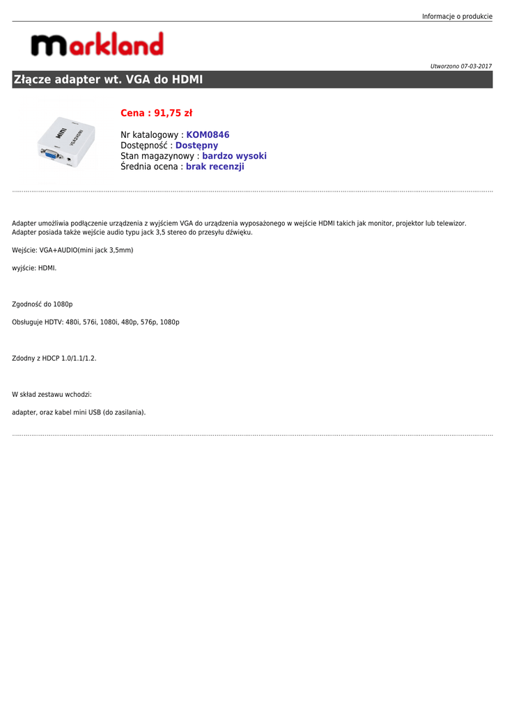 Informacje o produkcie Utworzono 07-03-2017 Złącze adapter wt. VGA do HDMI Cena : 91,75 zł Nr katalogowy : KOM0846 Dostępność : Dostępny Stan magazynowy : bardzo wysoki Średnia ocena : brak recenzji Adapter umożliwia podłączenie urządzenia z wyjściem VGA do urządzenia wyposażonego w wejście HDMI takich jak monitor, projektor lub telewizor. Adapter posiada także wejście audio typu jack 3,5 stereo do przesyłu dźwięku. Wejście: VGA+AUDIO(mini jack 3,5mm) wyjście: HDMI. Zgodność do 1080p Obsługuje HDTV: 480i, 576i, 1080i, 480p, 576p, 1080p Zdodny z HDCP 1.0/1.1/1.2. W skład zestawu wchodzi: adapter, oraz kabel mini USB (do zasilania).