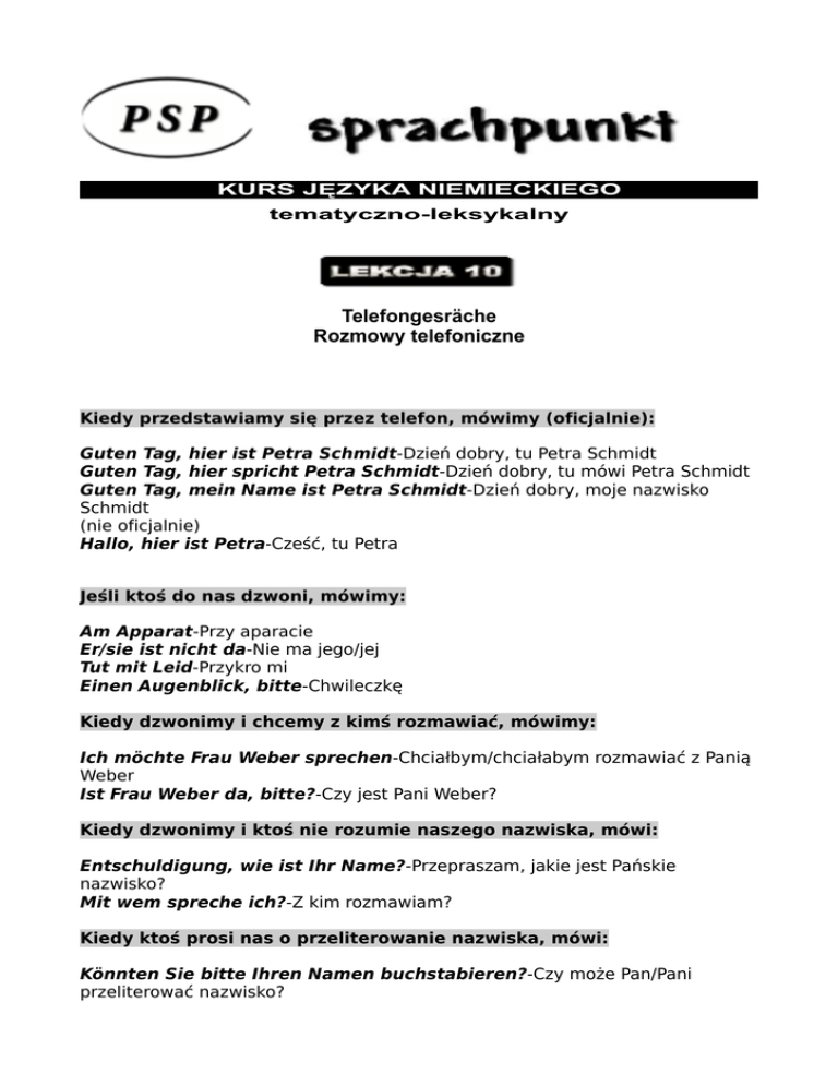 KURS JĘZYKA NIEMIECKIEGO tematyczno-leksykalny Telefongesräche Rozmowy telefoniczne Kiedy przedstawiamy się przez telefon, mówimy (oficjalnie): Guten Tag, hier ist Petra Schmidt-Dzień dobry, tu Petra Schmidt Guten Tag, hier spricht Petra Schmidt-Dzień dobry, tu mówi Petra Schmidt Guten Tag, mein Name ist Petra Schmidt-Dzień dobry, moje nazwisko Schmidt (nie oficjalnie) Hallo, hier ist Petra-Cześć, tu Petra Jeśli ktoś do nas dzwoni, mówimy: Am Apparat-Przy aparacie Er/sie ist nicht da-Nie ma jego/jej Tut mit Leid-Przykro mi Einen Augenblick, bitte-Chwileczkę Kiedy dzwonimy i chcemy z kimś rozmawiać, mówimy: Ich möchte Frau Weber sprechen-Chciałbym/chciałabym rozmawiać z Panią Weber Ist Frau Weber da, bitte?-Czy jest Pani Weber? Kiedy dzwonimy i ktoś nie rozumie naszego nazwiska, mówi: Entschuldigung, wie ist Ihr Name?-Przepraszam, jakie jest Pańskie nazwisko? Mit wem spreche ich?-Z kim rozmawiam? Kiedy ktoś prosi nas o przeliterowanie nazwiska, mówi: Könnten Sie bitte Ihren Namen buchstabieren?-Czy może Pan/Pani przeliterować nazwisko? Jak żegnamy się przez telefon? Auf Wiederhören-Do usłyszenia (oficjalnie) Tschüss-Cześć (nie oficjalnie) ZADANIA Zadanie/Aufgabe 1 Które z pytań pasuje do odpowiedzi: Ist Herr Schmidt da? 1.Ich möchte Frau Schmidt sprechen 2.Einen Augenblick, bitte 3.Tut mit Leid 4.Am Apparat Zadanie/Aufgabe 2 Jak przedstawimy się przez telefon? 1.Er ist nicht da 2.Am Apparat 3.Guten Tag, mein Name ist Weber Zadanie/Aufgabe 3 Jak pożegnamy się oficjalnie przez telefon? 1.Guten Tag 2.Auf Wiederhören 3.Tschüss Zadanie/Aufgabe 4 Jak poprosić panią Weber do telefonu? 1.Könnten Sie bitte Ihren Namen buchstabieren? 2.Ist Frau Weber da, bitte? 3.Guten Tag, hier spricht Monika Weber Zadanie/Aufgabe 5 Jak zareagujemy jeśli nie rozumiemy nazwiska rozmówcy? 1.Ist Frau Weber da, bitte? 2.Entschuldigung, wie ist Ihr Name? 3.Hallo, hier ist Petra. KLUCZ 12345- 2,4 3 2 2 2 Warsztaty języka niemieckiego Wszystkich zainteresowanych lekcją zapraszamy do pogłębienia materiału na bezpłatnych warsztatach języka niemieckiego w PSP Sprachpunkt PSP Sprachpunkt Skalitzer Str. 43 10997 Berlin Tel.030 69 56 77 08 www.psp-sprachpunkt.de Lekcja może być kopiowana i rozpowszechniana wyłącznie w celach niekomercyjnych. Wykorzystanie w innym celu wymaga zgody PSP Sprachpunkt Copyright © 2007 PSP Sprachpunkt