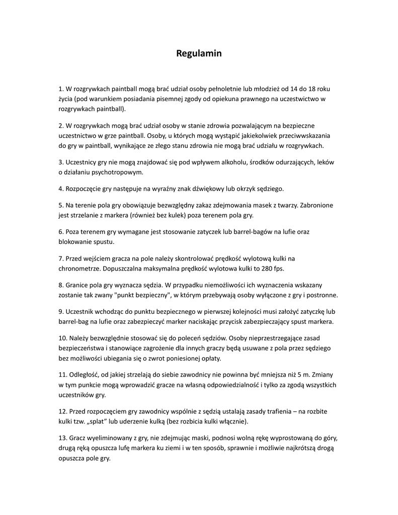 Regulamin 1. W rozgrywkach paintball mogą brać udział osoby pełnoletnie lub młodzież od 14 do 18 roku życia (pod warunkiem posiadania pisemnej zgody od opiekuna prawnego na uczestwictwo w rozgrywkach paintball). 2. W rozgrywkach mogą brać udział osoby w stanie zdrowia pozwalającym na bezpieczne uczestnictwo w grze paintball. Osoby, u których mogą wystąpić jakiekolwiek przeciwwskazania do gry w paintball, wynikające ze złego stanu zdrowia nie mogą brać udziału w rozgrywkach. 3. Uczestnicy gry nie mogą znajdować się pod wpływem alkoholu, środków odurzających, leków o działaniu psychotropowym. 4. Rozpoczęcie gry następuje na wyraźny znak dźwiękowy lub okrzyk sędziego. 5. Na terenie pola gry obowiązuje bezwzględny zakaz zdejmowania masek z twarzy. Zabronione jest strzelanie z markera (również bez kulek) poza terenem pola gry. 6. Poza terenem gry wymagane jest stosowanie zatyczek lub barrel-bagów na lufie oraz blokowanie spustu. 7. Przed wejściem gracza na pole należy skontrolować prędkość wylotową kulki na chronometrze. Dopuszczalna maksymalna prędkość wylotowa kulki to 280 fps. 8. Granice pola gry wyznacza sędzia. W przypadku niemożliwości ich wyznaczenia wskazany zostanie tak zwany "punkt bezpieczny", w którym przebywają osoby wyłączone z gry i postronne. 9. Uczestnik wchodząc do punktu bezpiecznego w pierwszej kolejności musi założyć zatyczkę lub barrel-bag na lufie oraz zabezpieczyć marker naciskając przycisk zabezpieczający spust markera. 10. Należy bezwzględnie stosować się do poleceń sędziów. Osoby nieprzestrzegające zasad bezpieczeństwa i stanowiące zagrożenie dla innych graczy będą usuwane z pola przez sędziego bez możliwości ubiegania się o zwrot poniesionej opłaty. 11. Odległość, od jakiej strzelają do siebie zawodnicy nie powinna być mniejsza niż 5 m. Zmiany w tym punkcie mogą wprowadzić gracze na własną odpowiedzialność i tylko za zgodą wszystkich uczestników gry. 12. Przed rozpoczęciem gry zawodnicy wspólnie z sędzią ustalają zasady trafienia – na rozbite kulki tzw. „splat” lub uderzenie kulką (bez rozbicia kulki włącznie). 13. Gracz wyeliminowany z gry, nie zdejmując maski, podnosi wolną rękę wyprostowaną do góry, drugą ręką opuszcza lufę markera ku ziemi i w ten sposób, sprawnie i możliwie najkrótszą drogą opuszcza pole gry. 14. W przypadku stwierdzenia jakiejkolwiek niesprawności markera należy przerwać grę i zwrócić się o pomoc do obsługi. 15. Zabrania się samowolnego demontowania, regulowania i ulepszania broni, a także uzupełniania magazynków kulkami, które leżały na ziemi. 16. Nie wolno celować ani strzelać do graczy wyeliminowanych, osób postronnych, sędziów, fotografów i zwierząt. 17. Należy przerwać grę w przypadku pojawienia się osób postronnych na terenie pola gry. 18. Zabrania się wchodzenia do obszarów oznaczonych taśmą ostrzegawczą. 19. Podczas gry obowiązuje zakaz używania słów wulgarnych, przemocy, i innego rodzaju przekazu obrażającego zawodnika z przeciwnej oraz własnej drużyny. 20. W przypadku uszkodzenia wypożyczanego sprzętu, wynikłego z niewłaściwego użytkowania lub świadomego, umyślnego uszkodzenia, stosuje się odpowiedzialność materialną uczestnika gry. 21. Na terenie pola gry jak i na terenie przyległym obowiązuje bezwzględny zakaz pozostawiania śmieci i butelek. Oświadczam, iż zapoznałem się z regulaminem. Fakt ten poświadczam własnoręcznym podpisem: 1. 2. 3. 4. 5. 6. 7. 8. 9. 10. 11. 12. 13. 14. 15. 16. 17. 18. 19. 20. 21. 22. 23. 24. 25. 26. 27. 28. 29. 30. 31. 32. 33. 34. 35. 36. 37. 38. 39. 40.