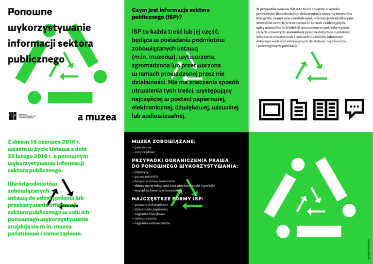 wykorzystywanie informacji sektora publicznego a muzea Z dniem 16 czerwca 2016 r. weszła w życie Ustawa z dnia 25 lutego 2016 r. o ponownym wykorzystywaniu informacji sektora publicznego. Wśród podmiotów zobowiązanych ustawą do udostępniania lub przekazywania informacji sektora publicznego w celu ich ponownego wykorzystywania znajdują się m.in. muzea państwowe i samorządowe. ISP to każda treść lub jej część, będąca w posiadaniu podmiotów zobowiązanych ustawą (m.in. muzeów), wytworzona, zgromadzona lub przetworzona w ramach prowadzonej przez nie działalności. Nie ma znaczenia sposób utrwalenia tych treści, występujący najczęściej w postaci papierowej, elektronicznej, dźwiękowej, wizualnej lub audiowizualnej. W przypadku muzeów ISP są to treści powstałe w wyniku prowadzonej działalności np. dokumentacja wizualna muzealiów (fotografie, skany) wraz z metadanymi, informacje identyfikacyjne muzealiów zawarte w inwentarzach i kartach ewidencyjnych, opisy muzealiów i ich kolekcji sporządzone na potrzeby wystaw stałych i czasowych, komunikaty prasowe dotyczące muzealiów, informacje o wartościach i treściach muzealiów, informacje dotyczące wydarzeń edukacyjnych, działalności wydawniczej i poszczególnych publikacji. M U Z E A ZO B O W I Ą ZA N E : ——państwowe ——samorządowe P R Z Y PA D K I O G R A N I C Z E N I A PR A W A D O P O N O W N E GO W Y KO R ZYST Y W A N I A : ——depozyty ——prawa autorskie ——bezpieczeństwo muzealiów ——zbiory martyrologiczne oraz urzędowe znaki i symbole ——wzgląd na kwestie własnościowe N A J CZ Ę STS ZE F O R M Y I S P: ——postacie elektroniczne ——dokumenty papierowe ——nagrania dźwiękowe ——odwzorowania ——nagrania audiowizualne projekt Podpunkt Ponowne Czym jest informacja sektora publicznego (ISP)? Czym jest ponowne wykorzystywanie informacji sektora publicznego (tzw. re-use)? To wykorzystywanie ISP przez osoby fizyczne, osoby prawne oraz jednostki organizacyjne nieposiadające osobowości prawnej, w celach komercyjnych lub niekomercyjnych innych niż pierwotny publiczny cel, dla którego informacja została wytworzona. Muzea wśród podmiotów zobowiązanych ustawą W dotychczasowym stanie prawnym muzea nie były zobligowane do udostępniania lub przekazywania ISP w celu ich ponownego wykorzystywania. Obecnie na muzea państwowe i samorządowe (w rozumieniu ustawy o muzeach), a także na biblioteki publiczne oraz archiwa państwowe ustawodawca nałożył taki obowiązek, tym samym katalog treści udostępnianych w celu ponownego wykorzystywania poszerzył się m.in. o zasoby będące w posiadaniu muzeów. Muzea nie są zobowiązane do tworzenia ISP, ich przetwarzania w sposób lub formie wskazanych we wniosku oraz sporządzania z nich wyciągów, jeżeli spowoduje to konieczność podjęcia nieproporcjonalnych działań przekraczających proste czynności. Ustawa nie nakłada na muzea obowiązku digitalizacji zasobów, a jedynie obowiązek udostępnienia wytworzonej już treści (w takiej formie, jaka istnieje w chwili realizacji wniosku), czyli udostępnienia tego, co już wcześniej zostało zdigitalizowane. Na jakich zasadach następuje udostępnianie lub przekazywanie ISP? Czy za udostępnione informacje można pobierać opłaty? Udostępnianie lub przekazywanie ISP w celu ponownego wykorzystywania następuje w systemie teleinformatycznym lub na wniosek o ponowne wykorzystywanie. Generalna zasada stanowi, że udostępnianie i przekazywanie ISP odbywa się bezpłatnie. Opłatę można nałożyć, jeżeli przygotowanie lub przekazanie informacji w sposób lub formie wskazanych we wniosku wymaga poniesienia dodatkowych kosztów. Wysokość opłaty nie może przekroczyć kosztów poniesionych bezpośrednio w celu przygotowania lub przekazania informacji w określony sposób i w określonej formie. UDOSTĘPN IA N IE W SYSTEMI E TE LEINFORMAT YC Z N Y M —— na stronie podmiotowej Biuletynu Informacji Publicznej —— w centralnym repozytorium informacji publicznej —— jeżeli udostępnienie następuje w sposób inny niż poprzez BIP lub centralne repozytorium (np. na stronie internetowej muzeum), wraz z udostępnionym materiałem zamieszcza się informacje o warunkach wykorzystywania i wysokości opłat lub o ich braku. PRZEKAZYW AN IE N A WN IO S E K O PONOWN E WYKORZ YSTYW A N I E ——jeżeli informacja nie została udostępniona w BIP, centralnym repozytorium lub w inny sposób ——została udostępniona w inny sposób, a nie zostały określone warunki wykorzystywania lub opłaty albo nie poinformowano o ich braku ——będzie wykorzystywana na innych warunkach, niż zostały określone Udostępnienie ISP przez muzea w celach innych niż niekomercyjne o charakterze badawczym, naukowym lub edukacyjnym, może odbywać się na zasadach odpłatności. Opłaty takie mogą uwzględniać nie tylko koszty bezpośrednie (związane z nadaniem formy oraz przekazaniem informacji), ale również koszty gromadzenia, produkowania, reprodukowania, rozpowszechniania, ochrony i ustalania praw, wraz z rozsądnym zwrotem z inwestycji. Maksymalne stawki opłat określa Rozporządzenie Ministra Kultury i Dziedzictwa Narodowego z dnia 5 lipca 2016 r. w sprawie stawek opłat za ponowne wykorzystywanie informacji sektora publicznego nakładanych przez muzea państwowe i samorządowe, muzea mogą jednak pobierać opłaty o niższej wysokości albo odstąpić od ich pobierania. Czy muzea mogą odmówić udostępnienia informacji? Zgodnie z przyjętymi regulacjami prawnymi, muzea co do zasady nie mogą odmówić udostępnienia ISP, ustawodawca przewidział jednak sytuacje, w których muzeum odmawia wyrażenia zgody na udostępnienie lub przekazanie ISP w celu ponownego wykorzystywania. Prawo do ponownego wykorzystywania podlega ograniczeniu w następujących obszarach: D E PO Z Y T Y ——jeżeli ISP powiązane są z depozytami znajdującymi się w posiadaniu muzeum, o ile